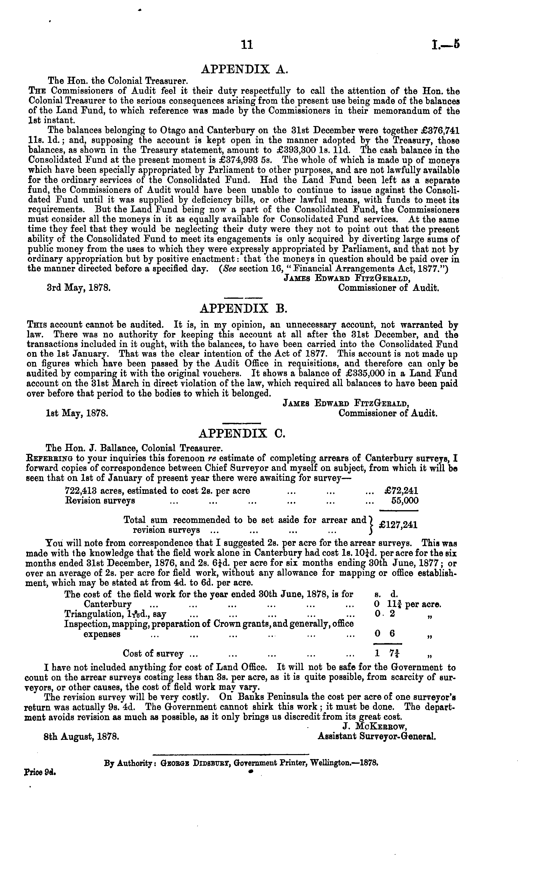 APPENDIX B. This account cannot be audited. It is, in my opinion, an unnecessary account, not warranted by law. There was no authority for keeping this account at all after the 31st December, and the transactions included in it ought, with the balances, to have been carried into the Consolidated Fund on the Ist January. That was the clear intention of the Act of 1877. This account is not made up on figures which have been passed by the Audit Office in requisitions, and therefore can only be audited by comparing it with the original vouchers. It shows a balance of £335,000 in a Land Fund account on the 31st March in direct violation of the law, which required all balances to have been paid over before that period to the bodies to which it belonged. James Edward Fitz Gerald, Ist May, 1878. Commissioner of Audit.