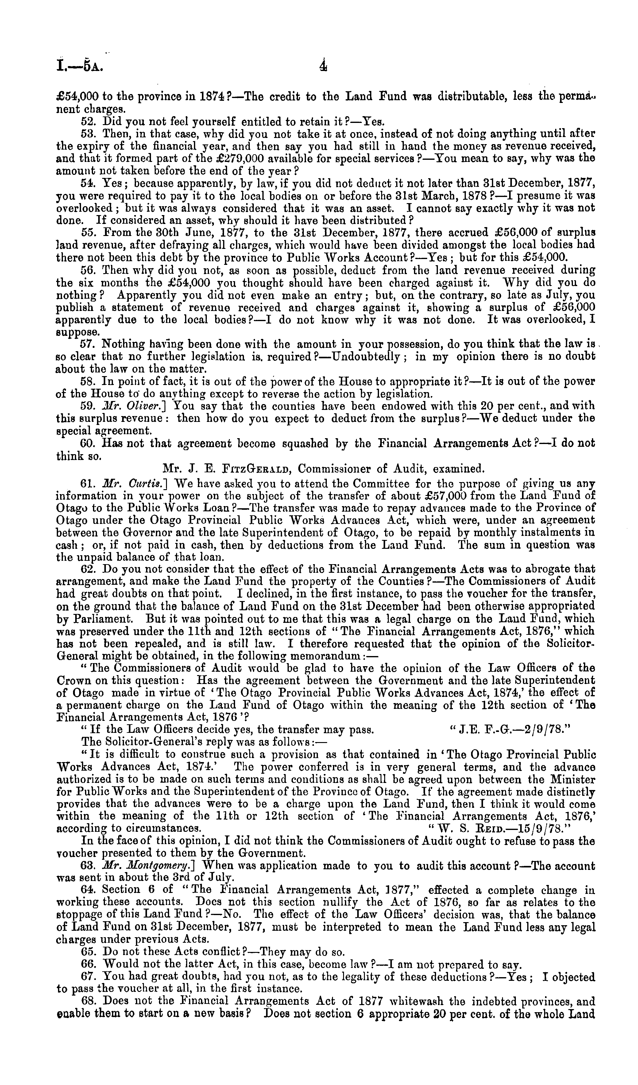 £54,000 to the province in 1874 ?—The credit to the Laud Fund was distributable, less the permanent charges. 52. Did you not feel yourself entitled to retain it ?—Yes. 53. Then, in that case, why did you not take it at onco, instead of not doing anything until after the expiry of the financial year, and then say you had still in hand the money as revenue received, and that it formed part of the £279,000 available for special services ?—You mean to say, why was the amount not taken before the end of the year? 54. Yes; because apparently, by law, if you did not deduct it not later than 31st December, 1877, you were required to pay it to the local bodies on or before the 31st March, 1878 ? —I presume it was overlooked ; but it was always considered that it was an asset. I cannot say exactly why it was not done. If considered an asset, why should it have been distributed? 55. From the 30th June, 1877, to the 31st December, 1877, there accrued £50,000 of surplus land revenue, after defraying all charges, which would have been divided amongst the local bodies had there not been this debt by the province to Public Works Account ?—Yes ; but for this £54,000. 56. Then why did you not, as soon as possible, deduct from the land revenue received during the six months the £54,000 you thought should have been charged against it. Why did you do nothing ? Apparently you did. not even make an entry; but, on the contrary, so late as July, you publish a statement of revenue received and charges against it, showing a surplus of £56,000 apparently due to the local bodies ?—I do not know why it was not done. It was overlooked, I suppose. 57. Nothing having been done with the amount in your possession, do you think that the law is so clear that no further legislation is. required ?—Undoubtedly ; in my opinion there is no doubt about the law on the matter. 58. In point of fact, it is out of the power of the House to appropriate it? —It is out of the power of the House to do anything except to reverse the action by legislation. 59. Mr, Oliver.] You say that the counties have been endowed witli this 20 per cent., and with this surplus revenue : then how do you expect to deduct from the surplus ? —We deduct under the special agreement. 60. Has not that agreement become squashed by the Financial Arrangements Act ?—I do not think so. Mr. J. E. FitzGehald, Commissioner of Audit, examined. 61. Mr. Curtis.] We have asked you to attend the Committee for the purpose of giving us any information in your power on the subject of the transfer of about £57,000 from the Land Fund of Otago to the Public Works Loan?—The transfer was made to repay advances made to the Province of Otago under the Otago Provincial Public Works Advances Act, which were, under an agreement between the Governor and the late Superintendent of Otago, to be repaid by monthly instalments in cash ; or, if not paid in cash, then by deductions from the Laud Fund. The sum in question was the unpaid balance of that loan. 62. Do you not consider that the effect of the Financial Arrangements Acts was to abrogate that arrangement, and make the Land Fund the property of the Counties ?—The Commissioners of Audit had great doubts on that point. I declined, in the first instance, to pass the voucher for the transfer, on the ground that the balance of Laud Fund on the 31st December had been otherwise appropriated by Parliament. But it was pointed out to me that this was a legal charge on the Laud Fund, which was preserved under the 11th and 12th sections of "The Financial Arrangements Act, 1876," which has not been repealed, and is still law. I therefore requested that the opinion of the SolicitorGeneral might be obtained, in the following memorandum: — " The Commissioners of Audit would be glad to have the opinion of the Law Officers of the Crown on this question: Has the agreement between the Government and the late Superintendent of Otago made in virtue of 'The Otago Provincial Public Works Advances Act, 1874,' the effect of a permanent charge on the Land Fund of Otago within the meaning of the 12th section of ' The Financial Arrangements Act, 1876 '? " If the Law Officers decide yes, the transfer may pass. " J.E. F.-G.—2/9/78." The Solicitor-General's reply was as follows: — "It is difficult to construe such a provision as that contained in 'The Otago Provincial Public Works Advances Act, 1874.' The power conferred is in very general terms, and the advance authorized is to be made on such terms and conditions as shall be agreed upon between the Minister for Public Works and the Superintendent of the Province of Otago. If the agreement made distinctly provides that the advances were to be a charge upon the Land Fund, then I think it would come within the meaning of the 11th or 12th section of ' The Financial Arrangements Act, 1876,' according to circumstances. " W. S. Beid.—15/9/78." In the face of this opinion, I did not think the Commissioners of Audit ought to refuse to pass the voucher presented to them by the Government. 63. Mr. Montgomery.] When was application made to you to audit this account ?—The account was sent in about the 3rd of July. 64. Section 6 of "The Financial Arrangements Act, 1877," effected a complete change in working these accounts. Docs not this section nullify the Act of 1876, so far as relates to the stoppage of this Land Fund ?—No. The effect of the Law Officers' decision was, that the balance of Land Fund on 31st December, 1877, must be interpreted to mean the Land Fund less any legal charges under previous Acts. 65. Do not these Acts conflict? —They may do so. 66. Would not the latter Act, in this case, become law ? —I am not prepared to say. 67. You had great doubts, had you not, as to the legality of these deductions?—Yes ; I objected to pass the voucher at all, in the first instance. 68. Does not the Financial Arrangements Act of 1877 whitewash the indebted provinces, and enable them