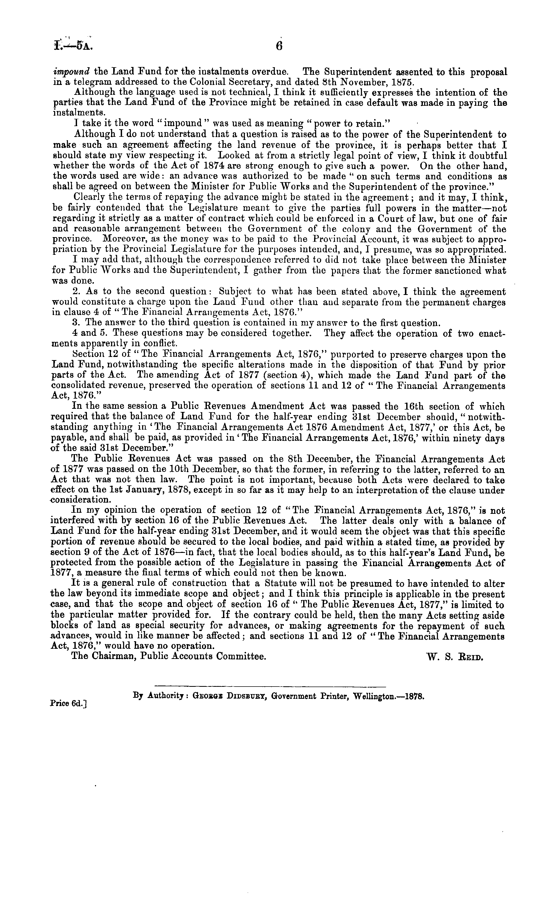 impound the Land Fund for the instalments overdue. The Superintendent assented to this proposal in a telegram addressed to the Colonial Secretary, and dated 8th November, 1875. Although the language used is not technical, I think it sufficiently expresses the intention of the parties that the Land Fund of the Province might be retained in case default was made in paying the instalments. I take it the word "impound " was used as meaning " power to retain." Although I do not understand that a question is raised as to the power of the Superintendent to make such an agreement affecting the land revenue of the province, it is perhaps better that I should state my view respecting it. Looked at from a strictly legal point of view, I think it doubtful whether the words of the Act of 1874 are strong enough to give such a power. On the other hand, the words used are wide: an advance was authorized to be made " on such terms and conditions as shall be agreed on between the Minister for Public Works and the Superintendent of the province." Clearly the terms of repaying the advance might bo stated in the agreement; and it may, I think, be fairly contended that the Legislature meant to give the parties full powers in the matter —not regarding it strictly as a matter of contract which could be enforced in a Court of law, but one of fair and reasonable arrangement between the Government of the colony and the Government of the province. Moreover, as the money was to be paid to the Provincial Account, it was subject to appropriation by the Provincial Legislature for the purposes intended, and, I presume, was so appropriated. T may add that, although the correspondence referred to did not take place between the Minister for Public Works and the Superintendent, I gather from the papers that the former sanctioned what was done. 2. As to the second question : Subject to what has been stated above, I think the agreement would constitute a charge upon the Laud Fund other than and separate from the permanent charges in clause 4 of " The Financial Arrangements Act, 1876." 3. The answer to the third question is contained in my answer to the first question. 4 and 5. These questions may be considered together. They affect the operation of two enactments apparently in conflict. Section 12 of " The Financial Arrangements Act, 1876," purported to preserve charges upon the Land Fund, notwithstanding the specific alterations made in the disposition of that Fund by prior parts of the Act. The amending Act of 1877 (section 4), which made the Land Fund part of the consolidated revenue, preserved the operation of sections 11 and 12 of " The Financial Arrangements Act, 1876." In the same session a Public Revenues Amendment Act was passed the 16th section of which required that the balance of Land Fund for the half-year ending 31st December should, " notwithstanding anything in 'The Financial Arrangements Act 1876 Amendment Act, 1877,' or this Act, be payable, and shall be paid, as provided in ' The Financial Arrangements Act, 1876,' within ninety days of the said 31st December." The Public Eevenues Act was passed on the 8th December, the Financial Arrangements Act of 1877 was passed on the 10th December, so that the former, in referring to the latter, referred to an Act that was not then law. The point is not important, because both Acts were declared to take effect on the 1st January, 1878, except in so far as it may help to an interpretation of the clause under consideration. In my opinion the operation of section 12 of " The Financial Arrangements Act, 1S76," is not interfered with by section 16 of the Public Eevenues Act. The latter deals only with a balance of Land Fund for the half-year ending 31st December, and it would seem the object was that this specific portion of revenue should be secured to the local bodies, and paid within a stated time, as provided by section 9 of the Act of 1876 —in fact, that the local bodies should, as to this half-year's Land Fund, be protected from the possible action of the Legislature in passing the Financial Arrangements Act of 1877, a measure the final terms of which could not then be known. It is a general rule of construction that a Statute will not be presumed to have intended to alter the law beyond its immediate scope and object; and I think this principle is applicable in the present case, and that the scope and object of section 16 of " The Public Eevenues Act, 1877," is limited to the particular matter provided for. If the contrary could be held, then the many Acts setting aside blocks of land as special security for advances, or making agreements for the repayment of such advances, would in like manner be affected; and sections 11 and 12 of " The Financial Arrangements Act, 1876," would have no operation. The Chairman, Public Accounts Committee. W. S. Reid. By Authority i Geobgb Didsbuet, Government Printer, Wellington.—1878. Price 6d.]