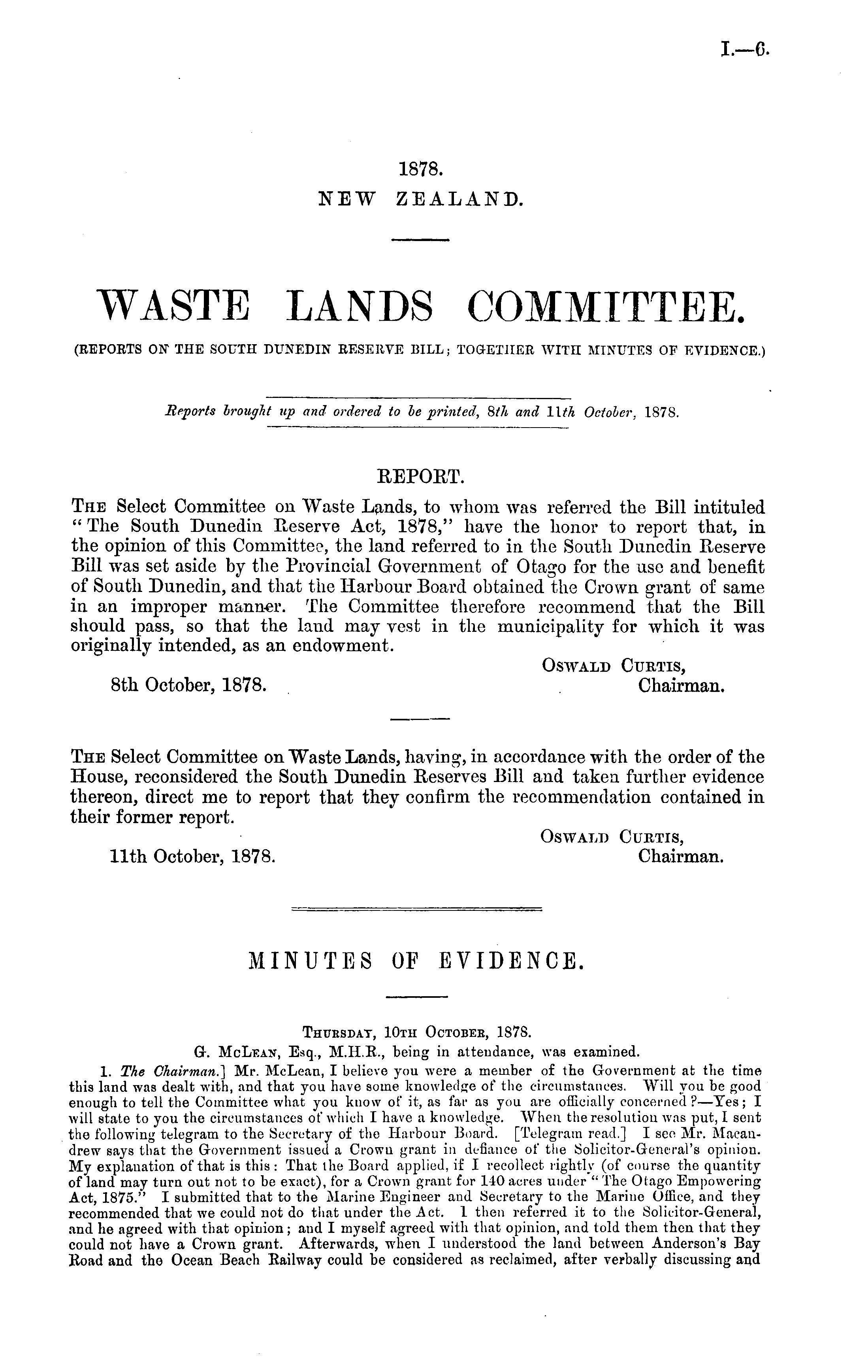 MINUTES OF EVIDENCE. Thursday, 10th October, 1878. G. McLean, Esq., M.H.R., being in attendance, was examined. 1. The Chairman.] Mr. McLean, I believe you were a member of the Government at the time this land was dealt with, and that you have some knowledge of the circumstances. Will you be good enough to tell the Committee what you know of it, as far as you are officially concerned?—Tes; I will state to you the circumstances of which I have a knowledge. AVhen the resolution was put, I sent tho following telegram to the Secretary of tho Harbour Board. [Telegram read.] I see Mr. Macaudrew says that the Government issued a Crowu grant in defiance of the Solicitor-General's opinion. My explanation of that is this : That the Board applied, if I recollect rightly (of course the quantity of land may turn out not to bo exact), for a Crown grant for 140 acres under " The Otago Empowering Act, 1875." I submitted that to the Marine Engineer and Secretary to the Marino Office, and they recommended that we could not do that under the Act. 1 then referred it to the Solicitor-General, and he agreed with that opinion; and I myself agreed with that opinion, and told them then that they could not have a Crown grant. Afterwards, when I understood the land between Anderson's Bay Road and tho Ocean Beach Railway could be considered as reclaimed, after verbally discussing and