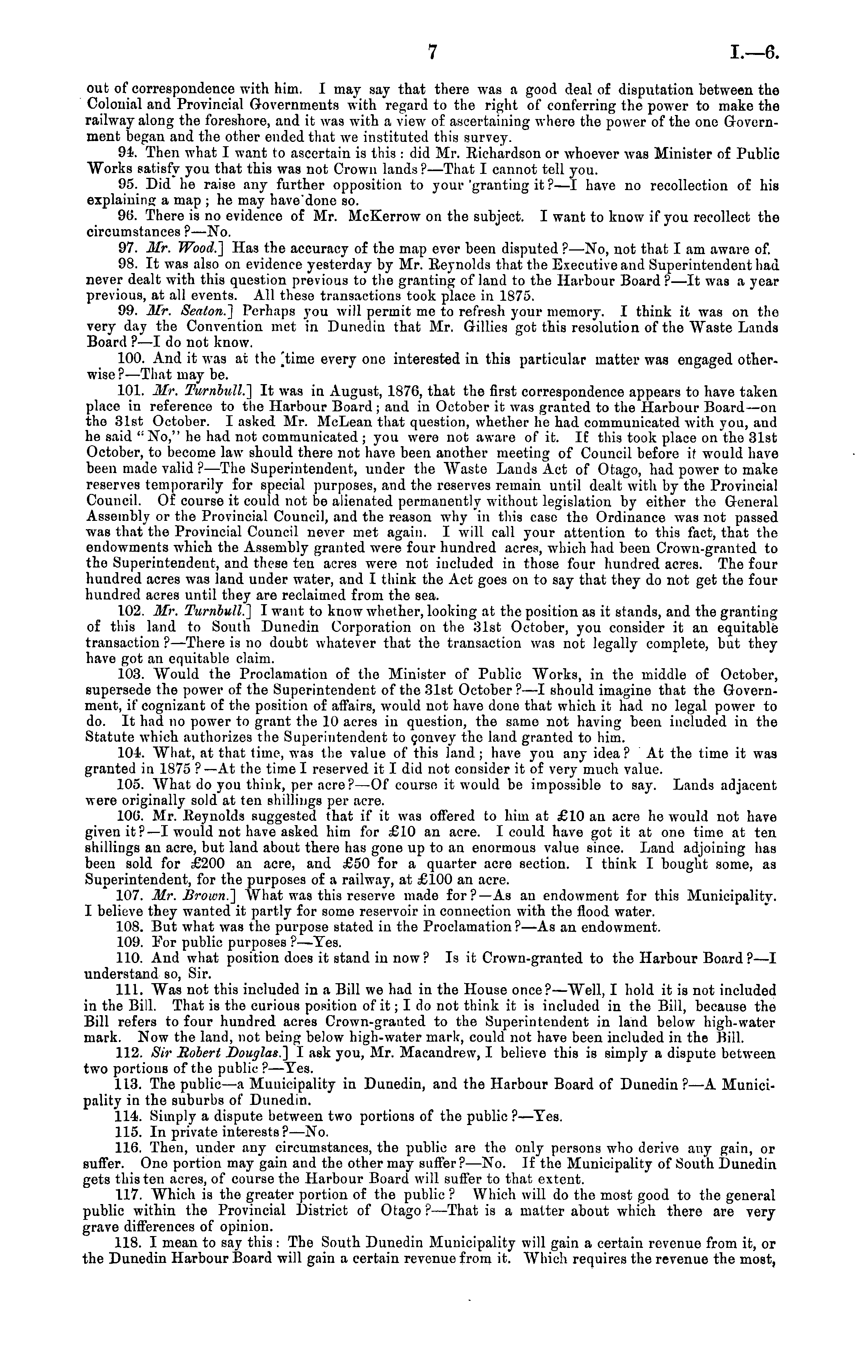out of correspondence with him. I may say that there was a good deal of disputation between the Colonial and Provincial Governments with regard to the right of conferring the power to make the railway along the foreshore, and it was with a view of ascertaining where tho power of the one Government began and the other ended that we instituted this survey. 94. Then what I want to ascertain is this : did Mr. Richardson or whoever was Minister of Public AVorks satisfy you that this was not Crown lands ?—That I cannot tell you. 95. Did he raise any further opposition to your'granting it ?—I have no recollection of his explaining a map ; he may have'dono so. 96. There is no evidence of Mr. McKerrow on the subject. I want to know if you recollect the circumstances ? —No. 97. Mr. Wood.] Has the accuracy of the map ever been disputed ?—No, not that lam aware of. 98. It was also on evidence yesterday by Mr. Reynolds that the Executive and Superintendent had never dealt with this question previous to the granting of land to the Harbour Board?—lt was a year previous, at all events. All these transactions took place in 1875. 99. Mr. Seaton.] Perhaps you will permit me to refresh your memory. I think it was on the very day the Convention met in Dunedin that Mr. Gillies got this resolution of the AVaste Lands Board ? —I do not know. 100. And it was at the jtime every one interested in this particular matter was engaged otherwise?— That may be. 101. Mr. Turnbull.] It was in August, 1876, that the first correspondence appears to have taken place in referenco to the Harbour Board ; and in October it was granted to the Harbour Board —on tho 31st October. I asked Mr. McLean that question, whether ho had communicated with you, aud he said "No," he had not communicated; you were not aware of it. If this took place on tho 31st October, to become law should there not have been another meeting of Council before it would have been made valid ? —The Superintendent, under the AVaste Lands Act of Otago, had power to make reserves temporarily for special purposes, and the reserves remain until dealt with by the Provincial Council. Of course it could not be alienated permanently without legislation by either tho General Assembly or the Provincial Council, and the reason why in this case tho Ordinance was not passed was that the Provincial Council never met again. I will call your attention to this fact, that the endowments which the Assembly granted were four hundred acres, which had been Crown-granted to the Superintendent, and these ten acres were not iucluded in those four hundred acres. The four hundred acres was land under water, and I think the Act goes on to say that they do not get the four hundred acres until they are reclaimed from the sea. 102. Mr, Turnbull,] I want to know whether, looking at the position as it stands, and the granting of this land to South Dunedin Corporation on the 31st October, you consider it an equitable transaction ? —There is no doubt whatever that the transaction was not legally complete, but they have got an equitable claim. 103. AVould the Proclamation of the Minister of Public Works, in the middle of October, supersede the power of the Superintendent of the 31st October? —I should imagine that the Government, if cognizant of tho position of affairs, would not have done that which it had no legal power to do. It had no power to grant the 10 acres in question, the same not having been included in the Statute which authorizes the Superintendent to convey the land granted to him. 104. AVhat, at that time, was the value of this land; have you any idea? At the time it was granted in 1875 ? —At the time I reserved it I did not consider it of very much value. 105. AVhat do you think, per acre? —Of course, it would be impossible to say. Lands adjacent were originally sold at ten shillings per acre. 106. Mr. Reynolds suggested that if it was offered to him at £10 an acre he would not have given it?—l would not have asked him for £10 an acre. I could have got it at one time at ten shillings au acre, but land about there has gone up to an enormous value since. Land adjoining has been sold for £200 an acre, and £50 for a quarter acre section. I think I bought some, as Superintendent, for the purposes of a railway, at £100 an acre. 107. Mr. Brown.] What was this reserve made for? —As au endowment for this Municipality. I believe they wanted it partly for some reservoir in connection with the flood water. 108. But what was the purpose stated in the Proclamation?—As an endowment. 109. For public purposes ?—Yes. 110. And what position does it stand in now? Is it Crown-granted to the Harbour Board?—l understand so, Sir. 111. AVas not this included in a Bill we had in the House once? —AVell, I hold it is not included in the Bill. That is tho curious position of it; Ido not think it is included in the Bill, because the Bill refers to four hundred acres Crown-granted to the Superintendent in land below high-water mark. Now the land, not being below high-water mark, could not have been included in the Bill. 112. Sir Bobert Douglas.] I ask you, Mr. Macandrew, I believe this is simply a dispute between two portions of the public? —Yes. 113. The public —a Municipality in Dunedin, and the Harbour Board of Dunedin?—A Municipality in the suburbs of Dunedin. 114. Simply a dispute between two portions of the public ?—Yes. 115. In private interests?— No. 116. Then, tinder any circumstances, the public are the only persons who derive any gain, or suffer. One portion may gain and the other may suffer? —No. If the Municipality of South Dunedin gets this ten acres, of course the Harbour Board will suffer to that extent. 117. AVhich is the greater portion of the public ? Which will do the most good to the general public within the Provincial District of Otago ? —That is a matter about which there are very grave differences of opinion. 118. I mean to say this