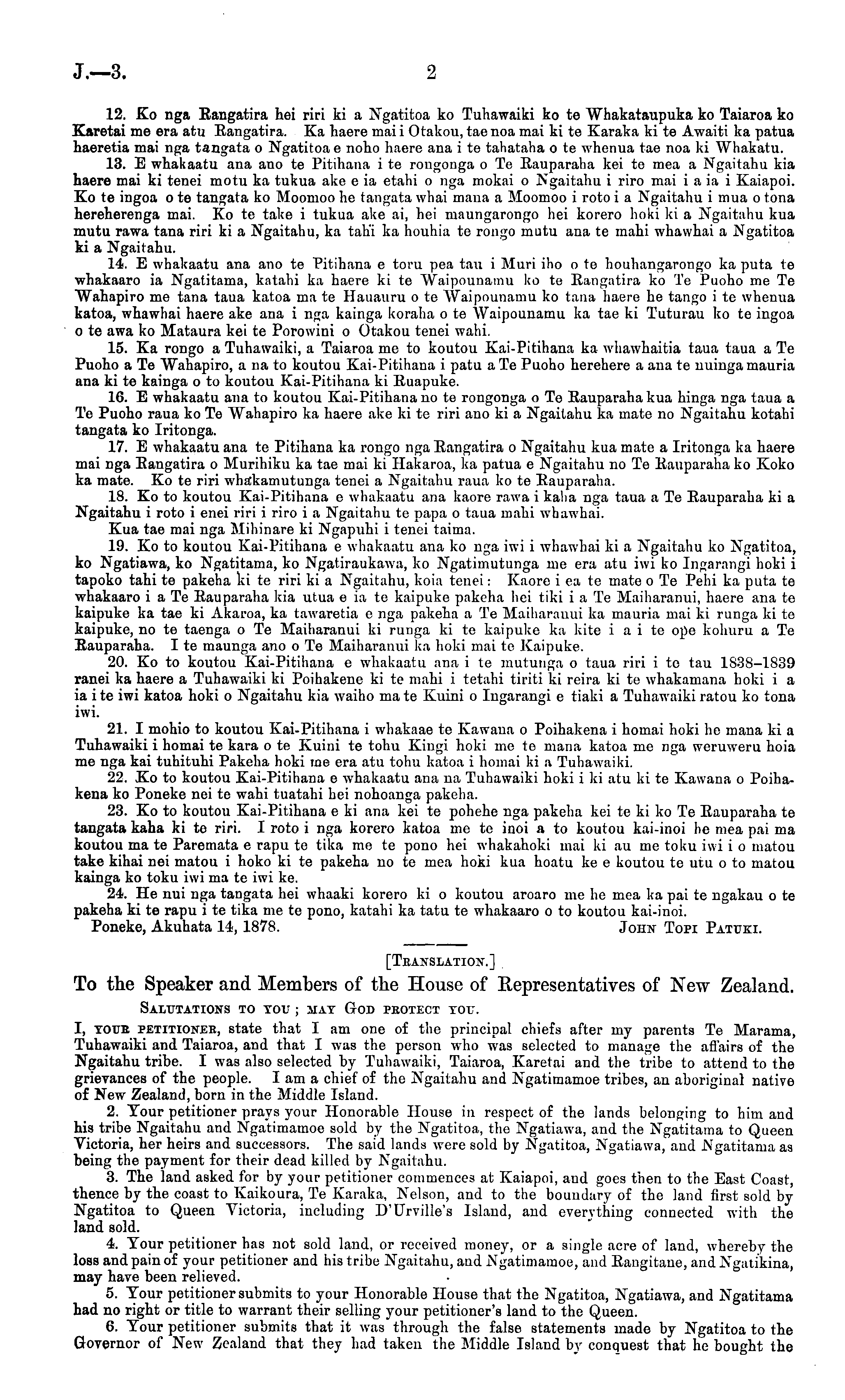 12. Ko nga Rangatira hei riri ki a Ngatitoa ko Tuhawaiki ko te Whakataupuka ko Taiaroa ko Karetai me era atu Eangatira. Ka haere mai i Otakou, tae noa mai kite Karaka kite Awaiti ka patua haeretia mai nga tangata o Ngatitoa c noho haere ana i te tahataha o te whenua tae noa ki Whakatu. 13. E whakaatu ana ano te Pitihana i te rongonga o Te Eauparaha kei to mea a Ngaitahu kia haere mai ki terrei motu ka tukua ake c ia etahi o nga mokai o Ngaitahu i riro mai i a ia i Kaiapoi. Ko te ingoa o te tangata ko Moomoo he tangata whai mana a Moomoo i roto i a Ngaitahu i mua o tona hereherenga mai. Ko te take i tukua ake ai, hei maungarongo hei korero hoki ki a Ngaitahu kua mutu rawa tana riri ki a Ngaitahu, ka tah'i ka houhia te rongo inutu ana te mahi whawhai a Ngatitoa ki a Ngaitahu. 14. E whakaatu ana ano to Pitihana c toru pea tan i Muri iho o te houhangarongo ka puta te whakaaro ia Ngatitama, katahi ka haere kite Waipounainu ko te Eangatira ko Te Puoho me Te Wahapiro me tarra taua katoa ma te Hauauru o te Waipounamu ko tana haere he tango i te whenua katoa, whawhai haere ake ana i nga kainga koraha o te Waipounamu ka tae ki Tuturau ko te ingoa o te awa ko Mataura kei te Porowini o Otakou tenei wahi. 15. Ka rongo a Tuhawaiki, a Taiaroa me to koutou Kai-Pitihana ka whawhaitia taua taua a Te Puoho a Te Wahapiro, a na to koutou Kai-Pitihana i patu a Te Puoho herehere a ana te nuinga mauria ana kite kainga o to koutou Kai-Pitihana ki Ruapuke. 16. E whakaatu ana to koutou Kai-Pitihana no te rongonga o Te Eauparaha kua hinga nga taua a Te Puoho raua ko Te Wahapiro ka haere ake kite riri ano ki a Ngaitahu ka mate no Ngaitahu kotahi tangata ko Iritonga. 17. E whakaatu ana te Pitihana ka rongo nga Eangatira o Ngaitahu kua mate a Iritonga ka haere mai nga Eangatira o Murihiku ka tae mai ki Hakaroa, ka patua c Ngaitahu no Te Eauparaha ko Koko ka mate. Ko te riri whackamutunga tenei a Ngaitahu raua ko te Eauparaha. 18. Ko to koutou Kai-Pitihana c whakaatu ana kaore rawa i kaha nga taua a Te Eauparaha ki a Ngaitahu i roto i enei riri i riro i a Ngaitahu te papa o taua mahi whawhai. Kua tae mai nga Mihinare ki Ngapuhi i tenei taima. 19. Ko to koutou Kai-Pitihana c whakaatu ana ko nga iwi i whawhai ki a Ngaitahu ko Ngatitoa, ko Ngatiawa, ko Ngatitama, ko Ngatiraukawa, ko Ngatimutunga me era atu iwi ko Ingarangi hoki i tapoko tahi te pakeha kite riri ki a Ngaitahu, koia tenei: Kaore iea te mate oTe Pehi ka puta te whakaaro i a Te Eauparaha kia utua c ia te kaipuke pakeha hei tiki i a Te Mailiaranui, haere ana te kaipuke ka tae ki Akaroa, ka tawaretia o nga pakeha a Te Maiharauui ka mauria mar ki runga kite kaipuke, no te taenga o Te Maiharanui ki runga kite kaipuke ka kite i a i te ope kohtiru a Te Eauparaha. Ite maunga ano oTe Maiharanui ka hoki mai to Kaipuke. 20. Ko to koutou Kai-Pitihana c whakaatu ana i te mutunga o taua riri i te tau 1838-1839 ranei ka haere a Tuhawaiki ki Poihakene kite mahi i tetahi tiriti ki reira kite whakamana hoki i a ia i te iwi katoa hoki o Ngaitahu kia waiho ma te Kuini o Ingarangi c tiaki a Tuhawaiki ratou ko tona iwi. 21. I mohio to koutou Kai-Pitihana i whakaae te Kawana o Poihakena i homai hoki ho mana ki a Tuhawaiki i homai te kara o te Kuini te tohu Kingi hoki me te mana katoa me nga weruweru hoia me nga kai tuhituhi Pakeha hoki me era atu tohu katoa i homai ki a Tuhawaiki. 22. Ko to koutou Kai-Pitihana c whakaatu ana na Tuhawaiki hoki i ki atu kite Kawana o Poihakena ko Poneke nei te wahi tuatahi hei nohoanga pakeha. 23. Ko to koutou Kai-Pitihana c ki ana kei te pohehe nga pakeha kei te ki ko Te Eauparaha te tangata kaha kite riri. I roto i nga korero katoa me to inoi a to koutou kai-inoi he mea pai ma koutou ma te Paremata c rapu te tika me te pono hei whakahoki mai ki au me toku iwi i o matou take kihai nei matou i hoko kite pakeha no te mea hoki kua hoatu ke c koutou te utu o to matou kainga ko toku iwi ma te iwi ke. 24. He nui nga tangata hei whaaki korero ki o koutou aroaro me he mea ka pai te ngakau o te pakeha kite rapu i te tika me te pono, katahi ka tatu te whakaaro o to koutou kai-inoi. Poneke, Akuhata 14, 1878. John Topi Patuki.