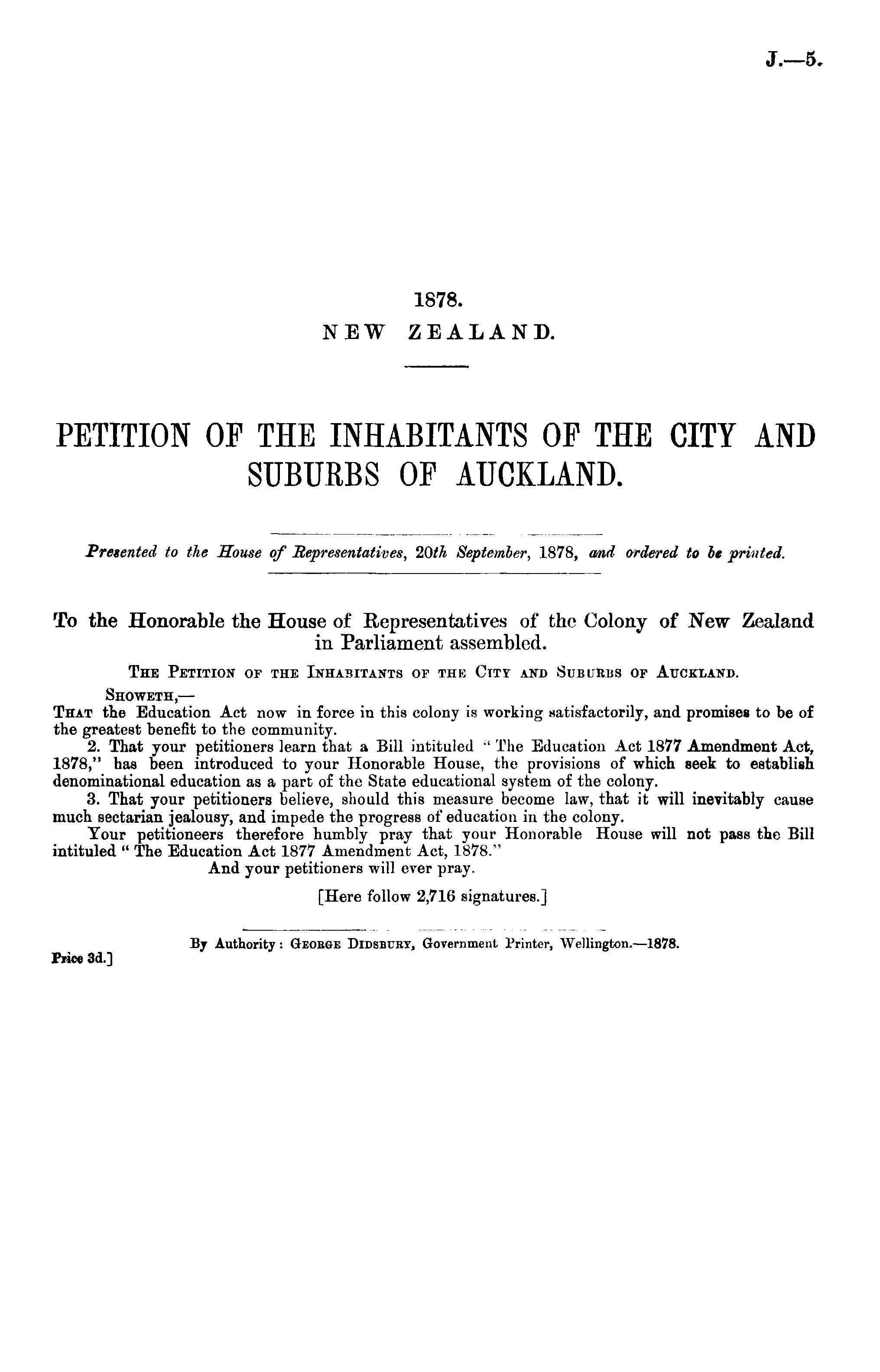 Presented to the House of Representatives, 20th September, 1878, and ordered to be printed. To the Honorable the House of Representatives of the Colony of New Zealand in Parliament assembled. The Petition of the Inhabitants op the City and Sububbs of Auckland. Showeth, — That the Education Act now in force in this colony is working satisfactorily, and promises to be of the greatest benefit to the community. 2. That your petitioners learn that a Bill intituled " The Education Act 1877 Amendment Act, 1878," has been introduced to your Honorable House, the provisions of which seek to establish denominational education as a part of tho State educational system of the colony. 3. That your petitioners believe, should this measure become law, that it will inevitably cause much sectarian jealousy, and impede the progress ot* education in the colony. Tour petitioneers therefore humbly pray that your Honorable House will not pass the Bill intituled " The Education Act 1877 Amendment Act, 1878." And your petitioners will ever pray. [Here follow 2,716 signatures.] By Authority : George Didsburt, Government Printer, Wellington. —1878. Price 3d.]