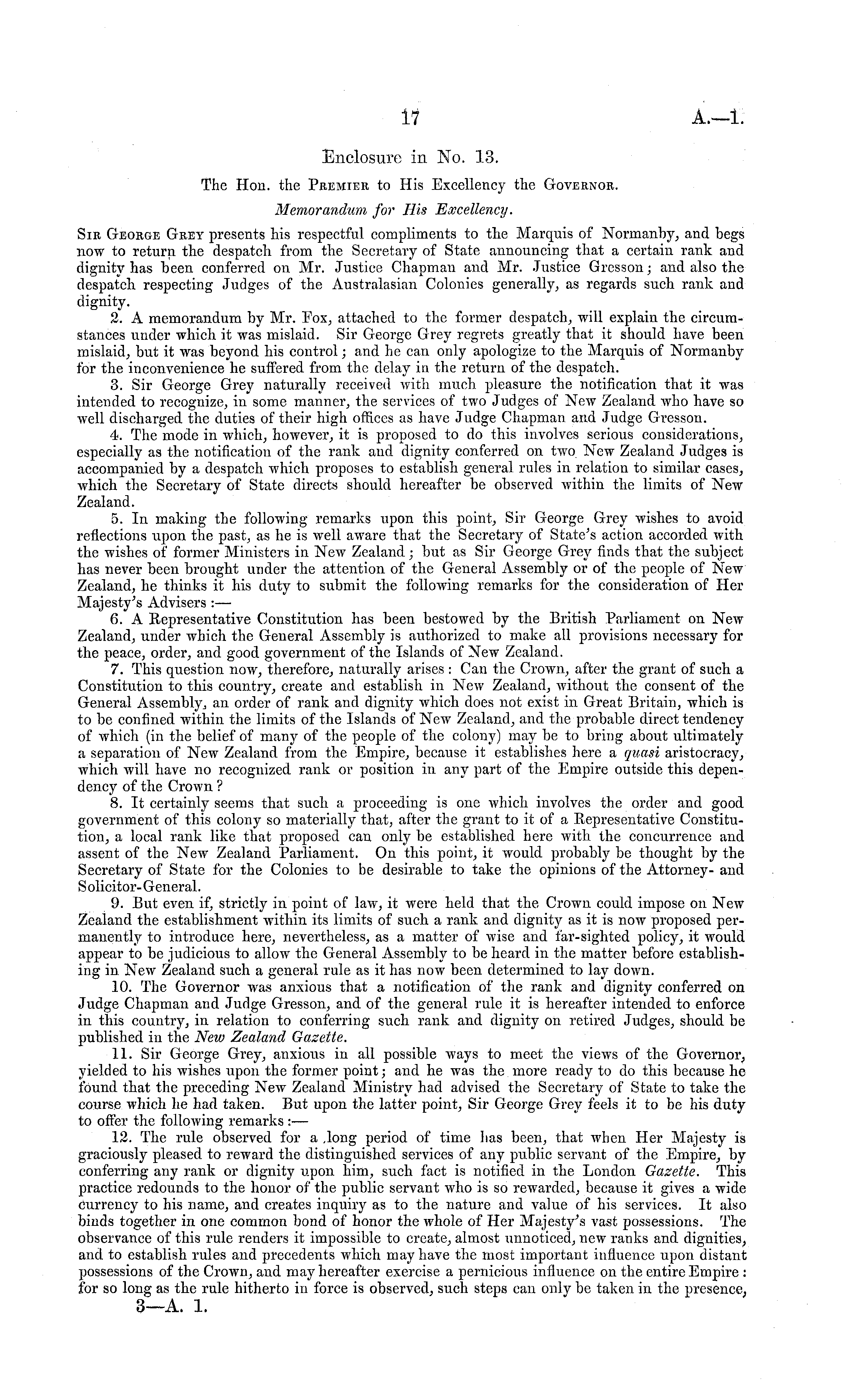 Enclosure in No. 13. The Hon. the Premier to His Excellency the Governor. Memorandum for His Excellency. Sir George Grey presents his respectful compliments to the Marquis of Normanby, and begs now to return the despatch from the Secretary of State announcing that a certain rank and dignity has been conferred on Mr. Justice Chapman and Mr. Justice Gresson ; and also the despatch respecting Judges of the Australasian Colonies generally, as regards such rank and dignity. 2. A memorandum by Mr. Fox, attached to the former despatch, will explain the circumstances under which it was mislaid. Sir George Grey regrets greatly that it should have been mislaid, but it was beyond his control; and he can only apologize to the Marquis of Normanby for the inconvenience he suffered from the delay in the return of the despatch. 3. Sir George Grey naturally received with much pleasure the notification that it was intended to recognize, in some manner, the services of two Judges of New Zealand who have so well discharged the duties of their high offices as have Judge Chapman and Judge Gresson. 4. The mode in which, however, it is proposed to do this involves serious considerations, especially as the notification of the rank and dignity conferred on two New Zealand Judges is accompanied by a despatch which proposes to establish general rules in relation to similar cases, which the Secretary of State directs should hereafter be observed within the limits of New Zealand. 5. In making the following remarks upon this point, Sir George Grey wishes to avoid reflections upon the past, as he is well aware that the Secretary of State's action accorded with the wishes of former Ministers in New Zealand ; but as Sir George Grey finds that the subject has never been brought under the attention of the General Assembly or of the people of New Zealand, he thinks it his duty to submit the following remarks for the consideration of Her Majesty's Advisers : — 6. A Representative Constitution has been bestowed by the British Parliament on New Zealand, under which the General Assembly is authorized to make all provisions necessary for the peace, order, and good government of the Islands of New Zealand. 7. This question now, therefore, naturally arises : Can the Crown, after the grant of such a Constitution to this country, create and establish in New Zealand, without the consent of the General Assembly, an order of rank and dignity which does not exist in Great Britain, which is to be confined within the limits of the Islands of New Zealand, and the probable direct tendency of which (in the belief of many of the people of the colony) may be to bring about ultimately a separation of New Zealand from the Empire, because it establishes here a quasi aristocracy, which will have no recognized rank or position in any part of the Empire outside this dependency of the Crown ? 8. It certainly seems that such a proceeding is one which involves the order and good government of this colony so materially that, after the grant to it of a Representative Constitution, a local rank like that proposed can only be established here with the concurrence and assent of the New Zealand Parliament. On this point, it w rould probably be thought by the Secretary of State for the Colonies to be desirable to take the opinions of the Attorney- and Solicitor-General. 9. But even if, strictly in point of law, it were held that the Crown could impose on New Zealand the establishment within its limits of such a rank and dignity as it is now proposed permanently to introduce here, nevertheless, as a matter of wise and far-sighted policy, it would appear to be judicious to allow the General Assembly to be heard in the matter before establishing in New Zealand such a general rule as it has now been determined to lay down. 10. The Governor was anxious that a notification of the rank and dignity conferred on Judge Chapman and Judge Gresson, and of the general rule it is hereafter intended to enforce in this country, in relation to conferring such rank and dignity on retired Judges, should be published in the New Zealand Gazette. 11. Sir George Grey, anxious in all possible ways to meet the views of the Governor, yielded to his wishes upon the former point; and he was the more ready to do this because he found that the preceding New Zealand Ministry had advised the Secretary of State to take the course which he had taken. But upon the latter point, Sir George Grey feels it to be his duty to offer the following remarks : — 12. The rule observed for a long period of time has been, that when Her Majesty is graciously pleased to reward the distinguished services of any public servant of the Empire, by conferring any rank or dignity upon him, such fact is notified in the London Gazette. This practice redounds to the honor of the public servant who is so rewarded, because it gives a wide currency to his name, and creates inquiry as to the nature and value of his services. It also binds together in one common bond of honor the whole of Her Majesty's vast possessions. The observance of this rule renders it impossible to create, almost unnoticed, new ranks and dignities, and to establish rules and precedents which may have the most important influence upon distant possessions of the Crown, and may hereafter exercise a pernicious influence on the entire Empire : for so long as the rule hitherto in force is observed, such steps can only be taken in the presence, 3—A. 1.