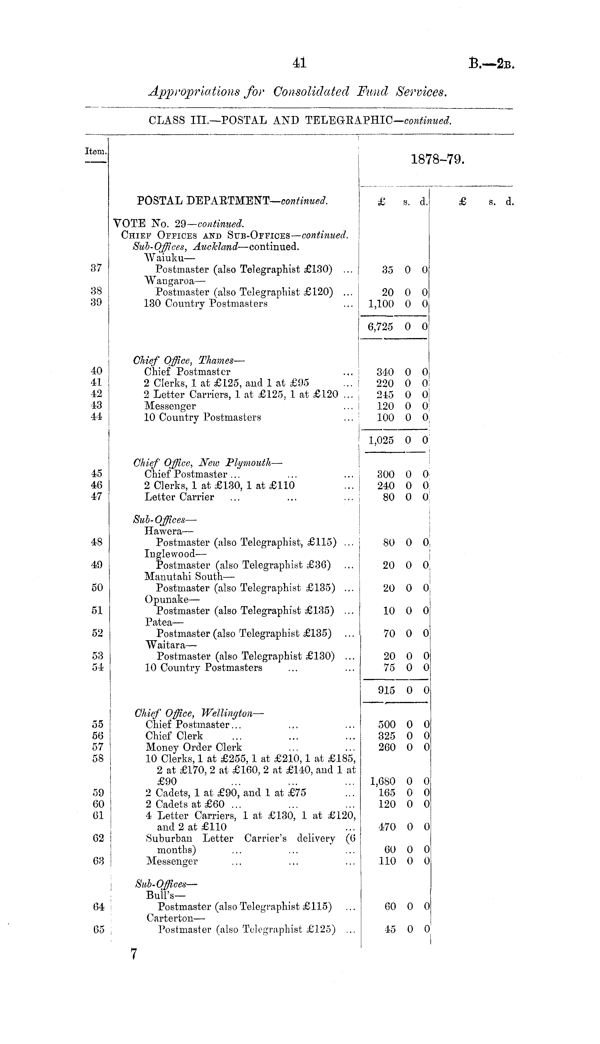 CLASS III.—POSTAL AND TELEGRAPHIC— emUnwei. Item. 1878-79. — 37 38 39 POSTAL DEPARTMENT— continued. VOTE No. 29— continued. Chief Offices and Stcb-Oitioes — continued. Sub- Offices, Auckland —continued. Waiuku — Postmaster (also Telegraphist £130) ... Wangaroa— Postmaster (also Telegraphist £120) ... 130 Country Postmasters £ s. d. £ s. d, 35 0 0 37 38 39 20 1,100 0 0 0 0 6,725 0 0 40 41 42 43 44 40 41 42 43 44 Chief Office, Thames- — Chief Postmaster 2 Clerks, 1 at £125, and 1 at £95 2 Letter Carriers, 1 at £125, 1 at £120 ... Messenger 10 Country Postmasters 340 220 245 120 100 0 0 0 0 0 0 o! 0 45 46 47 Chief Office, New Plymouth — Chief Postmaster ... 2 Clerks, 1 at £130, 1 at £110 Letter Carrier 1,025 0 0 45 40 17 300 240 80 0 0 0 Oi Oj °i 48 49 50 51 48 49 50 51 52 53 54 Sub-Offices —■ Hawera — Postmaster (also Telegraphist, £115) ... Inglewood— Postmaster (also Telegraphist £36) Manutahi South— Postmaster (also Telegraphist £135) ... Opunake — Postmaster (also Telegraphist £135) ... Patea — Postmaster (also Telegraphist £135) Waitara— Postmaster (also Telegraphist £130) ... 10 Country Postmasters 80 20 20 10 0 0 0 0 0 0 0 0 52 70 0 0 53 54 20 75 0 0 0 0 55 56 57 58 59 60 61 62 63 Chief Office, Wellington— Chief Po stmaster... Chief Clerk Money Order Clerk 10 Clerks, 1 at £255,1 at £210,1 at £185, 2 at £170, 2 at £160, 2 at £140. and 1 at £90 2 Cadets, 1 at £90, and 1 at £75 2 Cadets at £60 ... 4 Letter Carriers, 1 at £130, 1 at £120, and 2 at £110 Suburban Letter Carrier's delivery (6 months) Messenger 915 0 0 55 56 57 58 500 0 0 325 0 0 260 0 0 59 60 61 1,680 0 0 165 0 0 120 0 0 02 470 0 0 63 60 0 0 110 0 0 64 65 Sub- Offices — Bull's— Postmaster (also Telegraphist £115) Carterton — Postmaster (also Telegraphist £125) ... 60 0 0 45 0 0 7
