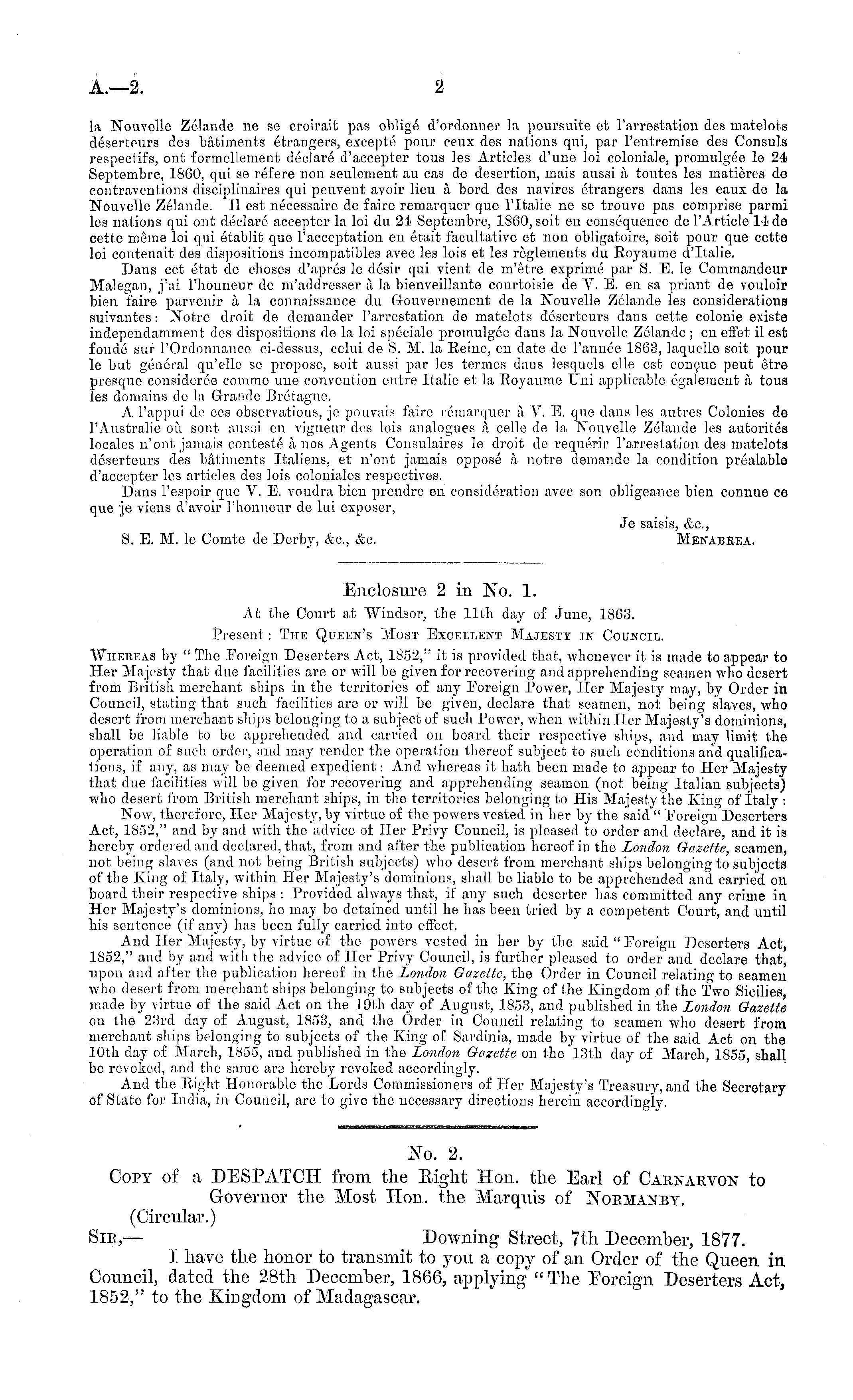 No. 2. Copy of a DESPATCH from the Right Hon. the Earl of Carnarvon to Governor the Most Hon. the Marqxus of Normanby. (Circular.) Sir,— Downing Street, 7th December, 1877. I have the honor to transmit to you a copy of an Order of the Queen in Council, dated the 28th December, 1866, applying " The Eoreign Deserters Act, 1852," to the Kingdom of Madagascar.