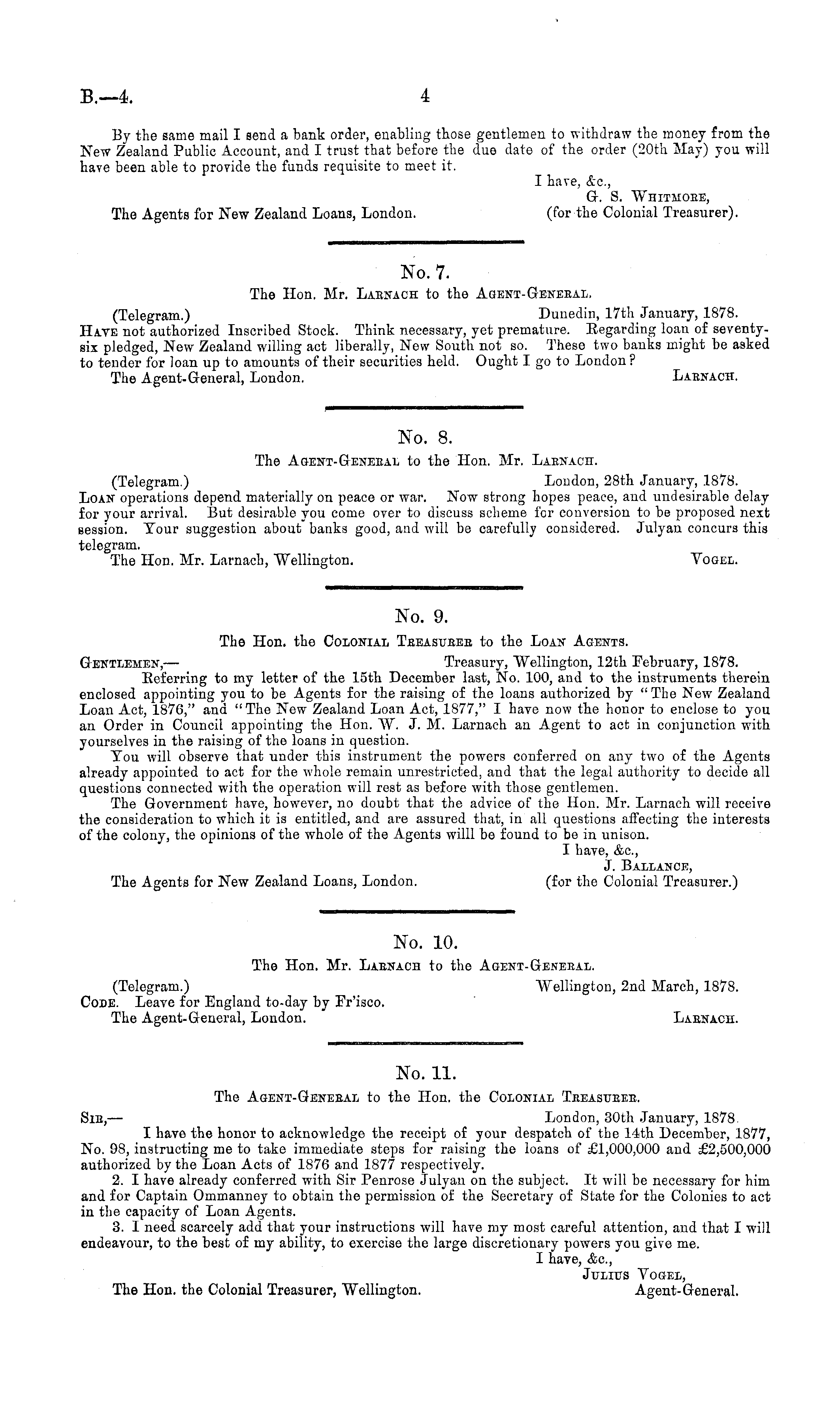 No. 8. The Agent-Geneeal to the Hon. Mr. Laenach. (Telegram.) Loudon, 28th January, .1878. Loan operations depend materially on peace or war. Now strong hopes peace, and undesirable delay for your arrival. But desirable you come over to discuss scheme for conversion to be proposed next session. Your suggestion about banks good, and will be carefully considered. Julyan concurs this telegram. The Hon. Mr. Larnach, Wellington. Yogel.