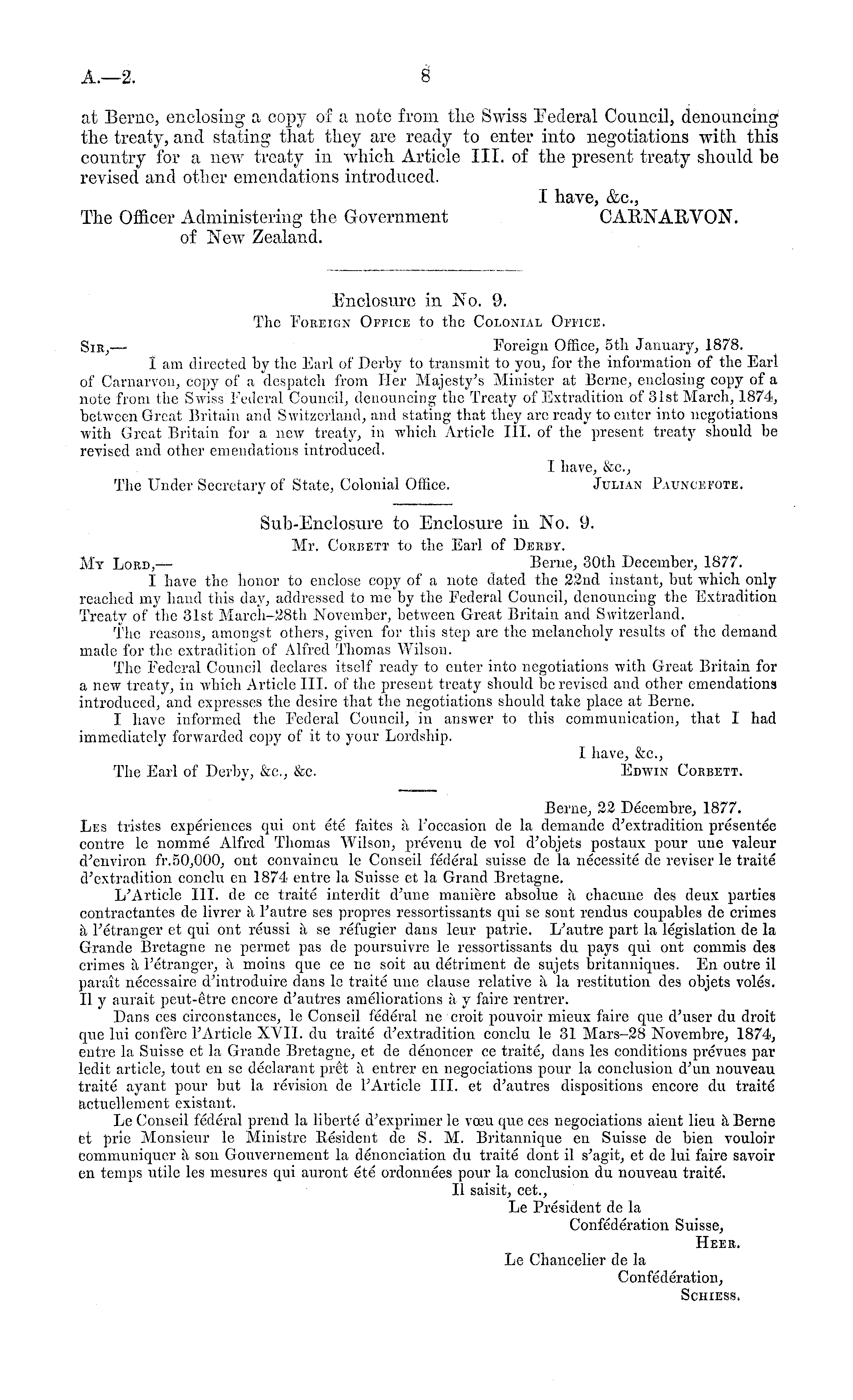Enclosure in No. 9. The Foreign Office to the Colonial Office. Sir, — Foreign Office, sth January, 1878. I am directed by the Earl of Derby to transmit to you, for the information of the Eari of Carnarvon, copy of a despatch from Her Majesty's Minister at Berne, enclosing copy of a note from the Swiss Federal Council, denouncing the Treaty of Extradition of 31st March, 1874, between Great Britain and Switzerland, and stating that they arc ready to enter into negotiations with Great Britain for a new treaty, in which Article 111. of the present treaty should be revised and other emendations introduced. I have, &c, The Under Secretary of State, Colonial Office. Julian Pauncefotk. Sub-Enclosure to Enclosure in No. 9. Mr. Cohbett to the Earl of Derby. My Lord, — Berne, 30th December, 1877. I have the honor to enclose copy of a note dated the 2.2nd instant, but which only reached my hand this day, addressed to me by the Federal Council, denouncing the Extradition Treaty of the 31st March-28th November, between Great Britain and Switzerland. The reasons, amongst others, given for this step are the melancholy results of the demand made for the extradition of Alfred Thomas Wilson. The Federal Council declares itself ready to enter into negotiations with Great Britain for a new treaty, in which Article 111. of the present treaty should be revised and other emendations introduced, and expresses the desire that the negotiations should take place at Berne. I have informed the Federal Council, in answer to this communication, that I had immediately forwarded copy of it to your Lordship. I have-, &c., The Earl of Derby, &c, &c. Edwin Corbett.