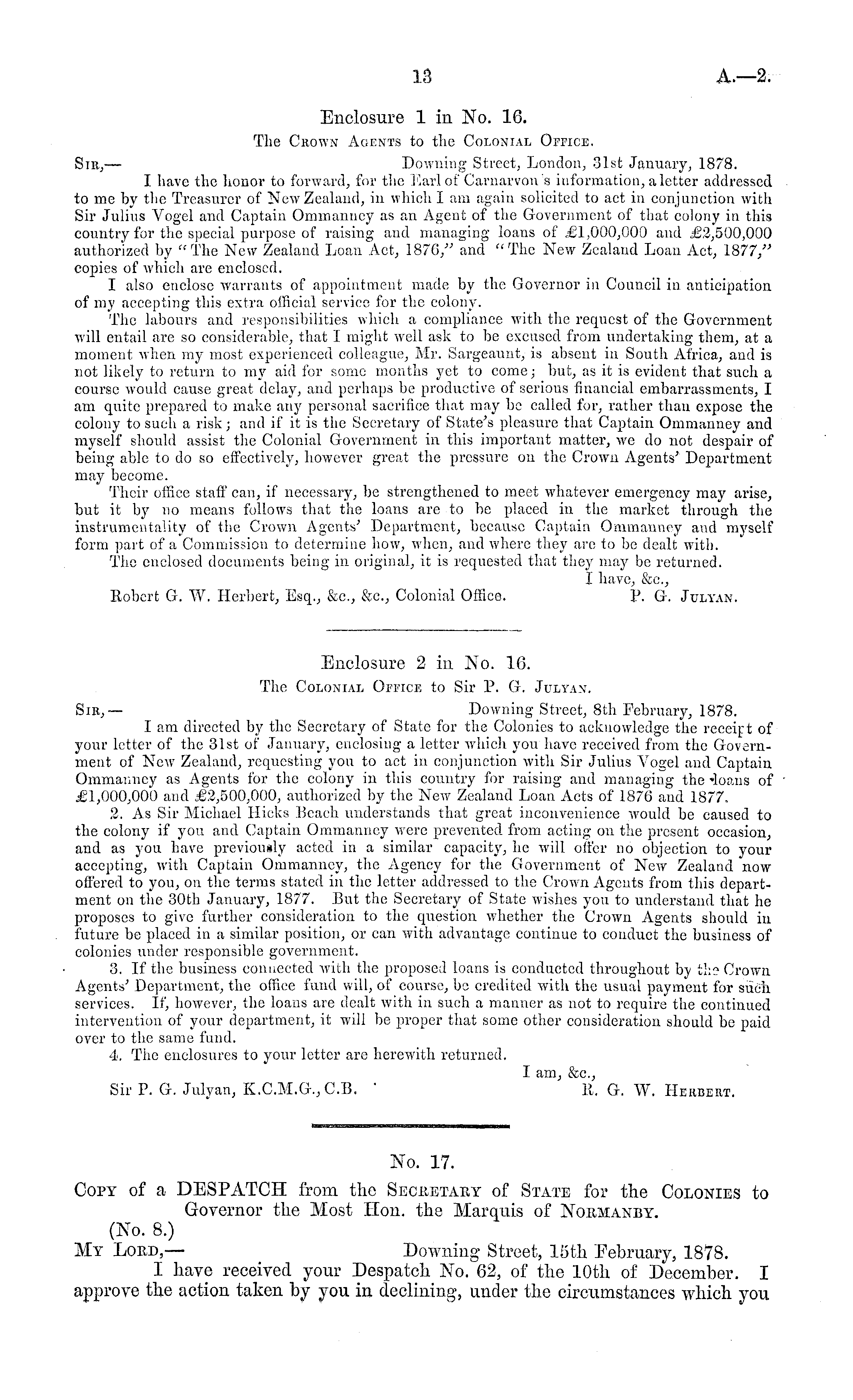 Enclosure 2 in No. 16. The Colonial Office to Sir P. G. Julyan. Sir,— Downing Street, Bth February, 1878. I am directed by the Secretary of State for the Colonies to acknowledge the receipt of your letter of the 31st of January, enclosing a letter which you have received from the Government of New Zealand, requesting you to act in conjunction with Sir Julius Vogel and Captain Ommanncy as Agents for the colony in this country for raising and managing the 'loans of £1,000,000 and £2,500,000, authorized by the New Zealand Loan Acts of 1876 and 1877, 2. As Sir Michael Hicks Beach understands that great inconvenience would be caused to the colony if you and Captain Ommanney were prevented from acting on the present occasion, and as you have previoualy acted in a similar capacity, he will offer no objection to your accepting, with Captain Ommanney, the Agency for the Government of New Zealand now offered to you, on the terms stated in the letter addressed to the Crown Agents from this department on the 30th January, 1877. But the Secretary of State wishes you to understand that he proposes to give further consideration to the question whether the Crown Agents should in future be placed in a similar position, or can with advantage continue to conduct the business of colonies under responsible government. 3. If the business connected with the proposed loans is conducted throughout by the Crown Agents' Department, the office fund will, of course, be credited with the usual payment for such services. If, however, the loans are dealt with in such a manner as not to require the continued intervention of your department, it will be proper that some other consideration should be paid over to the same fund. 4. The enclosures to your letter are herewith returned. I am, &c, Sir P. G. Julyan, K.C.M.G., C.B. ' R. G. W. Herbert.