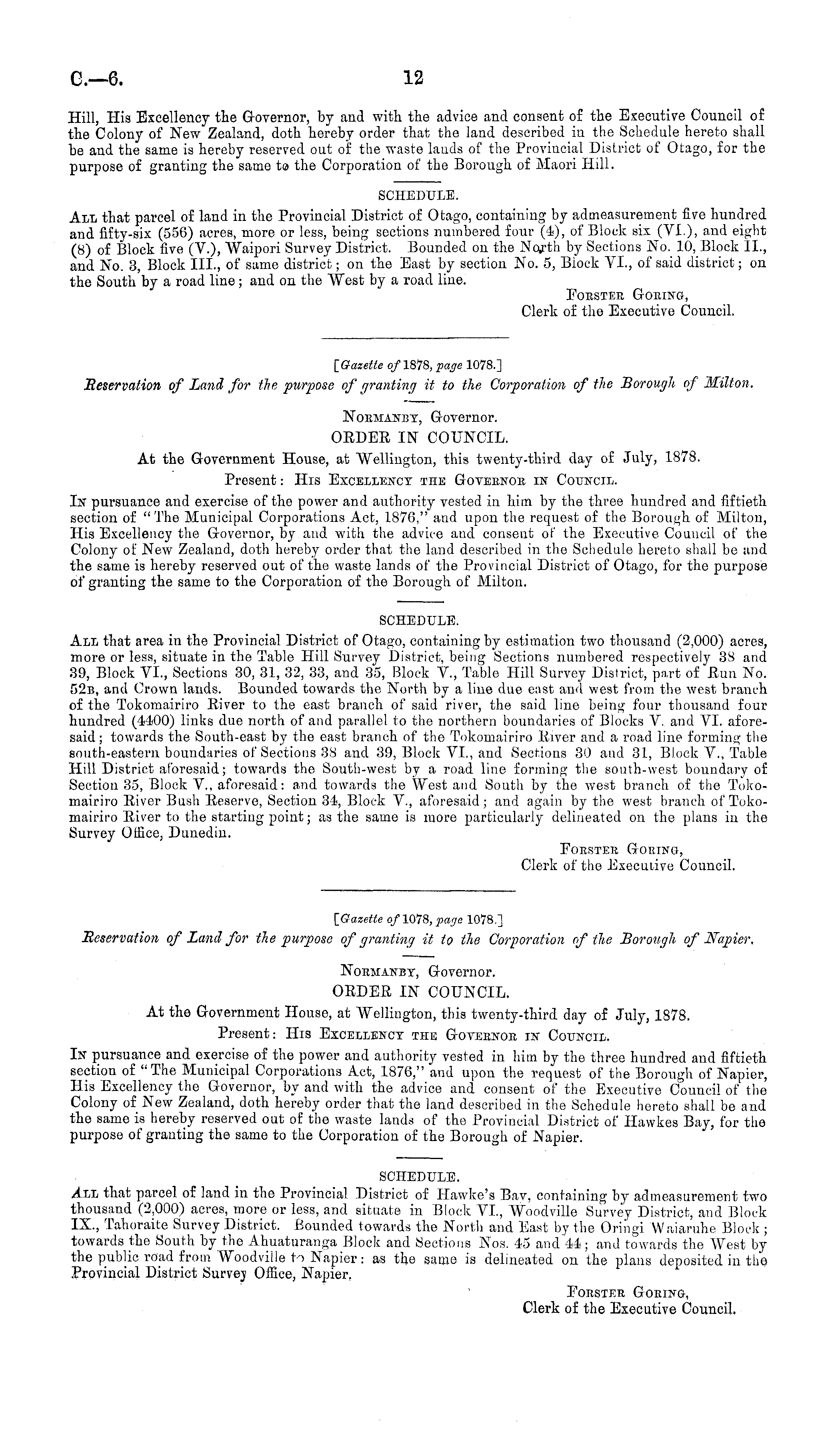 Normanby, Governor. ORDER IN COUNCIL. At the Government House, at Wellington, this twenty-third day of July, 1878. Present: His Excellency the Governor in Council. In pursuance and exercise of the power and authority vested in him by the three hundred and fiftieth section of "The Municipal Corporations Act, 1876," and upon the request of the Borough of Napier, His Excellency the Governor, by and with the advice and consent of the Executive Council of the Colony of New Zealand, doth hereby order that the land described in the Schedule hereto shall be and the same is hereby reserved out of the waste lands of the Provincial District of Hawkes Bay, for the purpose of granting the same to the Corporation of the Borough of Napier.