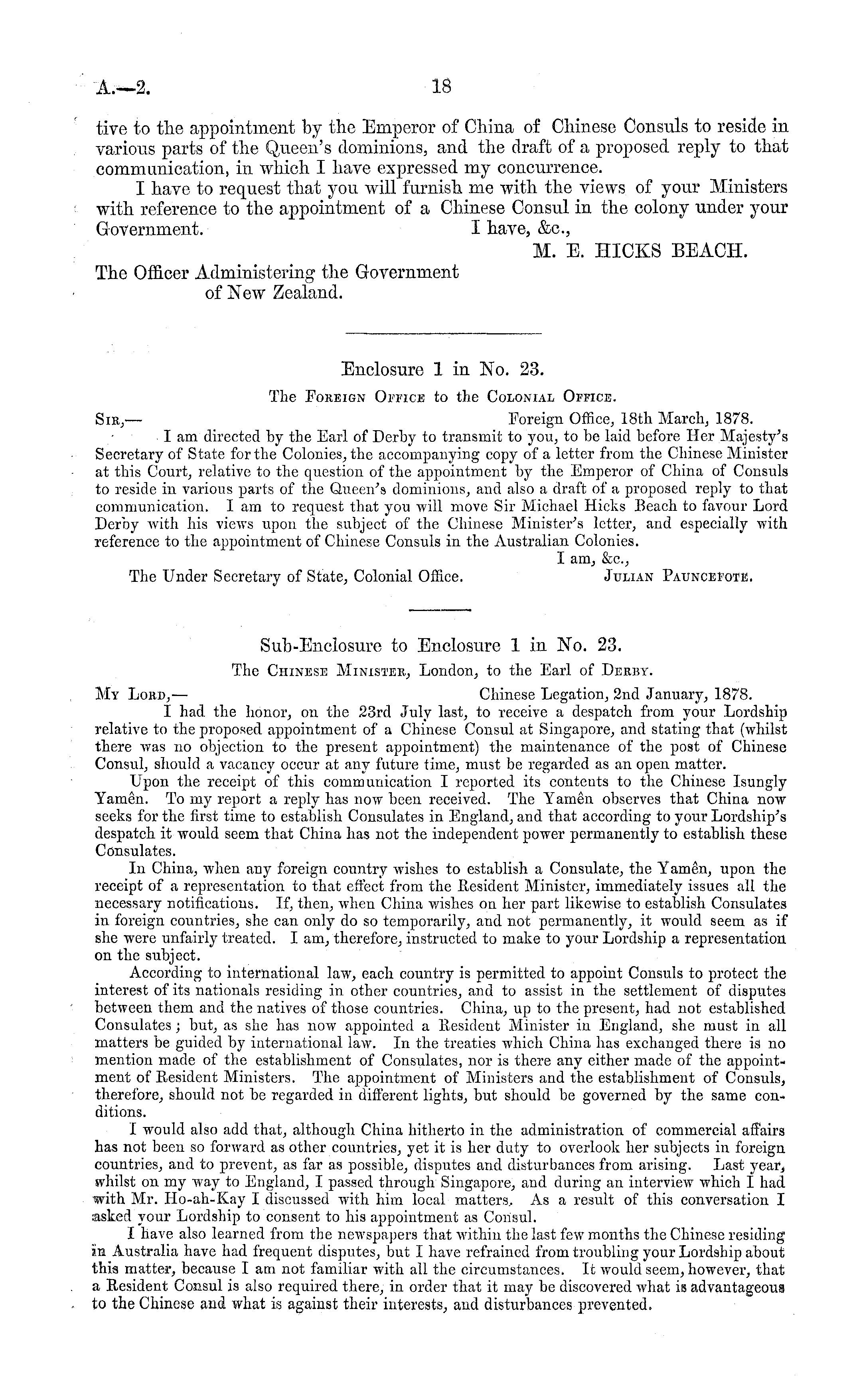 Sub-Enclosure to Enclosure 1 in No. 23. The Chinese Minister, London, to the Earl of Derby. My Lord, — Chinese Legation, 2nd January, 1878. I had the honor, on the 23rd July last, to receive a despatch from your Lordship relative to the proposed appointment of a Chinese Consul at Singapore, and stating that (whilst there was no objection to the present appointment) the maintenance of the post of Chinese Consul, should a vacancy occur at any future time, must be regarded as an open matter. Upon the receipt of this communication I reported its contents to the Chinese Isungly Yamen. To my report a reply has now been received. The Yamen observes that China now seeks for the first time to establish Consulates in England, and that according to your Lordship's despatch it would seem that China has not the independent power permanently to establish these Consulates. In China, when any foreign country wishes to establish a Consulate, the Yamen, upon the receipt of a representation to that effect from the Resident Minister, immediately issues all the necessary notifications. If, then, when China wishes on her part likewise to establish Consulates in foreign countries, she can only do so temporarily, and not permanently, it would seem as if she were unfairly treated. I am, therefore, instructed to make to your Lordship a representation on the subject. According to international law, each country is permitted to appoint Consuls to protect the interest of its nationals residing in other countries, and to assist in the settlement of disputes between them and the natives of those countries. China, up to the present, had not established Consulates ; but, as she has now appointed, a liesident Minister in England, she must in all matters be guided by international law. In the treaties which China has exchanged there is no mention made of the establishment of Consulates, nor is there any either made of the appointment of Resident Ministers. The appointment of Ministers and the establishment of Consuls, therefore, should not he regarded in different lights, but should be governed by the same conditions. I would also add that, although China hitherto in the administration of commercial affairs has not been so forward as other countries, yet it is her duty to overlook her subjects in foreign countries, and to prevent, as far as possible, disputes and disturbances from arising. Last year, whilst on my way to England, I passed through Singapore, and during an interview which I had with Mr. Ho-ah-Kay I discussed with him local matters.. As a result of this conversation I asked your Lordship to consent to his appointment as Consul. I have also learned from the newspapers that within the last few months the Chinese residing In Australia have had frequent disputes, but I have refrained from troubling your Lordship about this matter, because lam not familiar with all the circumstances. It would seem, however, that a Resident Consul is also required there, in order that it may be discovered what is advantageous to the Chinese and what is against their interests, and disturbances prevented.