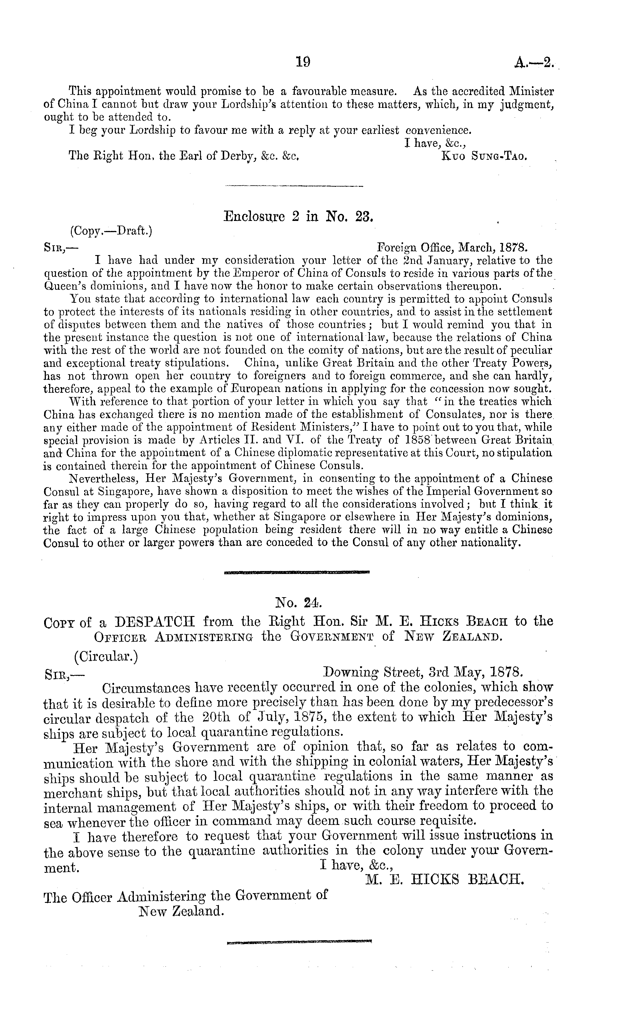 This appointment would promise to he a favourable measure. As the accredited Minister of China I cannot but draw your Lordship's attention to these matters, which, in my judgment, ought to be attended to. I beg your Lordship to favour me with a reply at your earliest convenience. I have, &c., The Right Hon, the Earl of Derby, &c. &c. Kuo Sung-Tao.