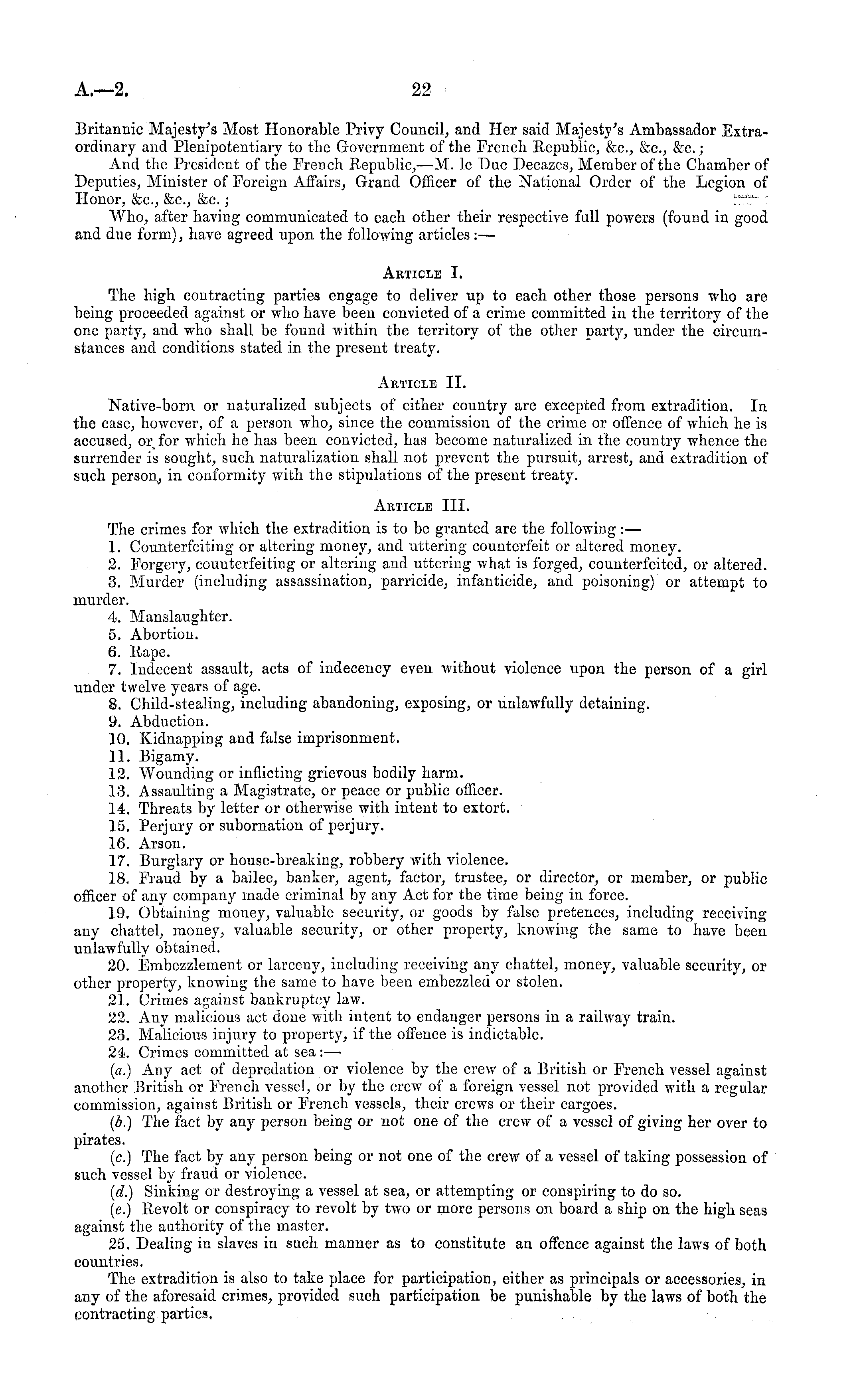Britannic Majesty's Most Honorable Privy Council, and Her said Majesty's Ambassador Extraordinary and Plenipotentiary to the Government of the French Republic, &c, &c, &c.; And the President of the French Republic,-—-M. le Due Decazes, Member of the Chamber of Deputies, Minister of Foreign Affairs, Grand Officer of the National Order of the Legion of Honor, &c, &c, &c.; !""*"'" " Who, after having communicated to each other their respective full powers (found in good and due form), have agreed upon the following articles:— Article I. The high contracting parties engage to deliver up to each other those persons who are being proceeded against or who have been convicted of a crime committed in the territory of the one party, and who shall be found within the territory of the other party, under the circumstances and conditions stated in the present treaty. Article 11. Native-born or naturalized subjects of either country are excepted from extradition. In the case, however, of a person who, since the commission of the crime or offence of which he is accused, or for which he has been convicted, has become naturalized in the country whence the surrender is sought, such naturalization shall not prevent the pursuit, arrest, and extradition of such person, in conformity with the stipulations of the present treaty. Article 111. The crimes for which the extradition is to be granted are the following:— 1. Counterfeiting or altering money, and uttering counterfeit or altered money. 2. Forgery, counterfeiting or altering and uttering what is forged, counterfeited, or altered. 3. Murder (including assassination, parricide, infanticide, and poisoning) or attempt to murder. 4. Manslaughter. 5. Abortion. 6. Rape. 7. Indecent assault, acts of indecency even without violence upon the person of a girl under twelve years of age. 8. Child-stealing, including abandoning, exposing, or unlawfully detaining. 9. Abduction. 10. Kidnapping and false imprisonment. 11. Bigamy. 12. Wounding or inflicting grievous bodily harm. 13. Assaulting a Magistrate, or peace or public officer. 14. Threats by letter or otherwise with intent to extort. 15. Perjury or subornation of perjury. 16. Arson. 17. Burglary or house-breaking, robbery with violence. 18. Fraud by a bailee, banker, agent, factor, trustee, or director, or member, or public officer of any company made criminal by any Act for the time being in force. 19. Obtaining money, valuable security, or goods by false pretences, including receiving any chattel, money, valuable security, or other property, knowing the same to have been unlawfully obtained. 20. Embezzlement or larceny, including receiving any chattel, money, valuable security, or other property, knowing the same to have been embezzled or stolen. 21. Crimes against bankruptcy law. 22. Any malicious act done with intent to endanger persons in a railway train. 23. Malicious injury to property, if the offence is indictable. 24. Crimes committed at sea:— (a.) Any act of depredation or violence by the crew of a British or French vessel against another British or French vessel, or by the crew of a foreign vessel not provided with a regular commission, against British or French vessels, their crews or their cargoes. (b.) The fact by any person being or not one of the crew of a vessel of giving her over to pirates. (c.) The fact by any person being or not one of the crew of a vessel of taking possession of such vessel by fraud or violence. (d.) Sinking or destroying a vessel at sea, or attempting or conspiring to do so. (c.) Revolt or conspiracy to revolt by two or more persons on board a ship on the high seas against the authority of the master. 25. Dealing in slaves in such manner as to constitute an offence against the laws of both countries. The extradition is also to take place for participation, either as principals or accessories, in any of the aforesaid crimes, provided such participation be punishable by the laws of both the contracting parties,