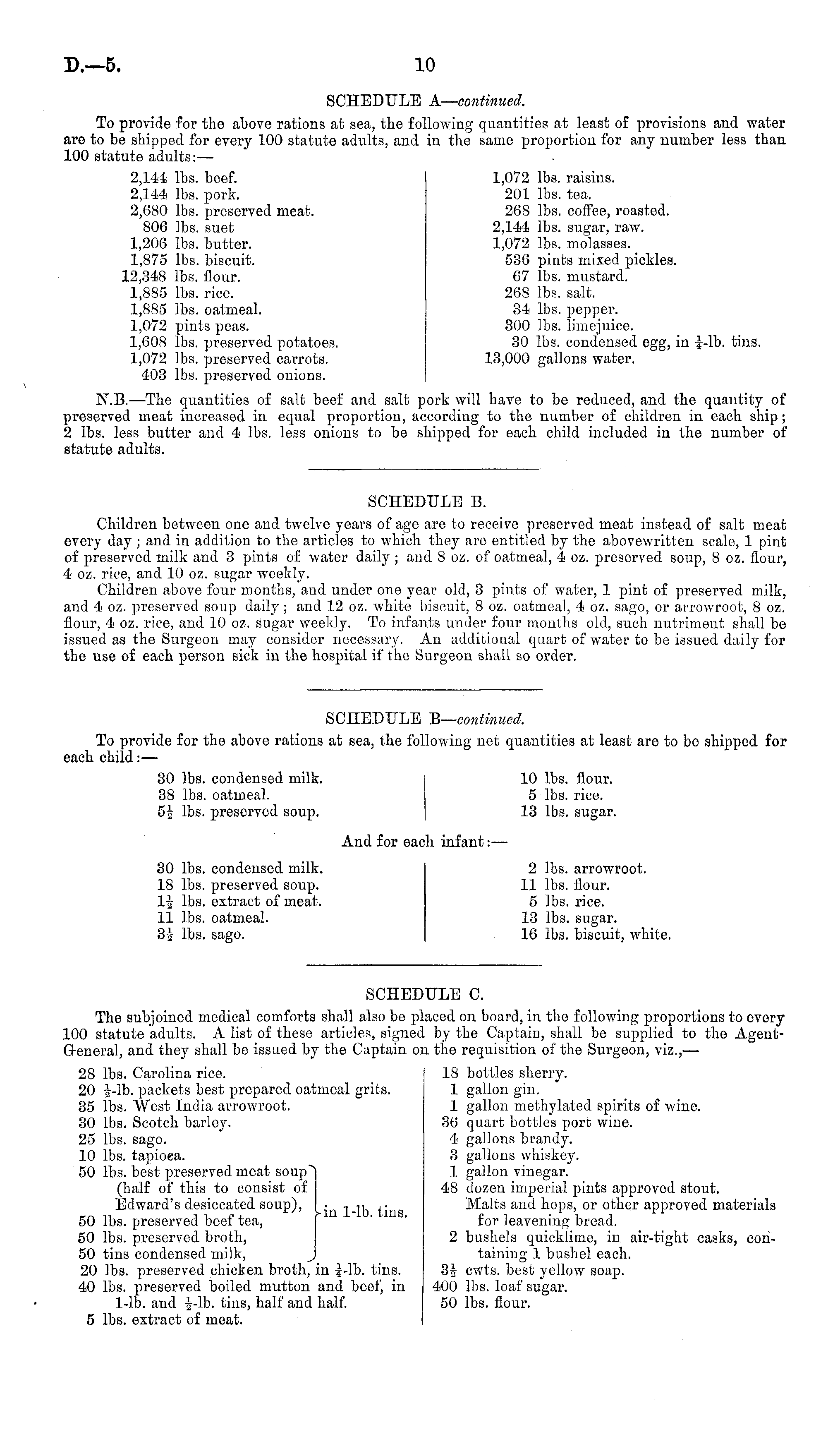 SCHEDULE A.—continued. To provide for the above rations at sea, the following quantities at least of provisions and water are to be shipped for every 100 statute adults, and in the same proportion for any number less than 100 statute adults:— 2,144 lbs. beef. 1,072 lbs. raisins. 2,144 lbs. pork. 201 lbs. tea. 2,680 lbs. preserved meat. 268 lbs. coffee, roasted. 806 lbs. suet 2,144 lbs. sugar, raw. 1,206 lbs. butter. 1,072 lbs. molasses. 1,875 lbs. biscuit. 536 pints mixed pickles. 12,348 lbs. flour. 67 lbs. mustard. 1,885 lbs. rice. 268 lbs. salt. 1,885 lbs. oatmeal. 34 lbs. pepper. 1,072 pints peas. 300 lbs. limcjuice. 1,608 lbs. preserved potatoes. 30 lbs. condensed egg, in 1-lb. tins. 1,072 lbs. preserved carrots. 13,000 gallons water. 403 lbs. preserved onions. N.B.—The quantities of salt beef and salt pork will have to be reduced, and the quantity of preserved meat increased in equal proportion, according to the number of children in each ship; 2 lbs. less butter and 4 lbs. less onions to be shipped for each child included in the number of statute adults.