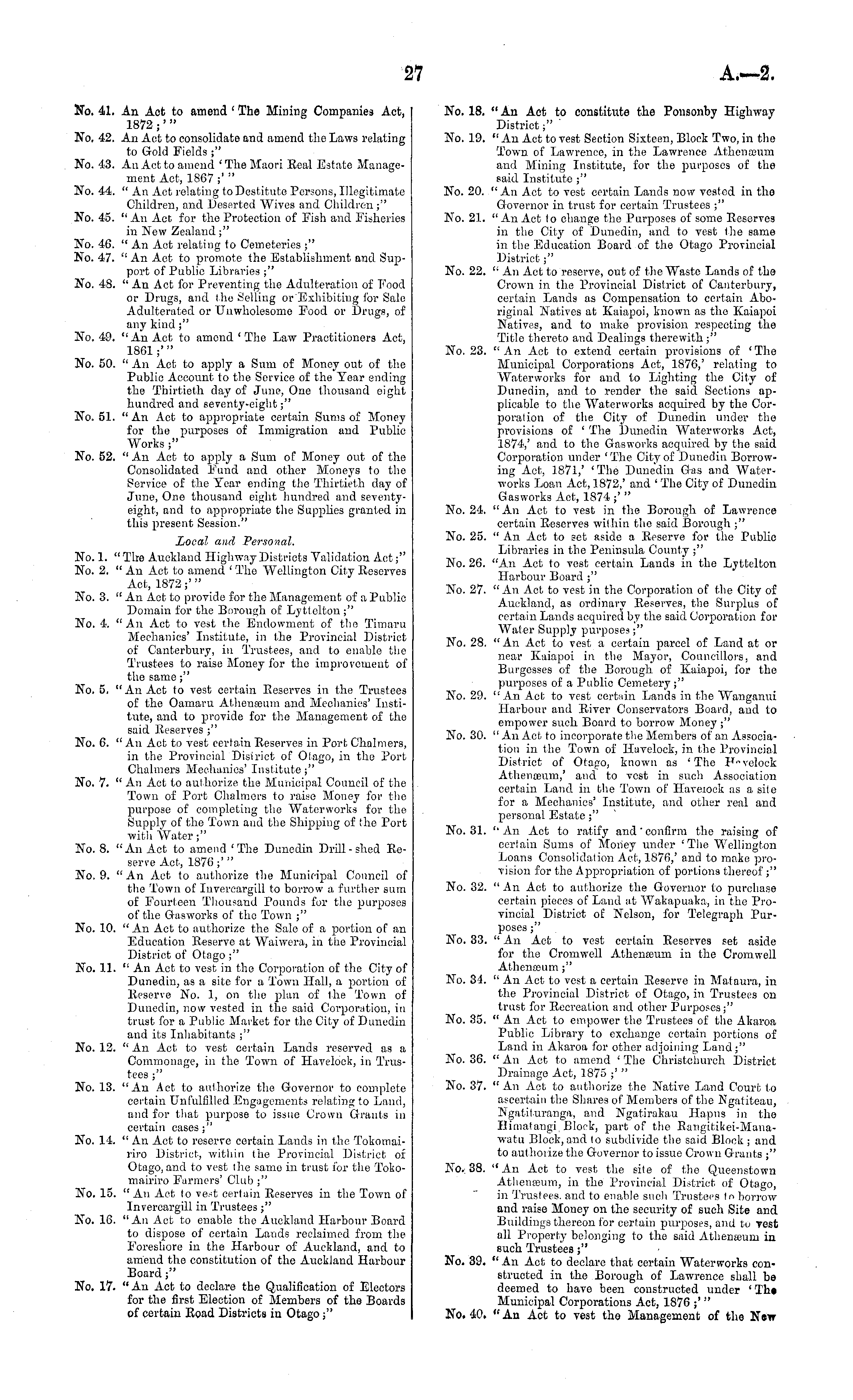 No. 18. "An Act to constitute the Ponsonby Highway District;" No. 19. "An Act to vest Section Sixteen, Block Two, in the Town of Lawrence, in the Lawrence Athenceum and Mining Institute, for the purposes of the said Institute ;" No. 20. "An Act to vest certain Lands now vested in the Governor in trust for certain Trustees ;" No. 21. "An Act to change the Purposes of some Reserves in the City of Dunedin, and to vest the same in the Education Board of the Otago Provincial District j" No. 22. " An Act to reserve, out of the Waste Lands of the Crown in the Provincial District of Canterbury, certain Lands as Compensation to certain Aboriginal Natives at Kaiapoi, known as the Kaiapoi Natives, and to make provision respecting the Title thereto and Dealings therewith j" No. 23. "An Act to extend certain provisions of 'The Municipal Corporations Act, 1876,' relating to Waterworks for and to Lighting the City of Dunedin, and to render the said Sections applicable to the Waterworks acquired by the Corporation of the City of Dunedin under the provisions of ' The Dunedin Waterworks Act, 1874,' and to the Gasworks acquired by the said Corporation under 'The City of Dunedin Borrowing Act, 1871,' 'The Dunedin Gas and Waterworks Loan Act, 1872,' and ' The City of Dunedin Gasworks Act, 1874 ;' " No. 24. "An Act to vest in the Borough of Lawrence certain Reserves within the said Borough ;" No. 25. " An Act to set aside a Reserve for the Public Libraries in the Peninsula County ;" No. 26. "An Act to vest certain Lands in the Lyttelton Harbour Board ;" No. 27. "An Act to vest in the Corporation of the City of Auckland, as ordinary Reserves, the Surplus of certain Lands acquired by the said Corporation for Water Supply purposes;" No. 28. "An Act to vest a certain parcel of Land at or near Kaiapoi in the Mayor, Councillors, and Burgesses of the Borough of Kaiapoi, for the purposes of a Public Cemetery;" No. 29. "An Act to vest certain Lands in the Wanganui Harbour and River Conservators Board, and to empower such Board to borrow Money;" No. 30. "An Act to incorporate the Members of an Association in the Town of Havelock, in the Provincial District of Otago, known as 'The I T"velock Athenceum,' and to vest in such Association certain Land in the Town of Haveiock as a site for a Mechanics' Institute, and other real and personal Estate;" No. 31. "An Act to ratify and'confirm the raising of certain Sums of Money under 'The Wellington Loans Consolidation Act, 1876,' and to make provision for the Appropriation of portions thereof;" No. 32. " An Act to authorize the Governor to purchase certain pieces of Land at Wakapuaka, in the Provincial District of Nelson, for Telegraph Purposes ;" No. 33. "An Act to vest certain Reserves set aside for the Cromwell Athenceum in the Cromwell Athenceum ;" No. 31. " An Act to vest a certain Reserve in Mataura, in the Provincial District of Otago, in Trustees on trust for Recreation and other Purposes;" No. 35. " An Act to empower the Trustees of the Akaroa Public Library to exchange certain portions of Land in Akaroa for other adjoining Land;" No. 36. " An Act to amend ' The Christehurch District Drainage Act, 1875 ;' " No. 37. " An Act to authorize the Native Land Court to ascertain the Shares of Members of the Ngatiteau, Ngatiluranga, and Ngatirakau Hapus in the Himatangi Block, part of the Rangitikei-Mana-watu Block, and to subdivide the said Block ; and to authorize the Governor to issue Crown Grants ;" No. 38. "An Act to vest the site of the Qucenstown Athenceum, in the Provincial District of Otago, in Trustees, and to enable such Trustees to borrow and raise Money on the security of such Site and Buildings thereon for certain purposes, and to vest all Property belonging to the said Athenceum in such Trustees;" No. 39. "An Act to declare that certain Waterworks constructed in the Borough of Lawrence shall be deemed to have been constructed under ' Th« Municipal Corporations Act, 1876 ;' " No. 40. "An Act to vest tho Management of the New