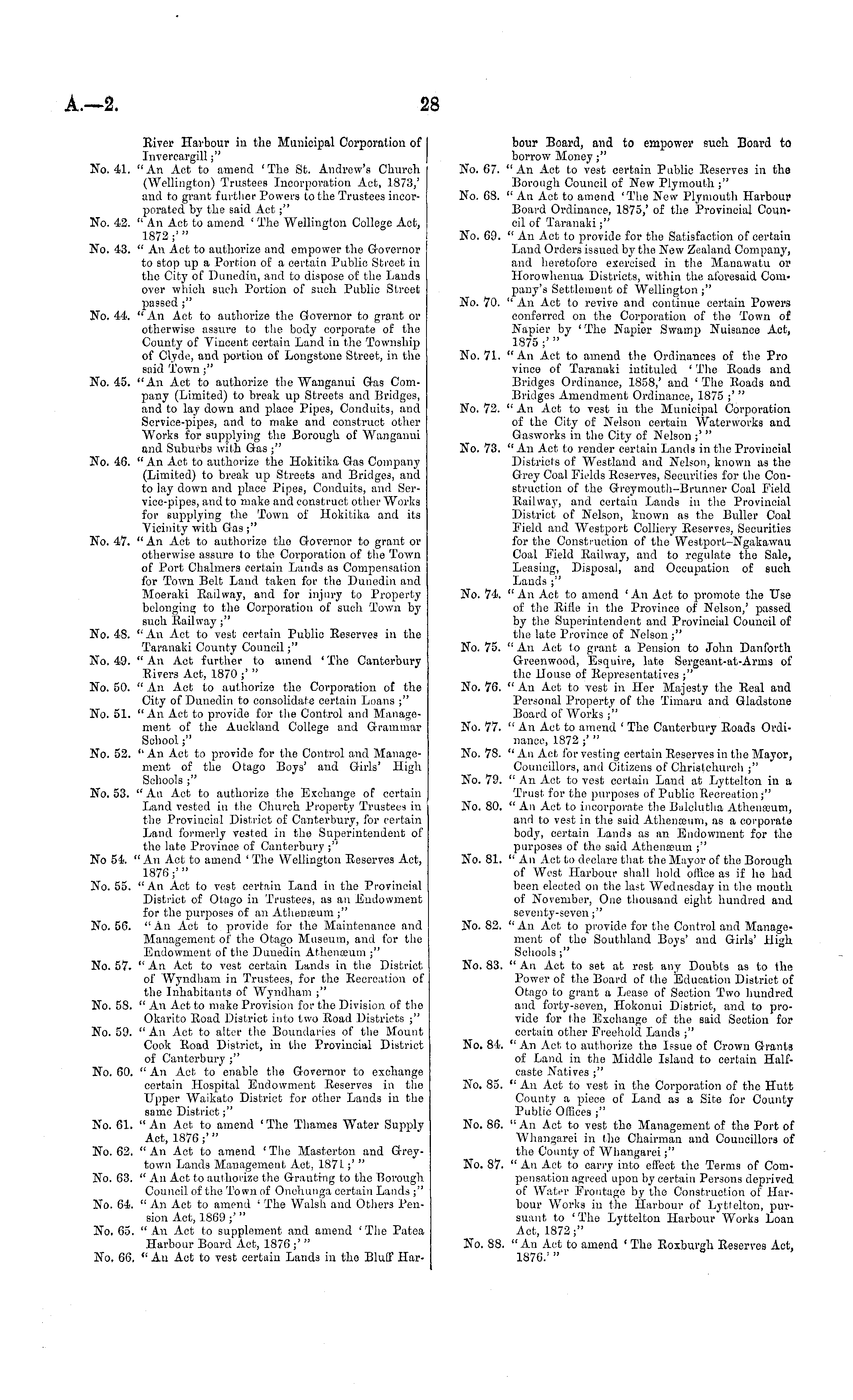 River Harbour in the Municipal Corporation of Invercargill;" No. 41. "An Act to amend 'The St. Andrew's Church (Wellington) Trustees Incorporation Act, 1873,' and to grant further Powers to the Trustees incorporated by the said Act;" No. 42. " An Act to amond ' The Wellington College Act, 1872;'" No. 43. " An Act to authorize and empower the Governor to stop up a Portion of a certain Public Street in the City of Dunedin, and to dispose of the Lands over which such Portion of such Public Street passed;" No. 44. "An Act to authorize the Governor to grant or otherwise assure to the body corporate of the County of Vincent certain Land in the Township of Clyde, and portion of Longstone Street, in the said Town;" No. 45. "An Act to authorize the Wanganui Gas Company (Limited) to break up Streets and Bridges, and to lay down and place Pipes, Conduits, and Service-pipes, and to make and construct other Works for supplying the Borough of Wanganui and Suburbs with Gas ;" No. 46. "An Act to authorize the Hokitika Gas Company (Limited) to break up Streets and Bridges, and to lay down and place Pipes, Conduits, and Ser-vice-pipes, and to make and construct other Works for supplying the Town of Hokitika and its Vicinity with Gas;" No. 47. "An Act to authorize tho Governor to grant or otherwise assure to the Corporation of the Town of Port Chalmers certain Lands as Compensation for Town Belt Land taken for the Dunedin and Moeraki Railway, and for injury to Property belonging to the Corporation of such Town by such Railway;" No. 48. "An Act to vest certain Public Reserves in the Taranaki County Council;" No. 49. "An Act further to amend ' The Canterbury Rivers Act, 1870 ;' " No. 50. "An Act to authorize the Corporation of the City of Dunedin to consolidate certain Loans ;" No. 51. "An Act to provide for the Control and Management of the Auckland College and Grammar School;" No. 52. "An Act to provide for the Control and Management of the Otago Boys' and Girls' High Schools;" No. 53. " An Act to authorize the Exchange of certain Land vested in the Church Property Trustees in the Provincial District of Canterbury, for certain Land formerly vested in the Superintendent of the late Province of Canterbury ;" No 54. "An Act to amend ' The Wellington Reserves Act, 1876;'" No. 55. "An Act to vest certain Land in the Provincial District of Otago in Trustees, as an Endowment for the purposes of an Athenceum ;" No. 56. "An Act to provide for the Maintenance and Management of the Otago Museum, and for the Endowment of the Dunedin Athenceum ;" No. 57. "An Act to vest certain Lands in the District of Wyndham in Trustees, for the Recreation of the Inhabitants of Wyndham ;" No. 58. " An Act to make Provision for the Division of the Okarito Road District into two Road Districts ;" No. 59. " An Act to alter the Boundaries of the Mount Cook Road District, in the Provincial District of Canterbury ;" No. 60. "An Act to enable the Governor to exchange certain Hospital Endowment Reserves in the Upper Waikato District for other Lands in the same District;" No. 61. " An Act to amend ' The Thames Water Supply Act, 1876;'" No. 62. "An Act to amend 'The Masterton and Greytown Lands Management Act, 1871;' " No. 63. " An Act to authorize the Granting to the Borough Council of the Town of Onehunga certain Lands ;" No. 64. " An Act to amend ' The Walsh and Others Pension Act, 1869 ;' " No. 65. " An Act to supplement and amend 'The Patea Harbour Board Act, 1876 ;' " No. 66. " An Act to vest certain Lands in the Bluff Har-