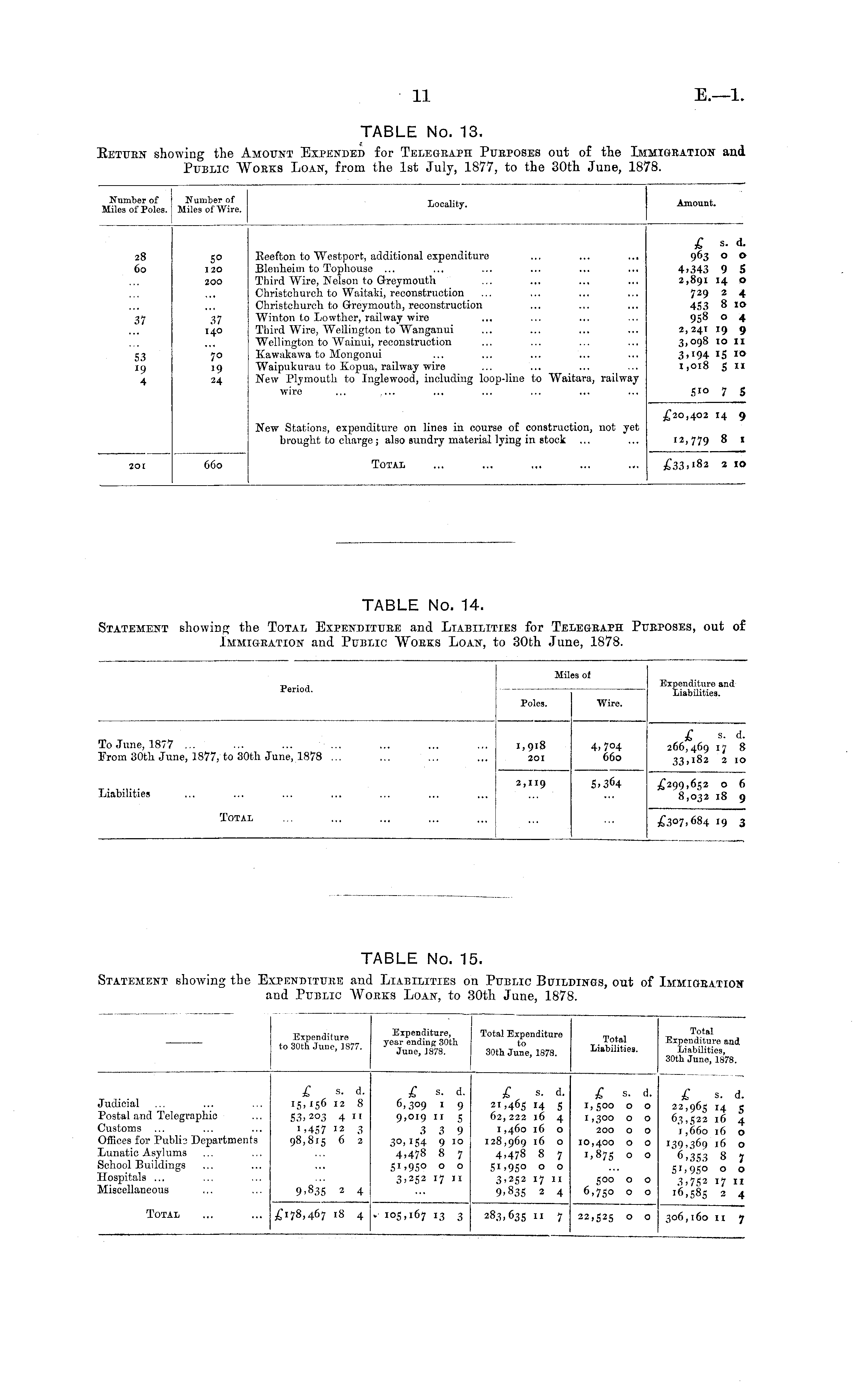 TABLE No. 13. RETURN showing the AMOUNT EXPENDED for TELEGRAPH PURPOSES out of the IMMIGRATION and PUBLIC WORKS LOAN, from the 1st July, 1877, to the 30th June, 1878.