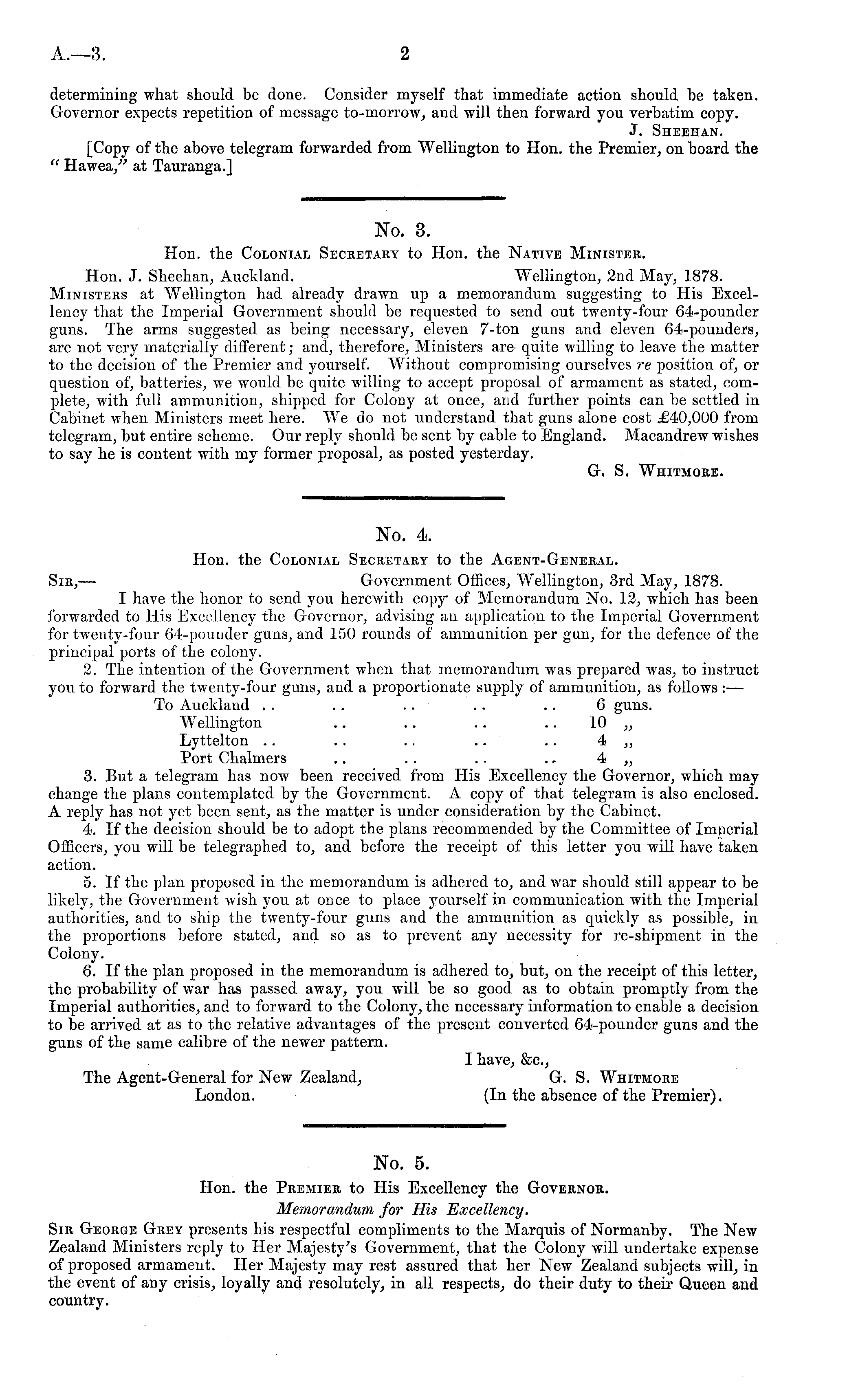 No. 3. Hon. the Colonial Secretary to Hon. the Native Minister. Hon. J. Sheehan, Auckland. Wellington, 2nd May, 1878. Ministers at Wellington had already drawn up a memorandum suggesting to His Excellency that the Imperial Government should be requested to send out twenty-four 64-pounder guns. The arms suggested as being necessary, eleven 7-ton guns and eleven 64-pounders, are not very materially different; and, therefore, Ministers are quite willing to leave the matter to the decision of the Premier and yourself. Without compromising ourselves re position of, or question of, batteries, we would be quite willing to accept proposal of armament as stated, complete, with full ammunition, shipped for Colony at once, and further points can be settled in Cabinet when Ministers meet here. We do not understand that guns alone cost £40,000 from telegram, but entire scheme. Our reply should be sent by cable to England. Macandrew wishes to say he is content with my former proposal, as posted yesterday. G. S. Whitmore.