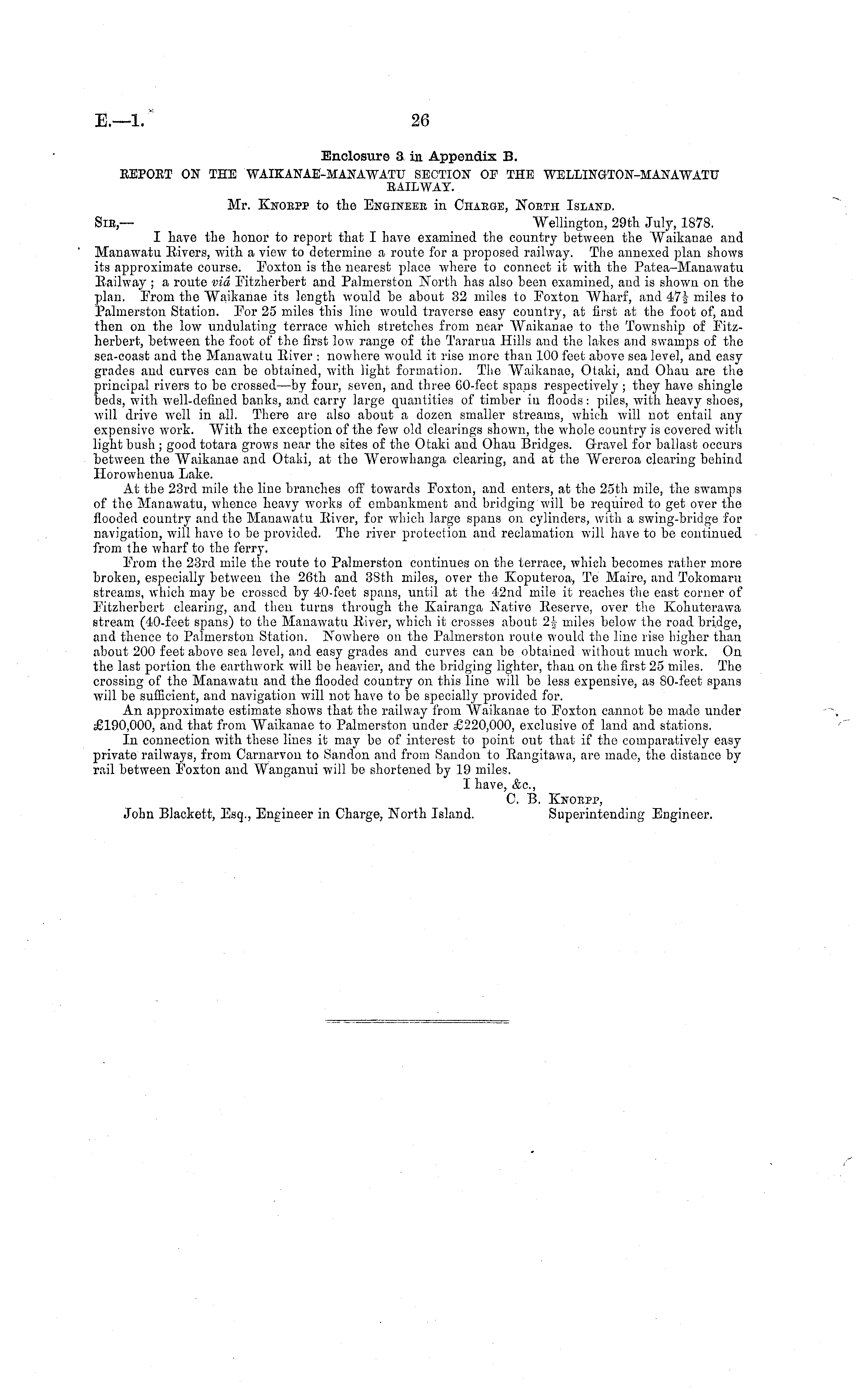 Enclosure 3 in Appendix B. EEPOET ON THE WAIKANAE-MANAWATU SECTION OP THE WELLING-TON-MANAWATU EAILWAY. Mr. Knorpp to the Engineer in Charge, North Island. Bib,— Wellington, 29th July, 1878. I have the honor to report that I have examined the country between the Waikanae and Manawatu Eivers, with a view to determine a route for a proposed railway. The annexed plan shows its approximate course. Foxton is the nearest place where to connect it with the Patea-Manawatu Eailway ; a route via Fitzherbert and Palmerston North has also been examined, and is shown on the plan. From the Waikanae its length would be about 32 miles to Foxton Wharf, and 47| miles to Palmerston Station. For 25 miles this line would traverse easy country, at first at the foot of, and then on the low undulating terrace which stretches from near Waikanae to the Township of Fitzherbert, between the foot of the first low range of the Tararua Hills and the lakes and swamps of the sea-coast and the Manawatu Eiver : nowhere would it rise more than 100 feet above sea level, and easy grades and curves can be obtained, with light formation. The Waikanae, Otaki, and Ohau are the principal rivers to be crossed —by four, seven, and three CO-feet spans respectively ; they have shingle beds, with well-defined banks, and carry large quantities of timber in floods: piles, with heavy shoes, will drive well in all. There are also about a dozen smaller streams, which will not entail any expensive work. With the exception of the few old clearings shown, the whole country is covered with light bush ; good totara grows near the sites of the Otaki and Ohau Bridges. Gravel for ballast occurs hetween the Waikanae and Otaki, at the Werowhanga clearing, and at the Wereroa clearing behind Horowhenua Lake. At the 23rd mile the line branches off towards Foxton, and enters, at the 25th mile, the swamps of the Manawatu, whence heavy works of embankment and bridging will be required to get over the flooded country and the Manawatu Eiver, for which large spans on cylinders, with a swing-bridge for navigation, will have to be provided. The river protection and reclamation will have to be continued from the wharf to the ferry. From the 23rd mile the I'oute to Palmerston continues on the terrace, which becomes rather more broken, especially between the 26th and 38th miles, over the Koputeroa, Te Maire, and Tokomaru streams, which may be crossed hy 40-feet spans, until at the 42nd mile it reaches the east corner of Fitzherbert clearing, and then turns through the Kairanga Native Eeserve, over the Kohuterawa stream (40-feet spans) to the Manawatu Eiver, which it crosses about 2\ miles below the road bridge, and thence to Palmerston Station. Nowhere on the Palmerston route would the line rise higher than about 200 feet above sea level, and easy grades and curves can be obtained without much work. On the last portion the earthwork will bo heavier, and the bridging lighter, than on the first 25 miles. The crossing of the Manawatu and the flooded country on this line will be less expensive, as 80-feet spans will bo sufficient, and navigation will not have to be specially provided for. An approximate estimate shows that the railway from Waikanae to Foxton cannot be made under £190,000, and that from Waikanae to Palmerston under £220,000, exclusive of land and stations. In connection with these lines it may be of interest to point out that if the comparatively easy private railways, from Carnarvon to Sandon and from Sandon to Eangitawa, are made, the distance by rail between Foxton and AVanganui will be shortened by 19 miles. I have, &c, C. B. Knorpp, John Blackett, Esq., Engineer in Charge, North Island. Superintending Engineer.