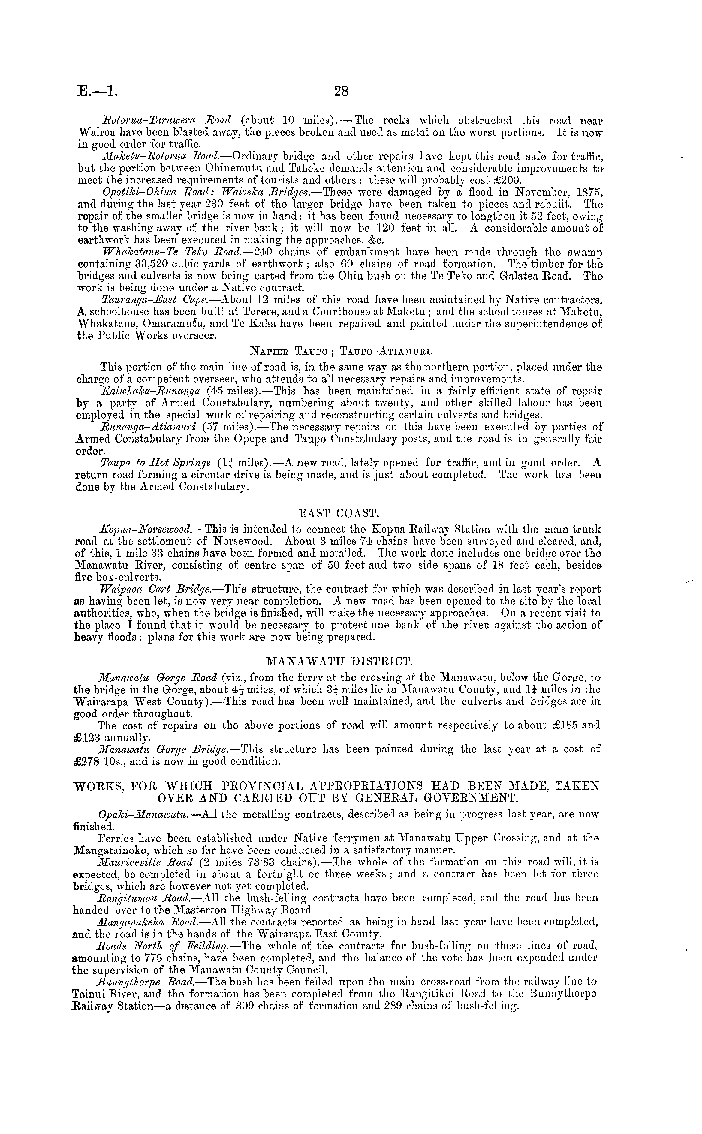 Rotorua-Tarawera Road (about 10 miles). —The rocks which obstructed this road near Wairoa have been blasted away, the pieces broken and used as metal on the worst portions. It is now in good order for traffic. Maketu-Rotorua Road. —Ordinary bridge and other repairs have kept this road safe for traffic, but the portion between Ohinemutu and Taheke demands attention and considerable improvements to meet the increased requirements of tourists and others : these will probably cost £200. Opotiki-Ohhva Road: Waioeka Bridges. —These were damaged by a flood in November, 1875, and during the last year 230 feet of the larger bridge have been taken to pieces and rebuilt. The repair of the smaller bridge is now in hand: it has been found necessary to lengthen it 52 feet, owing to the washing away of the river-bank; it will now be 120 feet in all. A considerable amount of earthwork has heen executed in making the approaches, &c. Whakatane-Te Teko Road.— 24o chains of embankment have heen made through the swamp containing 33,520 cubic yards of earthwork; also 60 chains of road formation. The timber for the bridges and culverts is now heing carted from the Ohiu bush on the Te Teko and Galatea Eoad. The work is being done under a Native contract. Tauranga-Bast Cape.- —About 12 miles of this road have been maintained by Native contractors. A schoolhouse has been built at Torero, and a Courthouse at Maketu ; and the schoolhouses at Maketn, Whakatane, Omaramufu, and Te Kaha have been repaired and painted under the superintendence of the Public Works overseer. Napier-Tatjpo ; Taupo-Atiamt/ri. This portion of the main line of road is, in the same way as the northern portion, placed under tho charge of a competent overseer, who attends to all necessary repairs and improvements. liaiiohaka-Runanga (45 miles).' —This has been maintained in a fairly efficient state of repair by a party of Armed Constabulary, numbering about twenty, and other skilled labour has been employed in the special work of repairing and reconstructing certain culverts and bridges. Runanga-Atiamuri (57 miles). —The necessary repairs on this have been executed by parties of Armed Constabulary from the Opepe and Taupo Constabulary posts, and the road is in generally fair order. Taupo to Hot Springs (If miles). —A new road, lately opened for traffic, and in good order. A return road forming a circular drive is heing made, and is just about completed. The work has been done by the Armed Constabulary. EAST COAST. Kopua-Norsewood. —This is intended to connect the Kopua Eailway Station with the main trunk road at the settlement of Norsewood. About 3 miles 74 chains have been surveyed and cleared, and, of this, 1 mile 33 chains have been formed and metalled. The work done includes one bridge over tho Manawatu Eiver, consisting of centre span of 50 feet and two side spans of 18 feet each, besides five box-culverts. Waipaoa Cart Bridge. —This structure, the contract for which was described in last year's report as having been let, is now very near completion. A new road has been opened to the site by the local authorities, who, when the bridge is finished, will make the necessary approaches. On a recent visit to the place I found that it would be necessary to protect one bank of the river, against the action of heavy floods : plans for this work are now heing prepared. MANAWATU DISTEICT. Manawatu Gorge Road (viz., from the ferry at the crossing at the Manawatu, below the Gorge, to the bridge in the Gorge, about 4-J- miles, of which Z\ miles lie in Manawatu County, and li miles in the Wairarapa West County). —This road has been well maintained, and the culverts and bridges are in good order throughout. The cost of repairs on the above portions of road will amount respectively to about £185 and £123 annually. Manawatu Gorge Bridge. —This structure has been painted during the last year at a cost of £278 10s., and is now in good condition. WORKS, FOE WHICH PEOVINCIAL APPEOPEIATIONS HAD BEEN MADE. TAKEN OVEE AND CAEEIED OUT BY GENERAL GOVERNMENT. Opaki-Manawatu. —All the metalling contracts, described as being in progress last year, are now finished. Ferries have heen established under Native ferrymen at Manaw ratu Upper Crossing, and at tho Mangatainoko, which so far have heen conducted in a satisfactory manner. Mauriceville Road (2 miles 7383 chains). —The whole of the formation on this road will, it is expected, be completed in about a fortnight or three weeks ; and a contract has been let for three bridges, which are however not yet completed. Rangitumau Road. —All the hush-felling contracts have been completed, and the road has been handed over to the Masterton Highway Board. MangapaJceha Road. —All the contracts reported as being in hand last year have been completed, and the road is in the hands of the Wairarapa East County. Roads North of Peilding. —The whole of the contracts for bush-felling on these lines of road, amounting to 775 chains, have been completed, and the balance of the vote has been expended under the supervision of the Manawatu County Council. Bunnythorpe Road. —The bush has been felled upon the main cross-road from the railway line to Tainui Eiver, and the formation has been completed from the Eangitikei Eoad to the Bunnythorpe Railway Station —a distance of 309 chains of formation and 289 chains of bush-felling.
