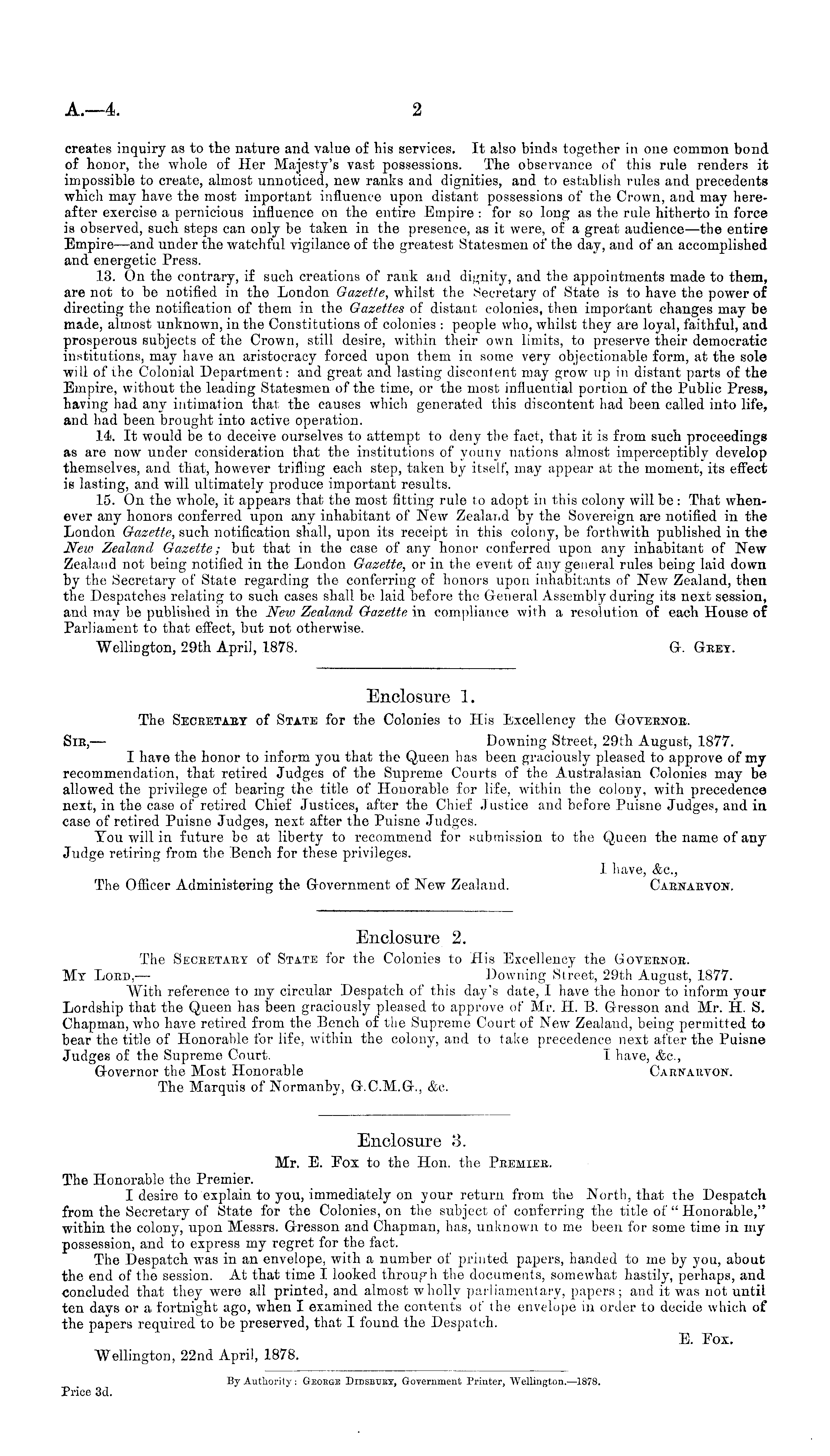 Enclosure 3. Mr. E. Pox to the Hon. the Peemiee. The Honorable the Premier. I desire to explain to you, immediately on your return from the North, that the Despatch from the Secretary of State for the Colonies, on the subject of conferring the title of " Honorable," within the colony, upon Messrs. Gresson and Chapman, has, unknown to me been for some time in my possession, and to express my regret for the fact. The Despatch was in an envelope, with a number of printed papers, handed to me by you, about the end of the session. At that time I looked through the documents, somewhat hastily, perhaps, and concluded that they were all printed, and almost wholly parliamentary, papers ; and it was not until ten days or a fortnight ago, when I examined the contents of the envelope in order to decide which of the papers required to be preserved, that I found the Despatch. E. Fox. Wellington, 22nd April, 1878. By Authority: Geokge Didsbuht, Government Printer, Wellington.—lB7B. Price 3d.