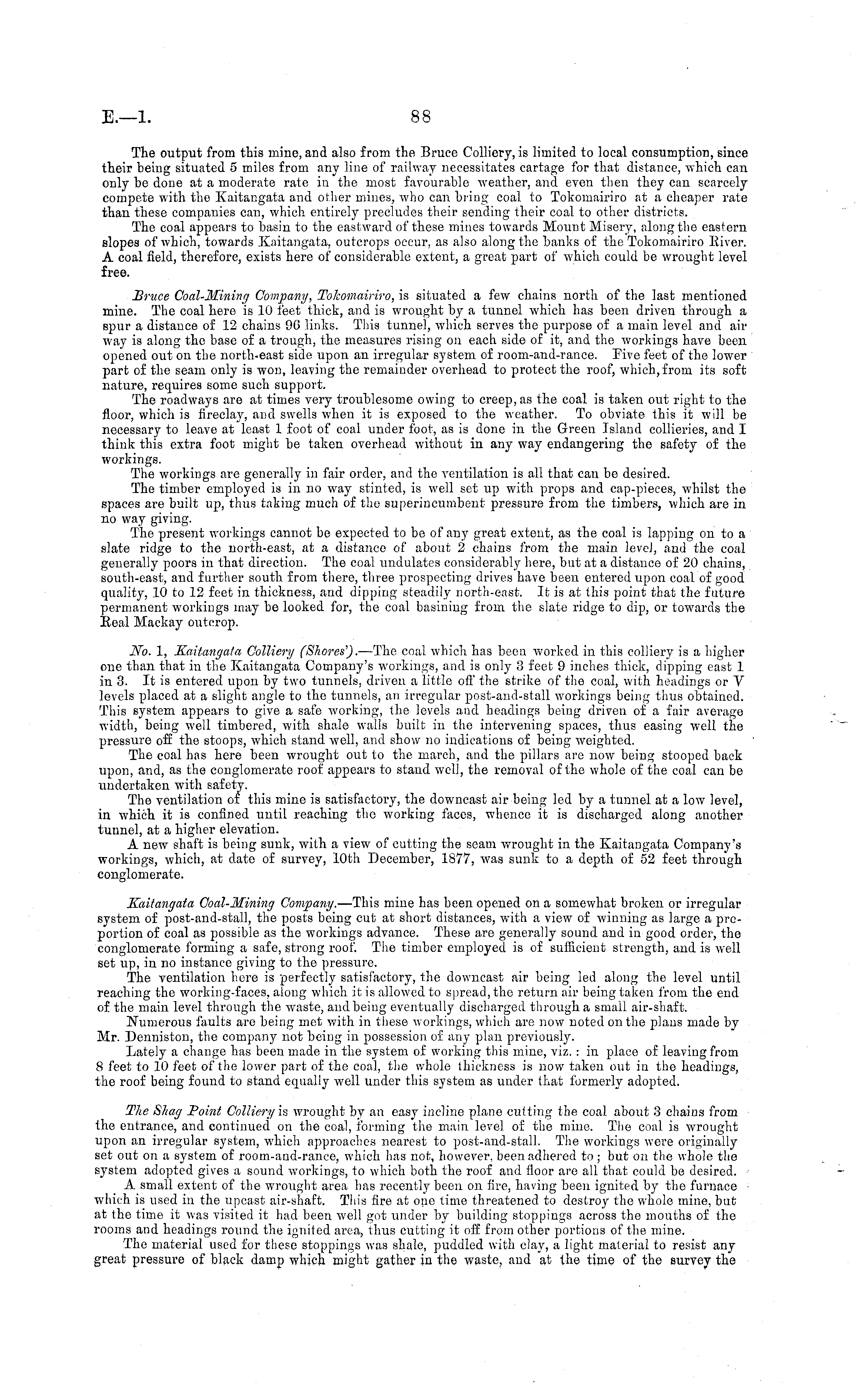 The output from this mine, and also from the Bruce Colliery, is limited to local consumption, since their being situated 5 miles from any line of railway necessitates cartage for that distance, which can only be done at a moderate rate in the most favourable weather, and even then they can scarcely compete with the Kaitangata and other mines, who can bring coal to Tokomairiro at a cheaper rate than these companies can, which entirely precludes their sending their coal to other districts. The coal appears to basin to the eastward of these mines towards Mount Misery, along the eastern slopes of which, towards Kaitangata, outcrops occur, as also along the banks of the Tokomairiro Eiver. A coal field, therefore, exists here of considerable extent, a great part of which could be wrought level free. Bruce Coal-Mining Company, Tokomairiro, is situated a few chains north of the last mentioned mine. The coal here is 10 feet thick, and is wrought by a tunnel which has been driven through a spur a distance of 12 chains 96 links. This tunnel, which serves the purpose of a main level and air way is along the base of a trough, the measures rising on each side of it, and the workings have been opened out on the north-east side upon an irregular system of room-and-rance. Five feet of the lower part of the seam only is won, leaving the remainder overhead to protect the roof, which, from its soft nature, requires some such support. The roadways are at times very troublesome owing to creep, as the coal is taken out right to the floor, which is fireclay, and swells when it is exposed to the weather. To obviate this it will be necessary to leave at least 1 foot of coal under foot, as is done in the Green Island collieries, and I think this extra foot might be taken overhead without in any way endangering the safety of the workings. The workings are generally in fair order, and the ventilation is all that can be desired. Tho timber employed is in no way stinted, is well set up with props and cap-pieces, whilst the spaces are built up, thus taking much of the superincumbent pressure from the timbers, which are in no way giving. Tho present workings cannot be expected to be of any great extent, as the coal is lapping on to a slate ridge to the north-east, at a distance of about 2 chains from the main level, and the coal generally poors in that direction. The coal undulates considerably here, but at a distance of 20 chains, south-east, and further south from there, three prospecting drives have been entered upon coal of good quality, 10 to 12 feet in thickness, and dipping steadily north-east. It is at this point that the future permanent workings may be looked for, the coal basining from the slate ridge to clip, or towards the Eeal Mackay outcrop. No. 1, Kaitangata Colliery (Shores'). —The coal which has been worked in this colliery is a higher one than that in the Kaitangata Company's workings, and is only 3 feet 9 inches thick, dipping east 1 in 3. It is entered upon by two tunnels, driven a little off the strike of the coal, with headings or V levels placed at a slight angle to the tunnels, an irregular post-and-stall workings being thus obtained. This system appears to give a safe working, the levels and headings being driven of a fair average width, being well timbered, with shale walls built in the intervening spaces, thus easing well the pressure off tho stoops, which stand well, and show no indications of being weighted. The coal has here been wrought out to the march, and the pillars are now being stooped back upon, and, as the conglomerate roof appears to stand well, the removal of the whole of the coal can be undertaken with safety. The ventilation of this mine is satisfactory, the downcast air being led by a tunnel at a low level, in which it is confined until reaching the working faces, whence it is discharged along another tunnel, at a higher elevation. A new shaft is being sunk, with a view of cutting the seam wrought in the Kaitangata Company's workings, which, at date of survey, 10th December, 1877, was sunk to a depth of 52 feet through conglomerate. Kaitangata Coal-Mining Company. —This mine has been opened on a somewhat broken or irregular system of post-and-stall, the posts being cut at short distances, with a view of winning as large a proportion of coal as possible as the workings advance. These are generally sound and in good order, the conglomerate forming a safe, strong roof. The timber employed is of sufficient strength, and is well set up, in no instance giving to the pressure. The ventilation here is perfectly satisfactory, the downcast air being led along the level until reaching the working-faces, along which it is allowed to spread, the return air being taken from the end of the main level through the waste, and being eventually discharged through a small air-shaft. Numerous faults are being met with in these workings, which are now noted on the plans made by Mr. Denniston, the company not being in possession of any plan previously. Lately a change has been made in the system of working this mine, viz. : in place of leaving from 8 feet to 10 feet of the lower part of the coal, the whole thickness is now taken out in the headings, the roof being found to stand equally well under this system as under that formerly adopted. The Shag Point Colliery is wrought by an easy incline plane cutting the coal about 3 chains from the entrance, and continued on the coal, forming the main level of the mine. The coal is wrought upon an irregular system, which approaches nearest to post-and-stall. The workings were originally set out on a system of room-and-rance, which has not, however, been adhered to ; but on the whole the system adopted gives a sound workings, to which both the roof and floor are all that could be desired. A small extent of the wrought area has recently been on fire, having been ignited by the furnace wdiich is used in the upcast air-shaft. This fire at one time threatened