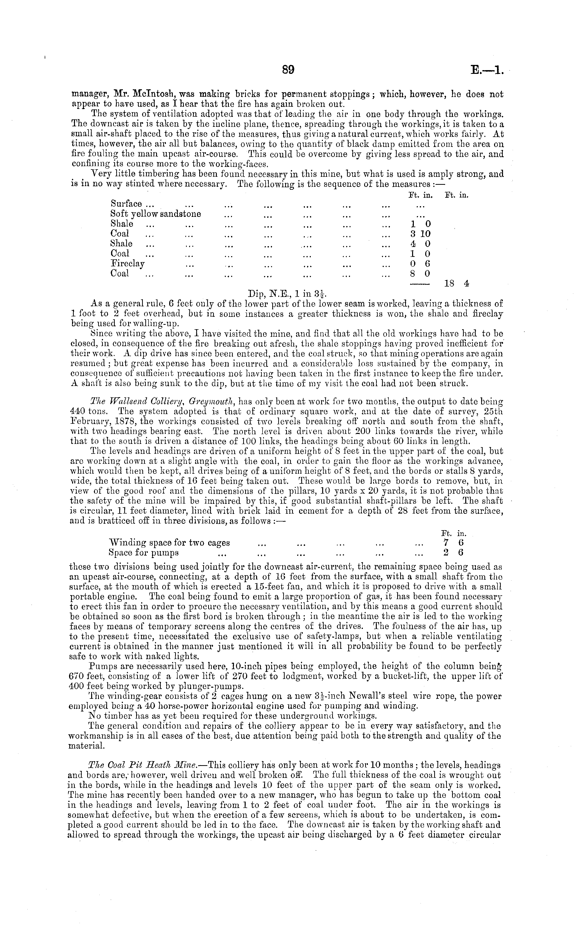 manager, Mr. Mcintosh, was making bricks for permanent stoppings ; which, however, he does not appear to have used, as I hear that the fire has again broken out. The system of ventilation adopted was that of leading the air in one body through the workings. The downcast air is taken by the incline plane, thence, spreading through the workings, it is taken to a small air-shaft placed to the rise of the measures, thus giving a natural current, which works fairly. At times, however, the air all but balances, owing to the quantity of black damp emitted from the area on fire fouling the main upcast air-course. This could be overcome by giving less spread to the air, and confining its course more to the working-faces. Very little timbering has been found necessary in this mine, but what is used is amply strong, and is in no way stinted where necessary. The following is the sequence of the measures : — Ft. in. Ft. in. Surface ... Soft yellow sandstone Shale ... ... ... ... ... ... ... 1 0 Coal ... ... ... ... ... ... ... 3 10 Shale ... ... ... ... .... ... ... 4 0 Coal ... ... ... ... ... ... ... 1 0 Fireclay ... ... ... ... ... ... 0 6 Coal ... ... ... ... ... ... ... 8 0 18 4 Dip, N.E., 1 in 3i As a general rule, 6 feet only of the lower part of the lower seam is worked, leaving a thickness of 1 foot to 2 feet overhead, but in some instances a greater thickness is won, the shale and fireclay being used forwalling-up. Since writing the above, I have visited the mine, and find that all the old workings have had to be closed, in consequence of the fire breaking out afresh, the shale stoppings having proved inefficient for their work. A dip drive has since been entered, and the coal struck, so that mining operations are again resumed ; but great expense has been incurred and a considerable loss sustained by the company, in consequence of sufficient precautions not having been taken in the first instance to keep the fire under. A shaft is also being sunk to the dip, but at the time of my visit the coal had not been struck. The Wallsend Colliery, Greymouth, has only been at work for two months, the output to date being 440 tons. The system adopted is that of ordinary square work, and at the date of survey, 25th February, 1878, the workings consisted of two levels breaking off north and south from the shaft, with two headings bearing east. The north level is driven about 200 links towards the river, while that to the south is driven a distance of 100 links, the headings being about 60 links in length. The levels and headings are driven of a uniform height of 8 feet in the upper part of the coal, but are working down at a slight angle with the coal, in order to gain tho floor as the workings advance, which would then be kept, all drives being of a uniform height of 8 feet, and the bords or stalls 8 yards, wide, the total thickness of 16 feet being taken out. These would be largo bords to remove, but, in view of the good roof and the dimensions of tho pillars, 10 yards x 20 yards, it is not probable that the safety of the mine will be impaired by this, if good substantial shaft-pillars he left. The shaft is circular, 11 feet diameter, lined with brick laid in cement for a depth of 28 feet from the surface, and is bratticed off in three divisions, as follows : —■ Ft. in. Winding space for two cages ... ... ... ... ... 7 6 Space for pumps ... ... ... ... ... ... 2 6 these two divisions being used jointly for the downcast air-current, the remaining space being used as an upcast air-course, connecting, at a depth of 16 feet from the surface, with a small shaft from the surface, at the mouth of which is erected a 15-feet fan, and which it is proposed to drive with a small portable engine. The coal being found to emit a large proportion of gas, it has been found necessary to erect this fan in order to procure the necessary ventilation, and by this means a good current should be obtained so soon as the first bord is broken through ; iv the meantime the air is led to the working faces by means of temporary screens along the centres of the drives. The foulness of the air has, up to the present time, necessitated the exclusive use of safety-lamps, but when a reliable ventilating current is obtained in the manner just mentioned it will in all probability be found to be perfectly safe to work with naked lights. Pumps are necessarily used here, 10-inch pipes being employed, the height of the column being 670 feet, consisting of a lower lift of 270 feet to lodgment, worked by a bucket-lift, the upper lift of 400 feet being worked by plunger-pumps. The winding-gear consists of 2 cages hung on a new 3j-inch Newall's steel wire rope, the power employed being a 40 horse-power horizontal engine used for pumping and winding. ISIo timber has as yet been required for these underground workings. The general condition and repairs of the colliery appear to be in every way satisfactory, and the workmanship is in all cases of the best, due attention being paid both to the strength and quality of the material. The Coal, Pit Heath Mine. —This colliery has only been at work for 10 months ; the levels, headings and bords are,'however, well driven and well broken off. The full thickness of the coal is wrought out in the bords, while in the headings and levels 10 feet of the upper part of the seam only is worked. The mine has recently been handed over to a new manager, who has begun to take up the bottom coal in the headings and levels, leaving from Ito 2 feet of coal under foot. The air in the workings is somewhat defective, but when the erection of a few screens, which is about to be undertaken, is completed a good current should be led in to the face. The downcast air is taken by tho working shaft and allowed to spread through the workings, the upcast air being discharged by a 6 feet diameter circular