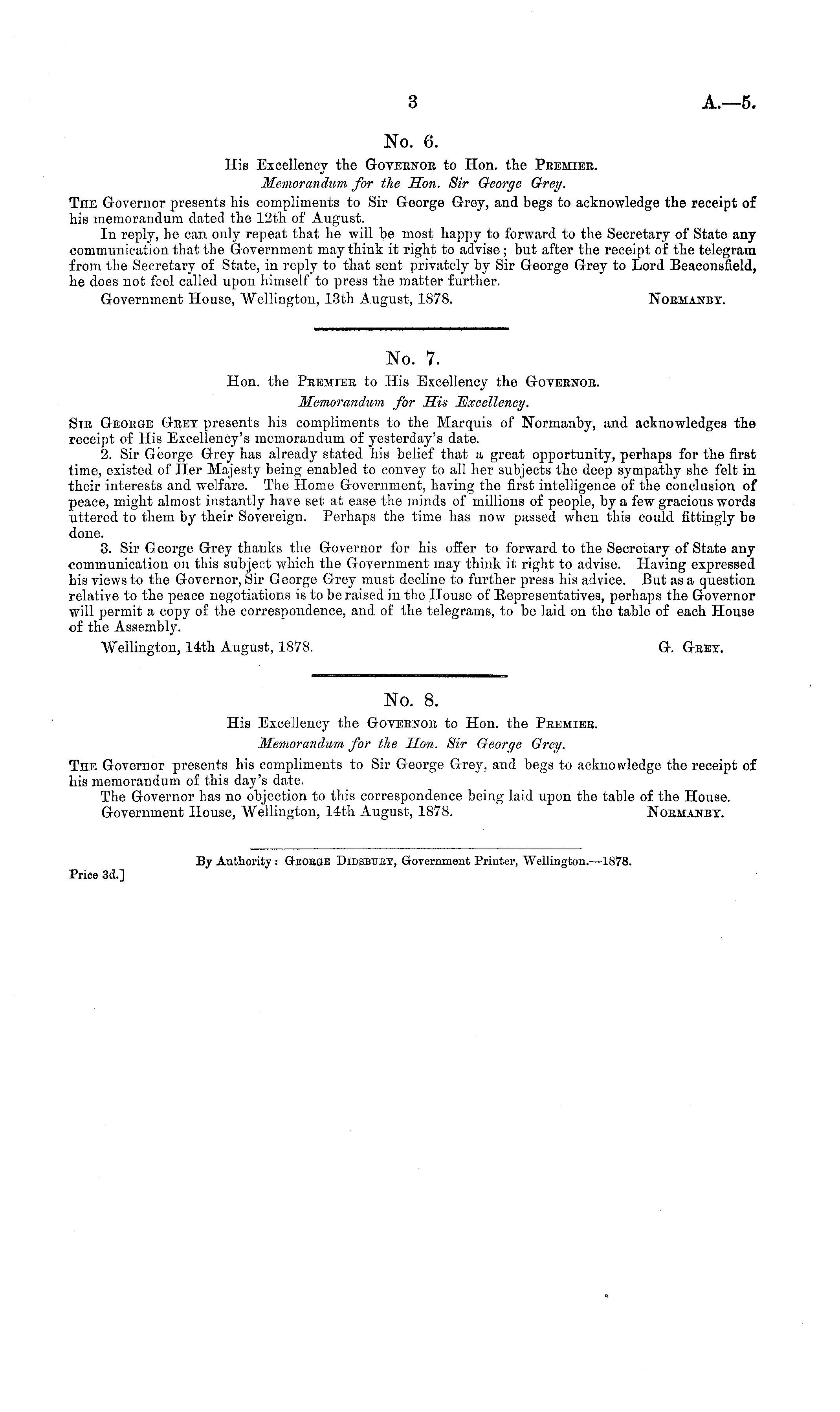 No. 7. Hon. the Premier to His Excellency the Governor. Memorandum for His Excellency. Sir George Grey presents his compliments to the Marquis of Normanby, and acknowledges the receipt of His Excellency's memorandum of yesterday's date. 2. Sir George Grey has already stated his belief that a great opportunity, perhaps for the first time, existed of Her Majesty being enabled to convey to all her subjects the deep sympathy she felt in their interests and welfare. The Home Government, having the first intelligence of the conclusion of peace, might almost instantly have set at ease the minds of millions of people, by a few gracious words uttered to them by their Sovereign. Perhaps the time has now passed when this could fittingly be done. 3. Sir George Grey thanks the Governor for his offer to forward to the Secretary of State any communication on this subject which the Government may think it right to advise. Having expressed his views to the Governor, Sir George Grey must decline to further press his advice. But as a question relative to the peace negotiations is to be raised in the House of Eepresentatives, perhaps the Governor will permit a copy of the correspondence, and of the telegrams, to be laid on the table of each House of the Assembly. Wellington, 14th August, 1878. G. Grey.