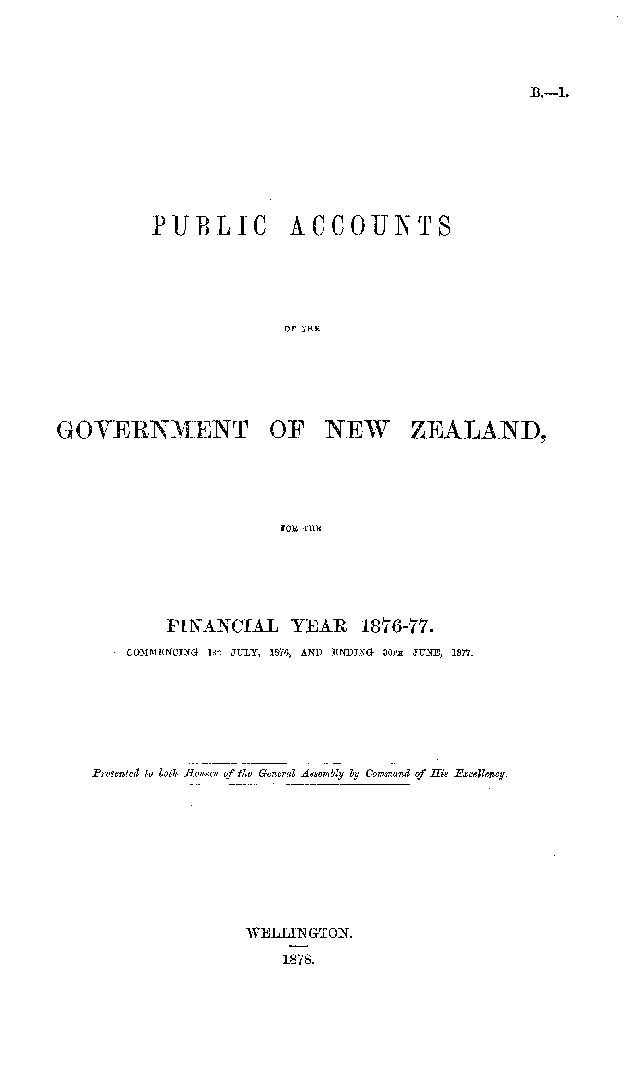 PUBLIC ACCOUNTS OF THE GOVERNMENT OF NEW ZEALAND, FOR THE FINANCIAL YEAR 1876-77. COMMENCING 1ST JULY, 1876, AND ENDING 30TH JUNE, 1877.