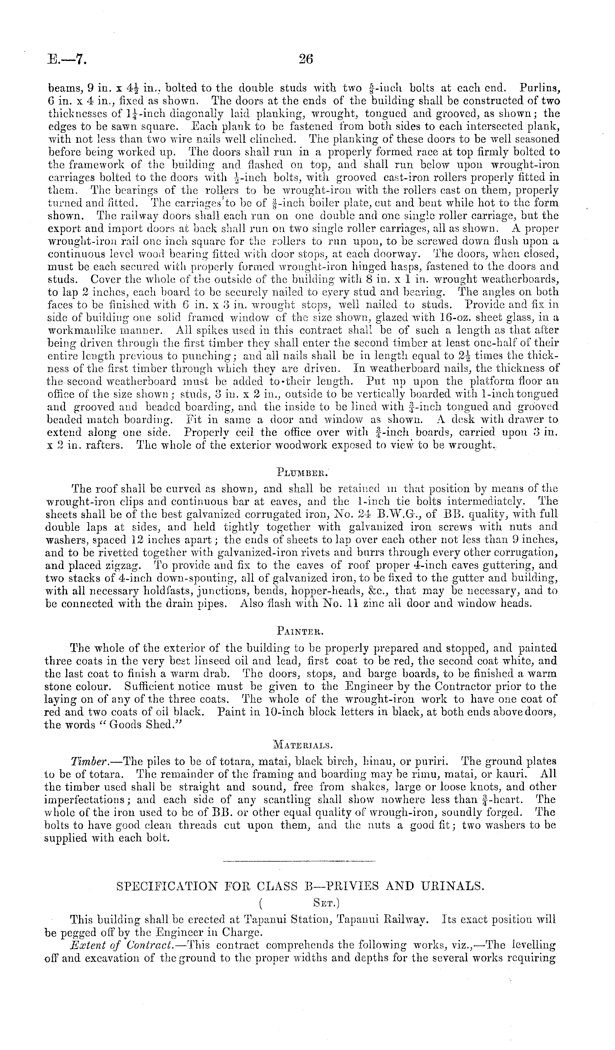 SPECIFICATION FOR CLASS B—PRIVIES AND URINALS. ( Set.) This building shall be erected at Tapanui Station, Tapanui Railway. Its exact position will be pegged off by the Engineer in Charge. Extent of Contract. —This contract comprehends the following works, viz.,—The levelling off and excavation of the ground to the proper widths and depths for the several works requiring