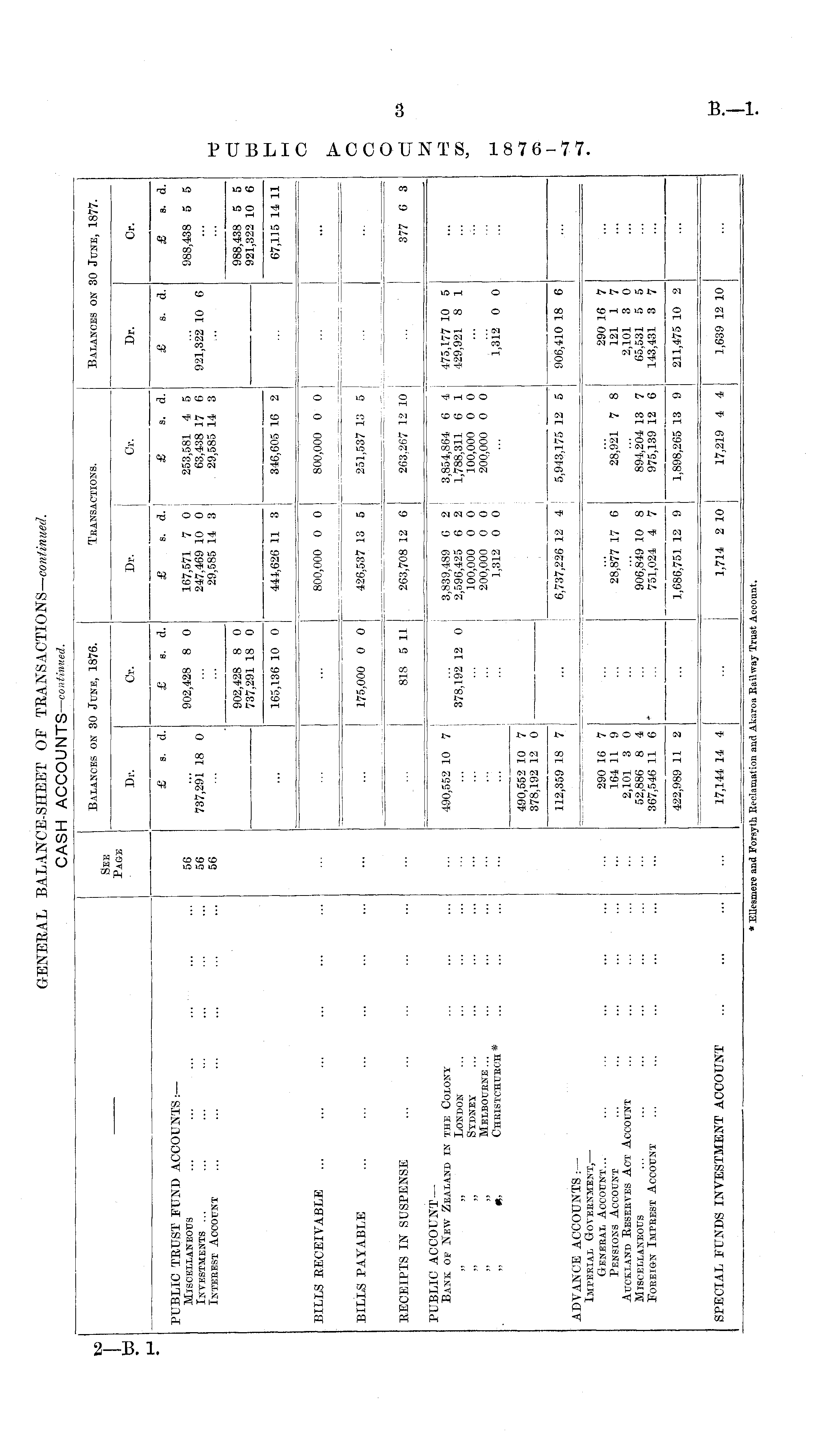 Balances on 30 June, 1876. Transactions. Balances on 30 June, 1877. See Page Dr. Cr. Dr. Cr. Dr. Cr. £ s. d. £ s. d. £ s. d. £ s. d. £ s. d. £ s. d. PUBLIC TRUST FUND ACCOUNTS :— Miscellaneous Investments ... Interest Account 56 56 56 737,291 18 0 902,428 8 0 ... 167,571 7 0 253,581 4 5 247,469 10 0 63,438 17 6 29,585 14 3 29,585 14 3 444,626 11 3 346,605 16 2 I 921,322 10 6 988,438 5 5 ... 902,428 8 0 737,291 18 0 988,438 5 5 921,322 10 6 I 67,115 14 11 BILLS RECEIVABLE ... 165,136 10 0 800,000 0 0 800,000 0 0 BILLS PAYABLE 175,000 0 0 426,537 13 5 251,537 13 5 RECEIPTS IN SUSPENSE 818 5 11 263,708 12 6 263,267 12 10 377 6 3 PUBLIC ACCOUNT — Bank of New Zealand in the Colony „ „ London „ „ Sydney ,, „ Melbourne... „ ., Christohuroh * I 490,552 10 7 I 3,839,489 6 2 378,192 12 0 2,596,425 6 2 100,000 0 0 200,000 0 0 1,312 0 0 3,854,864 6 4 1,788,311 6 1 100,000 0 0 200,000 0 0 475,177 10 5 429,921 8 1 1,312 0 0 490,552 10 7 378,192 12 0 112,359 18 7 6,737,226 12 4 ! i 5,943,175 12 5 ADVANCE ACCOUNTS :— Imperial Government, — General Account... Pensions Account Auckland Reserves Act Account Miscellaneous Foreign Imprest Account 290 16 7 164 11 9 2,101 3 0 52,886 8 4 367,546 11 6 28,877 17 6 28,921 7 8 290 16 7 121 1 7 2,101 3 0 65,531 5 5 143,431 3 7 211,475 10 2 90f,410 18 6 ... 906,849 10 8 751,024 4 7 894,204 13 7 975,139 12 6 422,989 11 2 1,086,751 12 9 I 1,898,265 13 9 ... SPECIAL FUNDS INVESTMENT ACCOUNT 17,144 14 4 1,714 2 10 17,219 4 4 1,639 12 10 * Ellesmere and Fors; 'th Reclamation and Akaroa Railwa; Trust Aci 'Onnt.