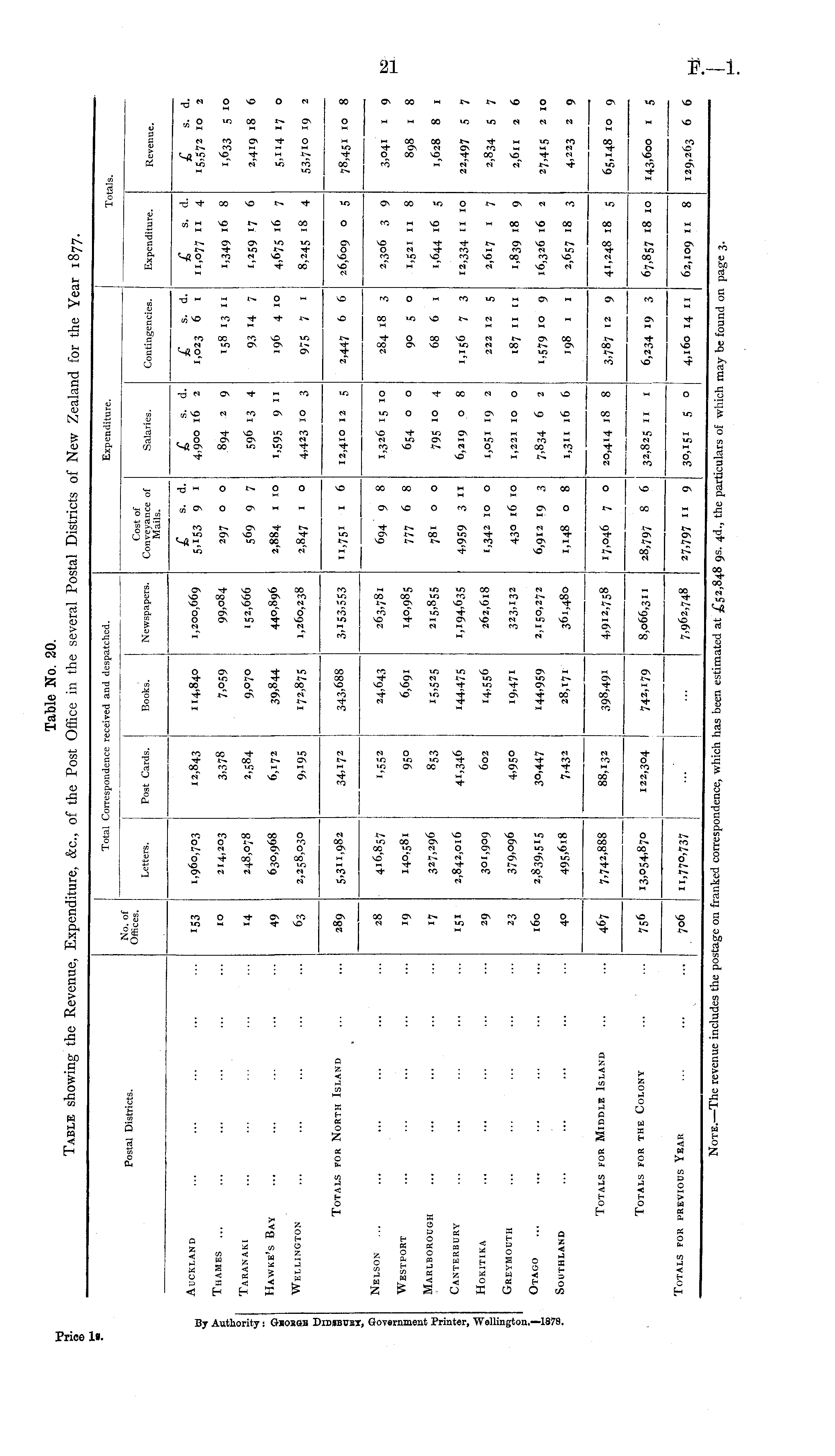 Table No. 20. TABLE showing the Revenue, Expenditure, &c., of the Post Office in the several Postal Districts of New Zealand for the Year 1877.