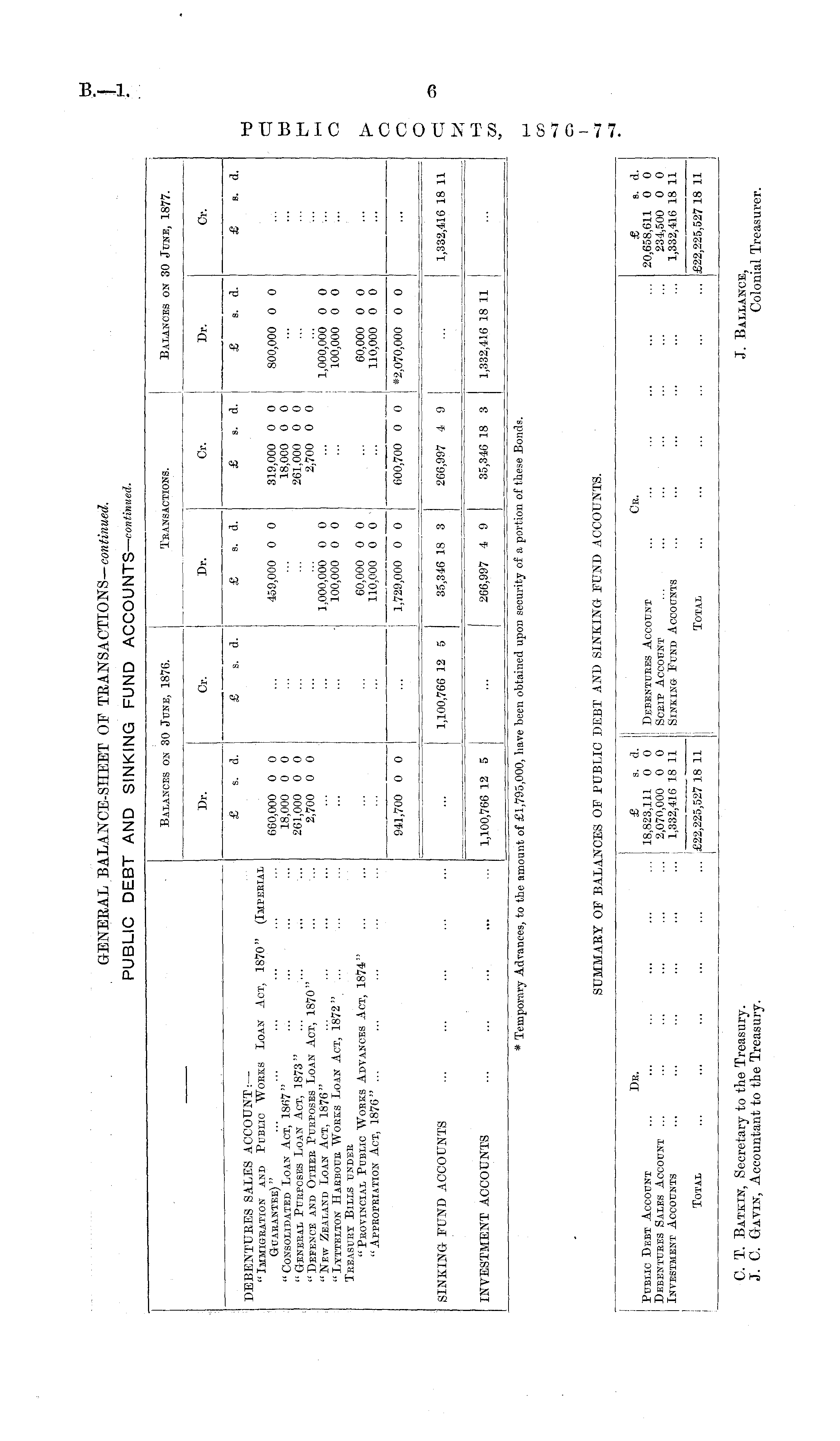Balances on 30 June, 1876. Transactions. Balances on 30 June, 1877. Dr. Cr. Dr. Cr. Dr. Cr. £ s. d. £ s. d. £ s. d. £ s. d. £ s. d. £ s. d. DEBENTURES SALES ACCOUNT:— "Immigration and Public Works Loan Act, 1870" Guarantee)" "Consolidated Loan Act, 1807" "General Burposes Loan Act, 1873" "Defence and Other Burposes Loan Act, 1870" "New Zealand Loan Act, 1876" "Lyttelton Harbour Works Loan Act, 1872" ... Treasury Bills under "Brovincial Bublic Works Advances Act, 1874" "Appropriation Act, 1876" ... (Imperial 660,000 0 0 18,000 0 0 201,000 0 0 2,700 0 0 459,000 0 0 1,000,000 0 0 100,000 0 0 319,000 0 0 18,000 0 0 261,000 0 0 2,700 0 0 800,000 0 0 ... : 1,000,000 o o 100,000 o o 60,000 0 0 110,000 0 0 00,000 0 0 110,000 0 0 941,700 0 0 ; 1,729,000 0 0 600,700 0 0 \ *2,070,000 0 0 ... SINKING FUND ACCOUNTS 1,100,766 12 5 35,346 18 3 266,997 4 9 1,332,416 18 11 INVESTMENT ACCOUNTS 1,100,766 12 5 266,997 4 9 35,346 18 3 1,332,416 18 11 * Temporary Advances, to the amount of £1,795,000, have been obtained upon security of a portion of these Bonds.