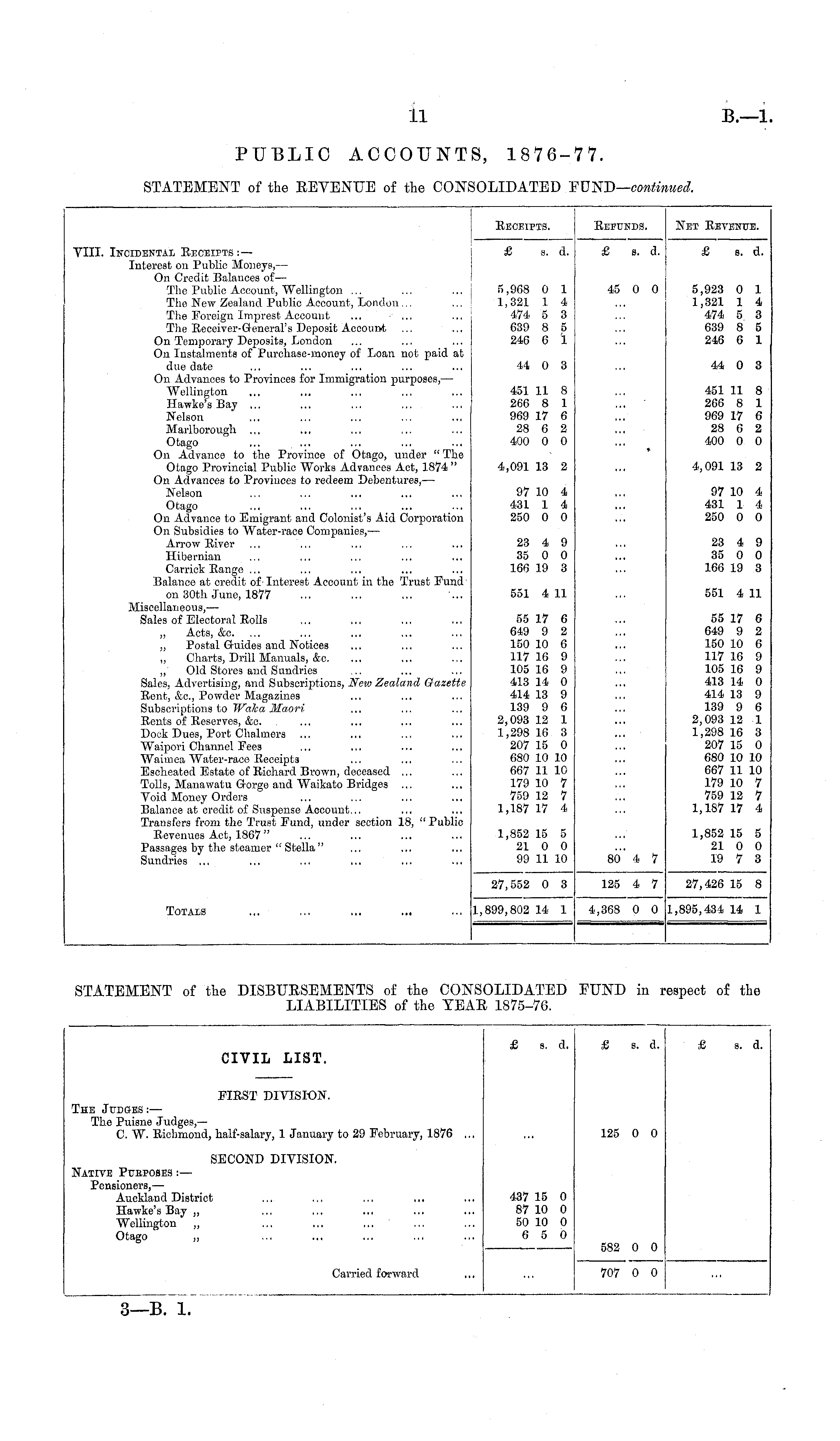 Receipts. Refunds. Net Revenue. VIII. Incidental Receipts -.— Interest on Bublic Moneys, — On Credit Balances of — The Bublic Account, Wellington ... The New Zealand Bublic Account, London ,.. The Foreign Imprest Account ... ... The Receiver-General's Deposit Account On Temporary Deposits, London On Instalments of Burchase-money of Loan not paid at due date On Advances to Brovinces for Immigration purposes,— Wellington Hawke's Bay ... ... ... ... Nelson Marlborough ... Otago ... ... On Advance to the Brovince of Otago, under " The Otago Brovincial Bublic Works Advances Act, 1874 " On Advances to Brovinces to redeem Debentures, — Nelson Otago On Advance to Emigrant and Colonist's Aid Corporation On Subsidies to Water-race Companies, — Arrow River Hibernian ... Carrick Range ... Balance at credit of- Interest Account in the Trust Fund on 30th June, 1877 Miscellaneous, — Sales of Electoral Rolls „ Acts, &c. ,, Postal Guides and Notices ,, Charts, Drill Manuals, &c ,,' Old Stores and Sundries Sales, Advertising, and Subscriptions, New Zealand Gazette Rent, &c, Powder Magazines Subscriptions to Walca Maori Rents of Reserves, &c. Dock Dues, Port Chalmers ... Waipori Channel Fees Waimea Water-race Receipts Escheated Estate of Richard Brown, deceased ... Tolls, Manawatu Gorge and Waikato Bridges Void Money Orders Balance at credit of Suspense Account... Transfers from the Trust Fund, under section 18, " Public Revenues Act, 1867 " Passages by the steamer " Stella " Sundries ... £ s. d. £ s. d. £ s. d. 5,968 0 1 1,321 1 4 474 5 3 639 8 5 246 6 1 45 0 0 5,923 0 1 1,321 1 4 474 5 3 639 8 5 246 6 1 44 0 3 44 0 3 451 11 8 266 8 1 969 17 6 28 6 2 400 0 0 451 11 8 266 8 1 969 17 6 28 6 2 400 0 0 4,091 13 2 4,091 13 2 97 10 4 431 1 4 250 0 0 97 10 4 431 1 4 250 0 0 23 4 9 35 0 0 166 19 3 23 4 9 35 0 0 166 19 3 551 4 11 551 4 11 55 17 6 649 9 2 150 10 6 117 16 9 105 16 9 413 14 0 414 13 9 139 9 6 2,093 12 1 1,298 16 3 207 15 0 680 10 10 667 11 10 179 10 7 759 12 7 1,187 17 4 55 17 6 649 9 2 150 10 6 117 16 9 105 16 9 413 14 0 414 13 9 139 9 6 2,093 12 1 1,298 16 3 207 15 0 680 10 10 667 11 10 179 10 7 759 12 7 1,187 17 4 1,852 15 5 21 0 0 99 11 10 1,852 15 5 21 0 0 19 7 3 80 4 7 27,552 0 3 125 4 7 27,426 15 8 Totals ... ... ... ... 1,899,802 14 1 4,368 0 0 1,895,434 14 1 STATEMENT of the DISBURSEMENTS of the CONS LIABILITIES of the TEA! LIDATED EUND in 1875-76. •espect of the CIVIL LIST, £ s. d. £ s. d. £ s. d. FIRST DIVISION. 125 0 0 'he Judges : — The Buisne Judges,— C. W. Richmond, half-salary, 1 January to 29 February, 1876 ... SECOND DIVISION. Iative Burposes :— Pensioners, — Auckland District Hawke's Bay ,, Wellington „ Otago „ 437 15 0 87 10 0 50 10 0 6 5 0 582 0 0 Carried forward 707 0 0 3—B. 1.