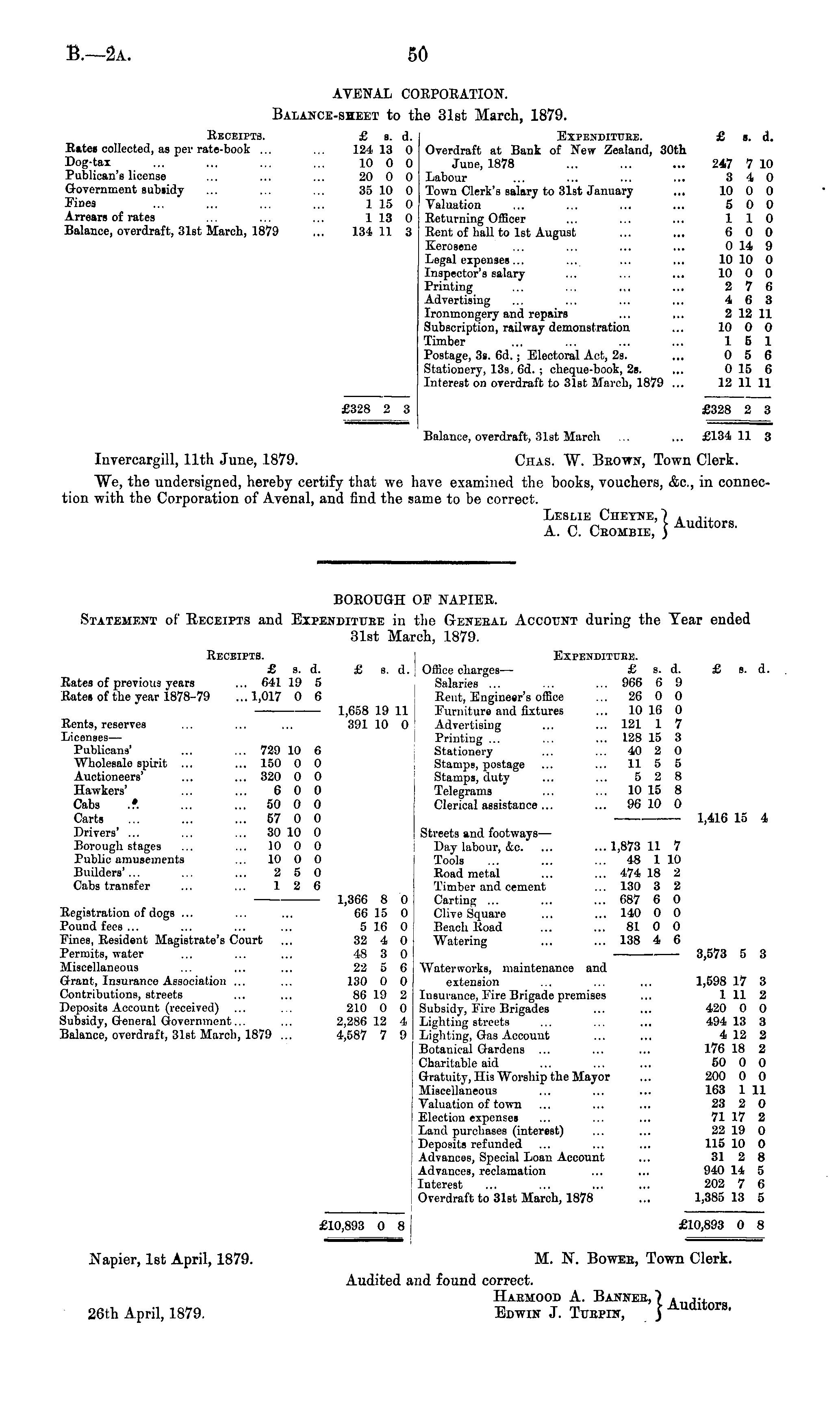 AVENAL CORPORATION. Balance-sheet to the 31st March, 1879. Receipts. £ s. d. Expendituee. £ g. d. Bates collected, as per rate-book ... ... 124 13 0 Overdraft at Bank of New Zealand, 30th Dog-tax ... ... ... ... 10 0 0 June, 1878 ... ... ... 247 7 10 Publican's license ... ... ... 20 0 0 Labour ... ... ... ... 3 4 0 Government subsidy ... ... ... 35 10 0 Town Clerk's salary to 31st January ... 10 0 0 Fines ... ... ... ... 1 15 0 Valuation ... ... ... ... 5 0 0 Arrears of rates ... ... ... 1 13 0 Returning Officer ... ... ... 110 Balance, overdraft, 31st March, 1879 ... 134 11 3 Rent of hall to Ist August ... ... 60 0 Eerosene ... ... ... ... 0 14 9 Legal expenses... ... ... ... 10 10 0 Inspector's salary ... ... ... 10 0 0 Printing ... ... ... ... 2 7 6 Advertising ... ... ... ... 463 Ironmongery and repairs ... ... 2 12 11 Subscription, railway demonstration ... 10 0 0 Timber ... ... ... ... 151 Postage, 3s. 6d.; Electoral Act, 2s. ... 0 5 6 Stationery, 13s, 6d. ; cheque-book, 2s. ... 0 15 6 Interest on overdraft to 31st March, 1879 ... 12 11 11 £328 2 3 £328 2 3 Balance, overdraft, 31st March ... ... £134 11 3 Invercargill, 11th June, 1879. Chas. W. Brown, Town Clerk. We, the undersigned, hereby certify that we have examined the books, vouchers, &c, in connection with the Corporation of Avenal, and find the same to be correct. Leslie Chetne, \ . ~, A. C. Crombie, )