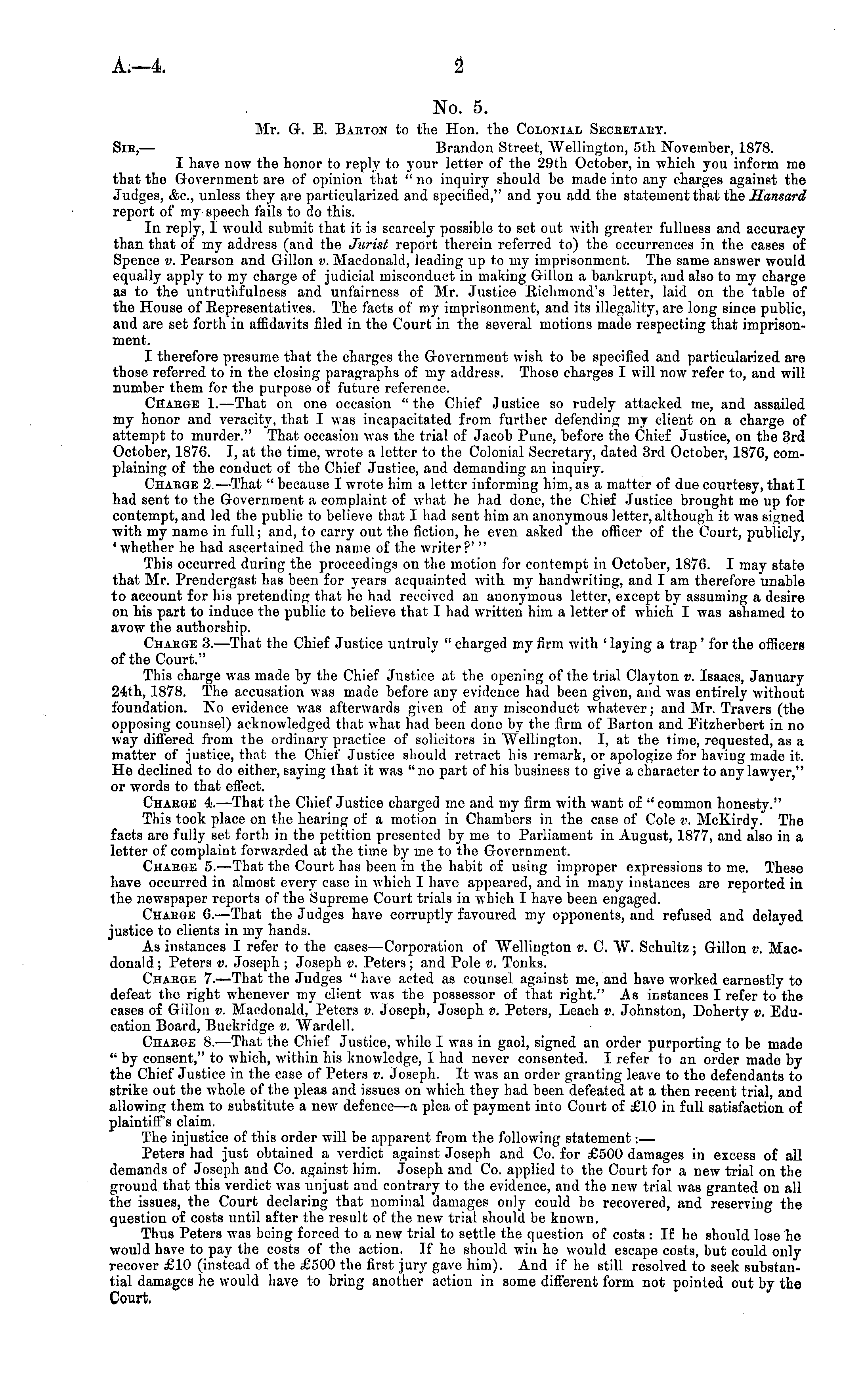 No. 5. Mr. G-. E. Barton to the Hon. the Colonial Secretary. Sir, — Brandon Street, Wellington, sth November, 1878. I have now the honor to reply to your letter of the 29th October, in which you inform me that the Government are of opinion that " no inquiry should be made into any charges against the Judges, &c, unless they are particularized and specified," and you add the statement that the Hansard report of my speech fails to do this. In reply, 1 would submit that it is scarcely possible to set out with greater fullness and accuracy than that of my address (and the Jurist report therein referred to) the occurrences in the cases of Spence v. Pearson and Gillon v. Macdonald, leading up to my imprisonment. The same answer would equally apply to my charge of judicial misconduct in making Gillon a bankrupt, and also to my charge as to the untruthfulness and unfairness of Mr. Justice Bichmond's letter, laid on the table of the House of Representatives. The facts of my imprisonment, and its illegality, are long since public, and are set forth in affidavits filed in the Court in the several motions made respecting that imprisonment. I therefore presume that the charges the Government wish to be specified and particularized are those referred to in the closing paragraphs of my address. Those charges I will now refer to, and will number them for the purpose of future reference. Charge 1.- —That on one occasion "the Chief Justice so rudely attacked me, and assailed my honor and veracity, that I was incapacitated from further defending my client on a charge of attempt to murder." That occasion was the trial of Jacob Pane, before the Chief Justice, on the 3rd October, 187G. I, at the time, wrote a letter to the Colonial Secretary, dated 3rd October, 1876, complaining of the conduct of the Chief Justice, and demanding an inquiry. Charge 2.—That " because I wrote him a letter informing him, as a matter of due courtesy, that I had sent to the Government a complaint of what he had done, the Chief Justice brought me up for contempt, and led the public to believe that I had sent him an anonymous letter, although it was signed with my name in full; and, to carry out the fiction, he even asked the officer of the Court, publicly, 'whether he had ascertained the name of the writer?' " This occurred during the proceedings on the motion for contempt in October, 1876. I may state that Mr. Prendergast has been for years acquainted with my handwriting, and I am therefore "unable to account for his pretending that he had received an anonymous letter, except by assuming a desire on his part to induce the public to believe that I had written him a letter of which I was ashamed to avow the authorship. Charge 3. —That the Chief Justice untrulv " charged my firm with ' laying a trap ' for the officers of the Court." This charge was made by the Chief Justice at the opening of the trial Clayton v. Isaacs, January 24th, 1878. The accusation was made before any evidence had been given, and was entirely without foundation. No evidence was afterwards given of any misconduct whatever; and Mr. Travers (the opposing counsel) acknowledged that what had been done by the firm of Barton and Eitzherbert in no way differed from the ordinary practice of solicitors in Wellington. I, at the time, requested, as a matter of justice, that the Chief Justice should retract his remark, or apologize for having made it. He declined to do either, saying that it was " no part of his business to give a character to any lawyer," or words to that effect. Charge 4.—That the Chief Justice charged me and my firm with want of ''common honesty." This took place on the hearing of a motion in Chambers in the case of Cole v. McKirdy. The facts are fully set forth in the petition presented by me to Parliament in August, 1877, and also in a letter of complaint forwarded at the time by me to the Government. Charge 5. —That the Court has been in the habit of using improper expressions to me. These have occurred in almost every case in which I have appeared, and in many instances are reported in the newspaper reports of the Supreme Court trials in which I have been engaged. Charge 6. —That the Judges have corruptly favoured my opponents, and refused and delayed justice to clients in my hands. As instances I refer to the cases —Corporation of Wellington v. C. W. Schultz; Gillon v. Macdonald; Peters v. Joseph ; Joseph v. Peters; and Pole v. Tonks. Charge 7. —That the Judges " have acted as counsel against me, and have worked earnestly to defeat the right whenever my client was the possessor of that right." As instances I refer to the cases of Gillon v. Macdonald, Peters v. Joseph, Joseph v. Peters, Leach v. Johnston, Doherty v. Education Board, Buckridge v. A\ rardell. Charge 8. —That the Chief Justice, while I was in gaol, signed an order purporting to be made "by consent," to which, within his knowledge, I had never consented. I refer to an order made by the Chief Justice in the case of Peters v. Joseph. It was an order granting leave to the defendants to strike out the whole of the pleas and issues on which they had been defeated at a then recent trial, and allowing them to substitute a new defence —a plea of payment into Court of £10 in full satisfaction of plaintiff's claim. The injustice of this order will be apparent from the following statement: — Peters had just obtained a verdict against Joseph and Co. for £500 damages in excess of all demands of Joseph and Co. against him. Joseph and Co. applied to the Court for a new trial on the ground that this verdict was unjust aud contrary to the evidence, and the new trial was granted on all the issues, the Court declaring that nominal damages only could bo recovered, and reserving the question of costs until after the result of the new triaL should be known. Thus Peters was being forced to a new trial to settle the question of costs : If he should lose he would have to pay the costs of