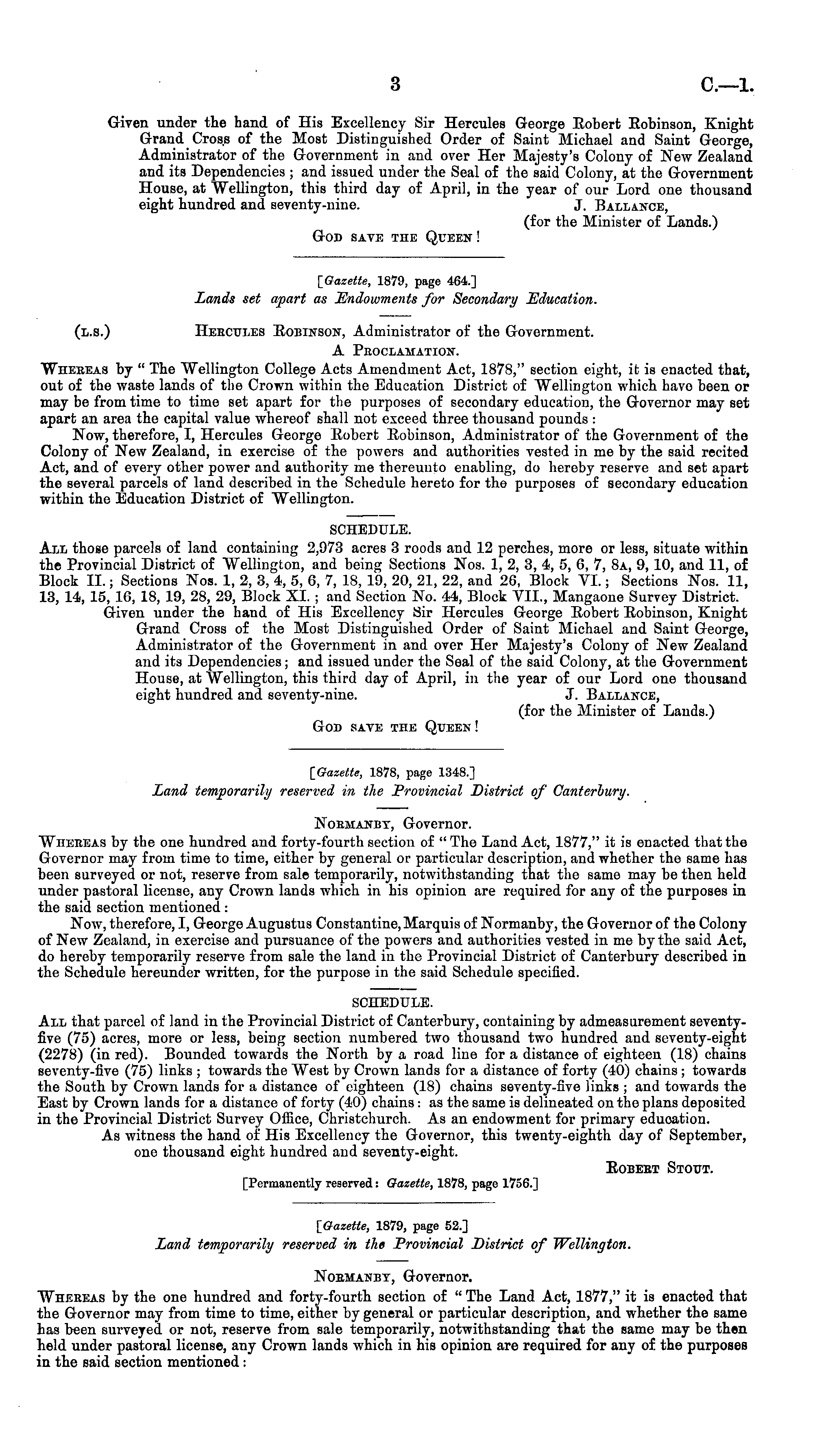 Given under the hand of His Excellency Sir Hercules George Eobert Eobinson, Knight Grand Cross of the Most Distinguished Order of Saint Michael and Saint George, Administrator of the Government in and over Her Majesty's Colony of New Zealand and its Dependencies ; and issued under the Seal of the said Colony, at the Government House, at Wellington, this third day of April, in the year of our Lord one thousand eight hundred and seventy-nine. J. Ballance, (for the Minister of Lands.) God save the Queen !