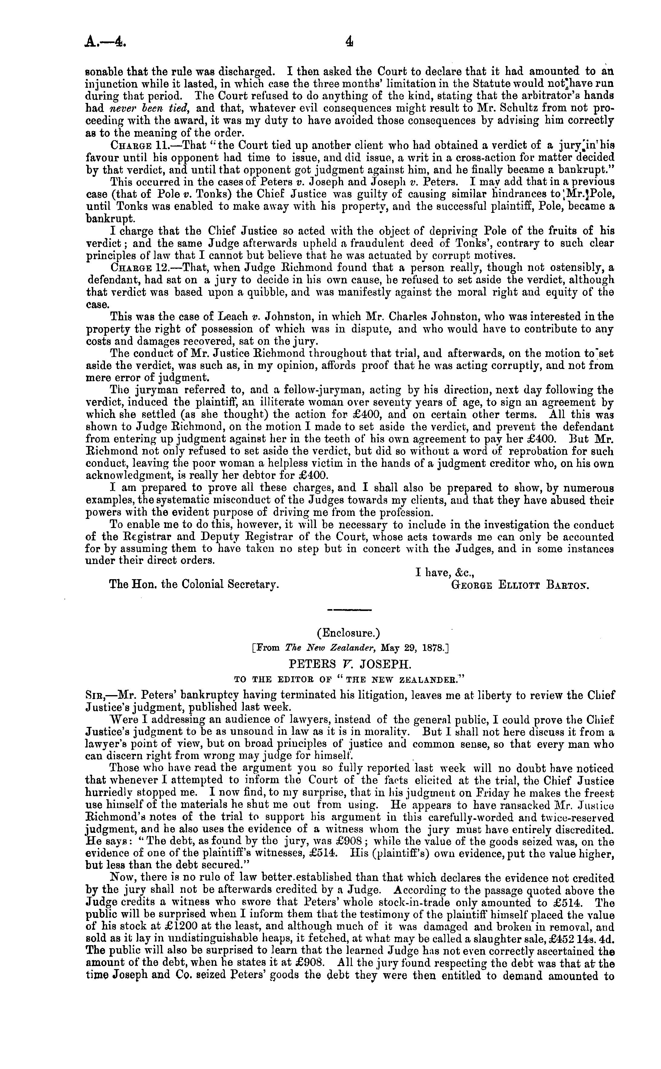 sonable that the rule was discharged. I then asked the Court to declare that it had amounted to an injunction while it lasted, in which case the three months' limitation in the Statute would not'have run during that period. The Court refused to do anything of the kind, stating that the arbitrator's hands had never been tied, and that, whatever evil consequences might result to Mr. Sclmltz from not proceeding with the award, it was my duty to have avoided those consequences by advising him correctly as to the meaning of the order. Charge 11.—That <:the Court tied up another client who had obtained a verdict of a jury^in'his favour until his opponent had time to issue, and did issue, a writ in a cross-action for matter decided by that verdict, and until that opponent got judgment against him, and he finally became a bankrupt." This occurred in the cases of Peters v. Joseph and Joseph v. Peters. I may add that in a previous case (that of Pole v. Tonks) the Chief Justice was guilty of causing similar hindrances tojMr.JPole, until Tonks was enabled to make away with his property, and the successful plaintiff, Pole, became a bankrupt. I charge that the Chief Justice so acted with the object of depriving Pole of the fruits of his verdict; and the same Judge afterwards upheld a fraudulent deed of Tonks', contrary to such clear principles of law that I cannot but believe that he was actuated by corrupt motives. Charge 12.—That, when Judge Bichmond found that a person really, though not ostensibly, a defendant, had sat on a jury to decide in his own cause, he refused to set aside the verdict, although that verdict was based upon a quibble, and was manifestly against the moral right and equity of the case. This was the case of Leach v. Johnston, in which Mr. Charles Johnston, who was interested in the property the right of possession of which was in dispute, and who would have to contribute to any costs and damages recovered, sat on the jury. The conduct of Mr. Justice Eiehmond throughout that trial, and afterwards, on the motion to'set aside the verdict, was such as, in my opinion, affords proof that he was acting corruptly, and not from mere error of judgment. The juryman referred to, and a fellow-juryman, acting by his direction, next day following the verdict, induced the plaintiff, an illiterate woman over seventy years of age, to sign an agreement by which she settled (as she thought) the action for £400, and on certain other terms. All this was shown to Judge Eiehmond, on the motion I made to set aside the verdict, and prevent the defendant from entering up judgment against her in the teeth of his own agreement to pay her £400. But Mr. Eiehmond not only refused to set aside the verdict, but did so without a word of reprobation for such conduct, leaving the poor woman a helpless victim in the hands of a judgment creditor who, on his own acknowledgment, is really her debtor for £400. I am prepared to prove all these charges, and I shall also be prepared to show, by numerous examples, the systematic misconduct of the Judges towards my clients, and that they have abused their powers with the evident purpose of driving me from the profession. To enable me to do this, however, it will be necessary to include in the investigation the conduct of the Bcgistrar and Deputy Begistrar of the Court, whose acts towards me can only be accounted for by assuming them to have taken no step but in concert with the Judges, and in some instances under their direct orders. I have, &c., The Hon. the Colonial Secretary. George Elliott Barton. (Enclosure.) [From The Kern Zealander, May 29, 1878.] PETEES V. JOSEPH. TO TIIE EDITOR OF " THE NEW ZEALANDER." Sir, —Mr. Peters' bankruptcy having terminated his litigation, leaves me at liberty to review the Chief Justice's judgment, published last week. Were I addressing an audience of lawyers, instead of the general public, I could prove the Chief Justice's judgment to be as unsound in law as it is in morality. But I shall not here discuss it from a lawyer's point of view, but on broad principles of justice and common sense, so that every man who can discern right from wrong may judge for himself. Those who have read the argument you so fully reported last week will no doubt have noticed that whenever I attempted to inform the Court of the facts elicited at the trial, the Chief Justice hurriedly stopped me. I now find, to my surprise, that in his judgment on Friday he makes the freest use himself of the materials he shut me out from using. He appears to have ransacked Mr. Jusiico Bichmond's notes of the trial to support his argument in this carefully-worded and twice-reserved judgment, and he also uses the evidence of a witness whom the jury must have entirely discredited. He says : " The debt, as found by the jury, was £908 ; while the value of the goods seized was, on the evidence of one of the plaintiff's witnesses, £514. His (plaintiff's) own evidence, put the value higher, but less than the debt secured." Now, there is no rule of law better.established than that which declares the evidence not credited by the jury shall not be afterwards credited b}' a Judge. According to the passage quoted above the Judge credits a witness who swore that Peters' whole stock-in-trade only amounted to £514. The public will be surprised when I inform them that the testimony of the plaintiff himself placed the value of his stock at £1200 at the least, and although much of it was damaged and broken in removal, and sold as it lay in undistinguishable heaps, it fetched, at what may be called a slaughter sale, £452 14s. 4d. The public will also bo surprised to learn that the learned Judge hag not even correctly ascertained the amount of the debt, when he states it at £908. All the jury found respecting the debt was that at the time Joseph and Co. seized Peters' goods the debt they were then entitled" to demand amounted to