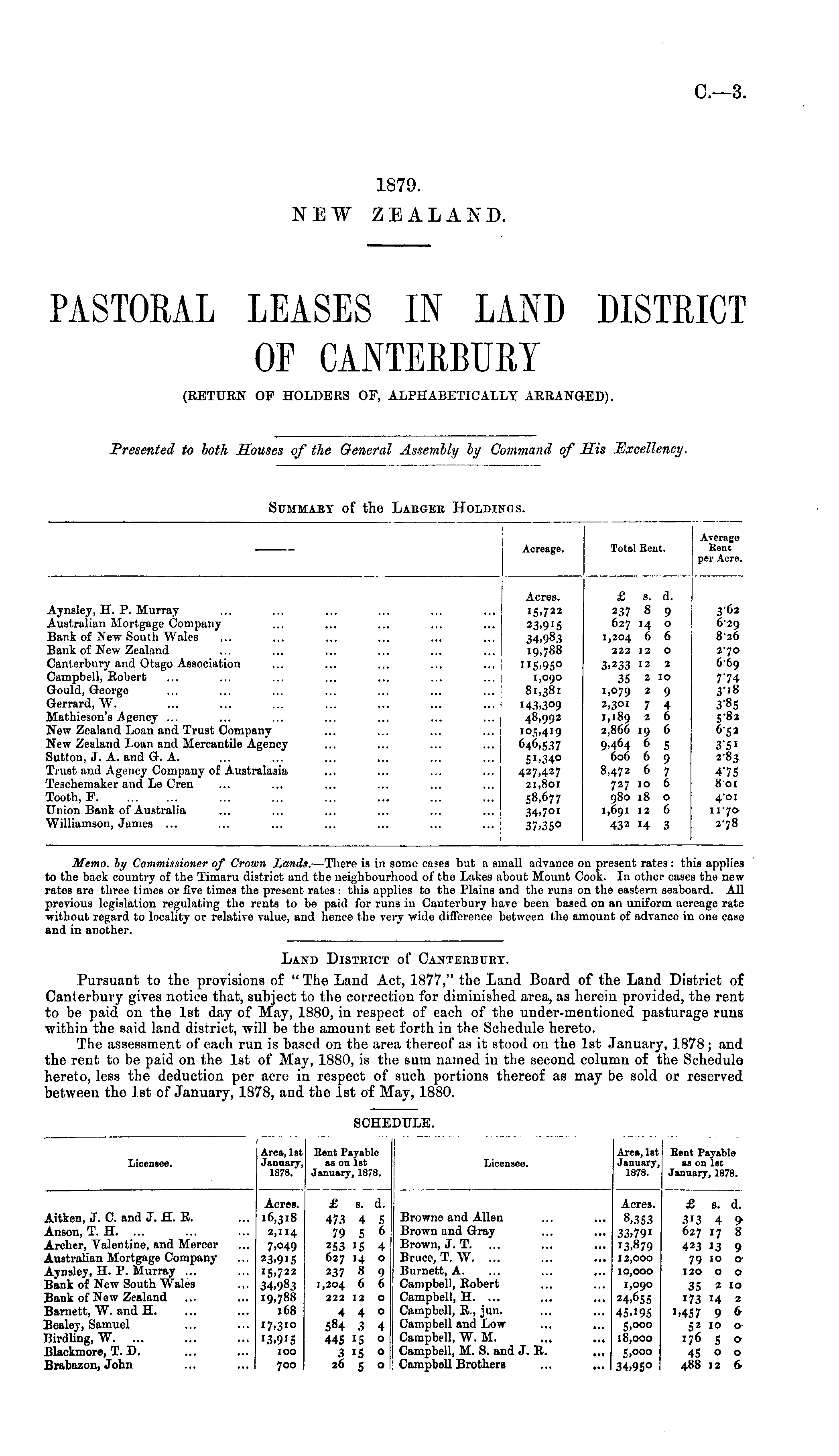 PASTORAL LEASES IN LAND DISTRICT OF CANTERBURY (RETURN OF HOLDERS OF, ALPHABETICALLY ARRANGED).