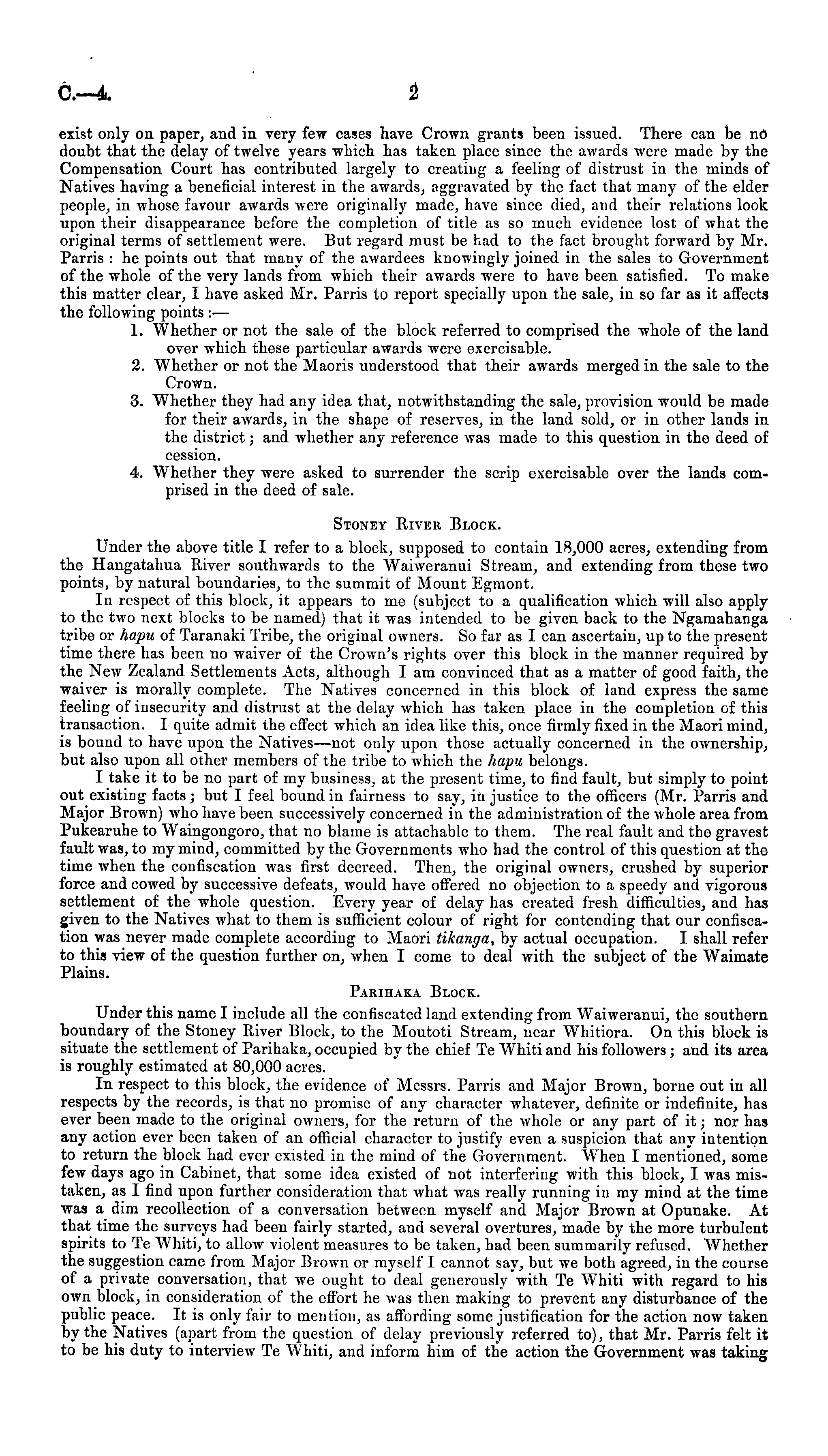 exist only on paper, and in very few cases have Crown grants been issued. There can be no doubt that the delay of twelve years which has taken place since the awards were made by the Compensation Court has contributed largely to creating a feeling of distrust in the minds of Natives having a beneficial interest in the awards, aggravated by the fact that many of the elder people, in whose favour awards were originally made, have since died, and their relations look upon their disappearance before the completion of title as so much evidence lost of what the original terms of settlement were. But regard must be had to the fact brought forward by Mr. Parris : he points out that many of the awardees knowingly joined in the sales to Government ofthe whole ofthe very lands from which their awards were to have been satisfied. To make this matter clear, I have asked Mr. Parris to report specially upon the sale, in so far as it affects the following points :— 1. Whether or not the sale of the block referred to comprised the whole of the land over which these particular awards were exercisable. 2. Whether or not the Maoris understood that their awards merged in the sale to the Crown. 3. Whether they had any idea that, notwithstanding the sale, provision would be made for their awards, in the shape of reserves, in the land sold, or in other lands in the district; and whether any reference was made to this question in the deed of cession. 4. Whether they were asked to surrender the scrip exercisable over the lands comprised in the deed of sale. Stoney River Block. Under the above title I refer to a block, supposed to contain 18,000 acres, extending from the Hangatahua River southwards to the Waiweranui Stream, and extending from these two points, by natural boundaries, to the summit of Mount Egmont. In respect of this block, it appears to me (subject to a qualification which will also apply to the two next blocks to be named) that it was intended to be given back to the Ngamahanga tribe or hapu of Taranaki Tribe, the original owners. So far as I can ascertain, up to the present time there has been no waiver of the Crown's rights over this block in the manner required by the New Zealand Settlements Acts, although I am convinced that as a matter of good faith, the waiver is morally complete. The Natives concerned in this block of land express the same feeling of insecurity and distrust at the delay which has taken place in the completion of this transaction. I quite admit the effect which an idea like this, once firmly fixed in the Maori mind, is bound to have upon the Natives—not only upon those actually concerned in the ownership, but also upon all other members of the tribe to which the hapu belongs. I take it to be no part of my business, at the present time, to find fault, but simply to point out existing facts; but I feel bound in fairness to say, in justice to the officers (Mr. Parris and Major Brown) who have been successively concerned iv the administration of the whole area from Pukearuhe to Waingongoro, that no blame is attachable to them. The real fault and the gravest fault was, to my mind, committed by the Governments who had the control of this question at the time when the confiscation was first decreed. Then, the original owners, crushed by superior force and cowed by successive defeats, would have offered no objection to a speedy and vigorous settlement of the whole question. Every year of delay has created fresh difficulties, and has given to the Natives what to them is sufficient colour of right for contending that our confiscation was never made complete according to Maori tikanga, by actual occupation. I shall refer to this view of the question further on, when I come to deal with the subject of tbe Waimate Plains. Parihaka Block. Under this name I include all the confiscated land extending from Waiweranui, the southern boundary of the Stoney River Block, to the Moutoti Stream, near Whitiora. On this block is situate the settlement of Parihaka, occupied by the chief Te Whiti and his followers; and its area is roughly estimated at 80,000 acres. In respect to this block, the evidence of Messrs. Parris and Major Brown, borne out in all respects by the records, is that no promise of any character whatever, definite or indefinite, has ever been made to the original owners, for the return of the whole or any part of it; nor has any action ever been taken of an official character to justify even a suspicion that any intention to return the block had ever existed in the mind of the Government. When I mentioned, some few days ago in Cabinet, that some idea existed of not interfering with this block, I was mistaken, as I find upon further consideration that what was really running in my mind at the time was a dim recollection of a conversation between myself and Major Brown at Opunake. At that time the surveys had been fairly started, and several overtures, made by the more turbulent spirits to Te Whiti, to allow violent measures to be taken, had been summarily refused. Whether the suggestion came from Major Brown or myself I cannot say, but we both agreed, in the course of a private conversation, that we ought to deal generously with Te Whiti with regard to his own block, in consideration of the effort he was then making to prevent any disturbance of the public peace. It is only fair to mention, as affording some justification for the action now taken by the Natives (apart from the question of delay previously referred to), that Mr. Parris felt it to be his duty to interview Te Whiti, aud inform him of the action the Government was taking
