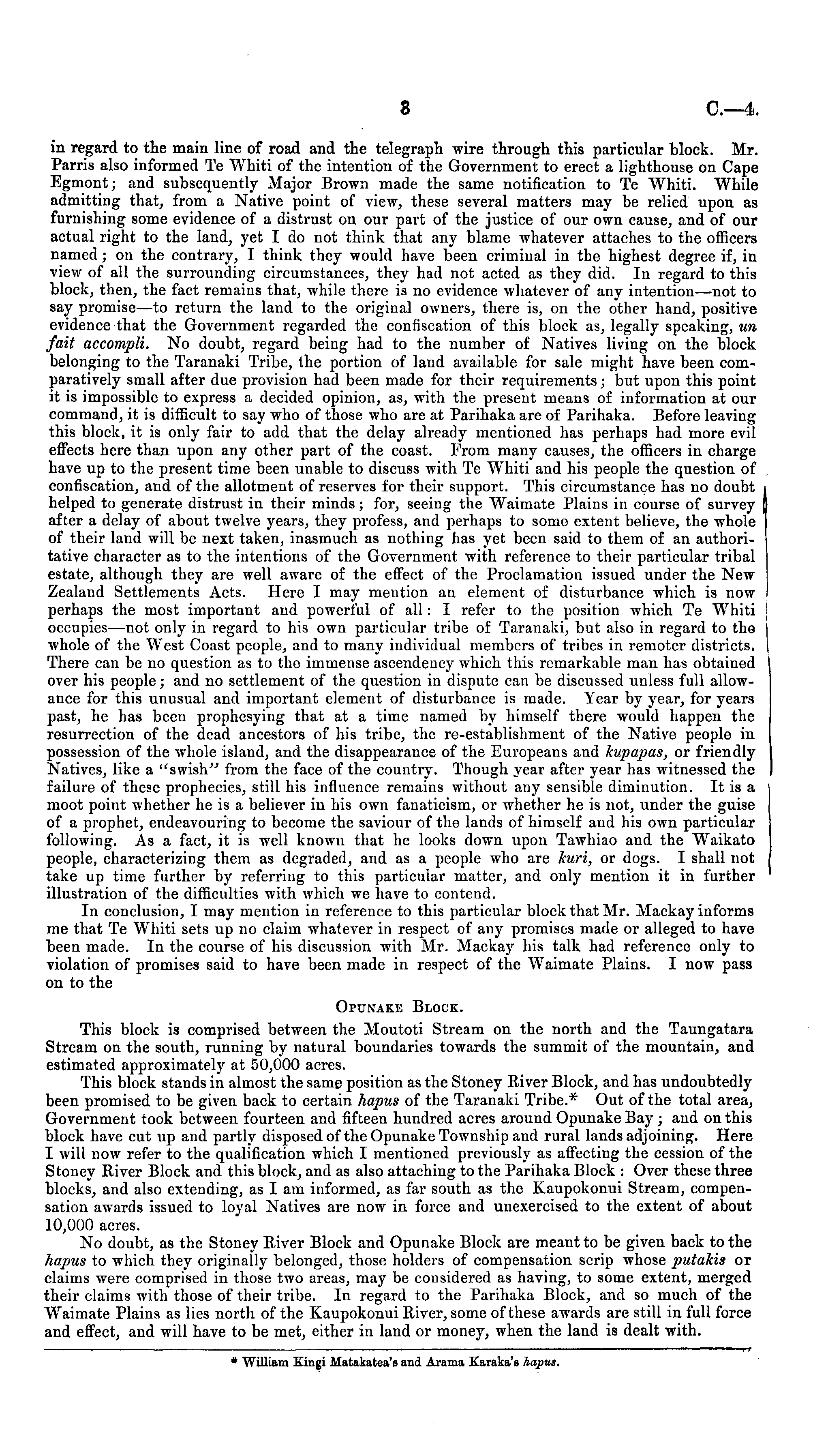 in regard to the main line of road and the telegraph wire through this particular block. Mr. Parris also informed Tc Whiti of the intention of the Government to erect a lighthouse on Cape Egmont; and subsequently Major Brown made the same notification to Te Whiti. While admitting that, from a Native point of view, these several matters may be relied upon as furnishing some evidence of a distrust on our part of the justice of our own cause, and of our actual right to the land, yet I do not think that any blame whatever attaches to the officers named; on the contrary, I think they would have been criminal in the highest degree if, in view of all the surrounding circumstances, they had not acted as they did. In regard to this block, then, the fact remains that, while there is no evidence whatever of any intention—not to say promise—to return the land to the original owners, there is, on the other hand, positive evidence that the Government regarded the confiscation of this block as, legally speaking, un fait accompli. No doubt, regard being had to the number of Natives living on the block belonging to the Taranaki Tribe, the portion of land available for sale might have been comparatively small after due provision had been made for their requirements; but upon this point it is impossible to express a decided opinion, as, with the present means of information at our command, it is difficult to say who of those who are at Parihaka are of Parihaka. Before leaving this block, it is only fair to add that the delay already mentioned has perhaps had more evil effects here than upon any other part of the coast. From many causes, the officers in charge have up to the present time been unable to discuss with Te Whiti and his people tho question of confiscation, and of the allotment of reserves for their support. This circumstance has no doubt helped to generate distrust in their minds; for, seeing tbe Waimate Plains in course of survey after a delay of about twelve years, they profess, and perhaps to some extent believe, the whole of their land will be next taken, inasmuch as nothing has yet been said to them of an authoritative character as to the intentions of the Government with reference to their particular tribal estate, although tbey are well aware of the effect of the Proclamation issued under the New Zealand Settlements Acts. Here I may mention an element of disturbance which is now perhaps the most important and powerful of all: I refer to tbe position which Te Whiti occupies—not only in regard to his own particular tribe of Taranaki, but also in regard to the whole of the West Coast people, and to many individual members of tribes in remoter districts. There can be no question as to tho immense ascendency which this remarkable man has obtained over his people; and no settlement of the question in dispute can be discussed unless full allowance for this unusual and important element of disturbance is made. Year by year, for years past, he has been prophesying that at a time named by himself there would happen the resurrection of the dead ancestors of his tribe, the re-establishment of the Nativo people in possession of the whole island, and the disappearance of the Europeans and kupapas, or friendly Natives, like a "swish" from the face of the country. Though year after year has witnessed the failure of these prophecies, still his influence remains without any sensible diminution. It is a moot point whether he is a believer in his own fanaticism, or whether he is not, under the guise of a prophet, endeavouring to become the saviour of tho lands of himself and his own particular following. As a fact, it is well known that he looks down upon Tawhiao and the Waikato people, characterizing them as degraded, aud as a people who are kuri, or dogs. I shall not take up time further by referring to this particular matter, and only mention it in further illustration of the difficulties with which we have to contend. In conclusion, I may mention in reference to this particular block that Mr. Mackay informs me that Te Whiti sets up no claim whatever in respect of any promises made or alleged to have been made. In the course of his discussion with Mr. Mackay his talk had reference only to violation of promises said to have been made in respect of the Waimate Plains. I now pass on to the Opunake Block. This block is comprised between the Moutoti Stream on the north and the Taungatara Stream on the south, running by natural boundaries towards the summit of the mountain, and estimated approximately at 50,000 acres. This block stands in almost the same position as the Stoney River Block, and has undoubtedly been promised to be given back to certain hapus of the Taranaki Tribe.* Out ofthe total area, Government took between fourteen and fifteen hundred acres around Opunake Bay ; and on this block have cut up and partly disposed of the Opunake Township and rural lands adjoining. Here I will now refer to the qualification which I mentioned previously as affecting the cession of the Stoney River Block and this block, and as also attaching to the Parihaka Block : Over these three blocks, and also extending, as I am informed, as far south as the Kaupokonui Stream, compensation awards issued to loyal Natives are now in force and unexercised to the extent of about 10,000 acres. No doubt, as the Stoney River Block and Opunake Block are meant to be given back to the hapus to which they originally belonged, those holders of compensation scrip whose putakis or claims were comprised in those two areas, may be considered as having, to some extent, merged their claims with those of their tribe. In regard to the Parihaka Block, and so much of the Waimate Plains as lies north of the Kaupokonui River, some of these awards are still in full force and effect, and will have to be met, either in land or money, when the laud is dealt with. . 1 __. ■ ■ .... —~.. .■.«.■ - r * William Kingi Matakatea's and Arama Karak