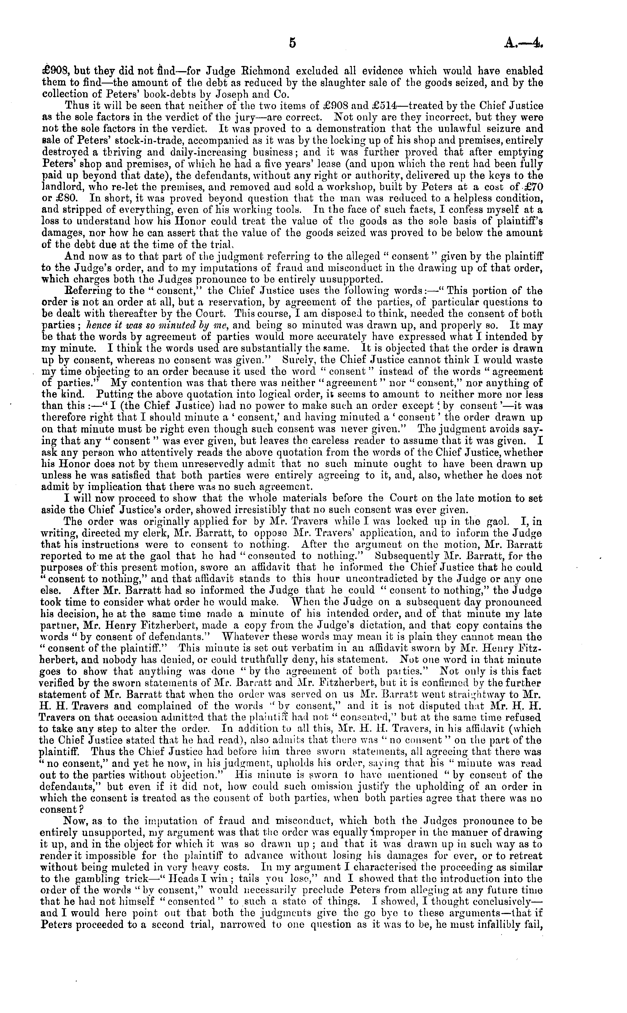 £908, but they did not find—for Judge Richmond excluded all evidence which would have enabled them to find —the amount of the debt as reduced by the slaughter sale of the goods seized, and by the collection of Peters' book-debts by Joseph and Co. Thus it will be seen that neither of the two items of £908 and £514 —treated by the Chief Justice as the sole factors in the verdict of the jury—are correct. Not only are they incorrect, but they were not the sole factors in the verdict. It was proved to a demonstration that the unlawful seizure and sale of Peters' stock-in-trade, accompanied as it was by the locking up of his shop and premises, entirely destroyed a thriving and daily-increasing business; and it was further proved that after emptying Peters' shop and premises, of which he had a five years' lease (and upon which the rent had been fully paid up beyond that date), the defendants, without any right or authority, delivered up the keys to the landlord, who re-let the premises, and removed and sold a workshop, built by Peters at a cost of £70 or £80. In short, it was proved beyond question that the man was reduced to a helpless condition, and stripped of everything, even of his working tools. In the face of such facts, I confess myself at a loss to understand how his Honor could treat the value of the goods as the sole basis of plaintiff's damages, nor how he can assert that the value of the goods seized was proved to be below the amount of the debt due at the time of the trial. And now as to that part of the judgment referring to the alleged " consent " given by the plaintiff to the Judge's order, and to my imputations of fraud and misconduct in the drawing up of that order, which charges both the Judges pronounce to be entirely unsupported. Deferring to the " couscnt," the Chief Justice uses the following words: —"This portion of the order is not an order at all, but a reservation, by agreement of the parties, of particular questions to be dealt with thereafter by the Court. This course, I am disposed to think, needed the consent of both parties ; lience it was so minuted by me, and being so minuted was drawn up, and properly so. It may be that the words by agreement of parties would more accurately have expressed what I intended by my minute. I think the words used are substantially the same. It is objected that the order is drawn up by consent, whereas no consent was given." Surely, the Chief Justice cannot think I would waste my time objecting to an order because it used the word " consent " instead of the words " agreement of parties." My contention was that there was neither "agreement " nor " consent," nor anything of the kind. Putting the above quotation into logical order, it seems to amount to neither more nor less than this : —" I (the Chief Justice) had no power to make such an order except \by consent'—it was therefore right that I should minute a ' consent,' and having minuted a ' consent' the order drawn up on that minute must be right even though such consent was never given." The judgment avoids saying that any " consent " was ever given, but leaves the careless reader to assume that it was given. I ask any person who attentively reads the above quotation from the words of the Chief Justice, whether his Honor does not by them unreservedly admit that no such minute ought to have been drawn up unless he was satisfied that both parties were entirely agreeing to it, and, also, whether he does not admit by implication that there was no such agreement. I will now proceed to show that the whole materials before the Court on the late motion to set aside the Chief Justice's order, showed irresistibly that no such consent was ever given. The order was originally applied for by Mr. Travers while I was locked up in the gaol. I, in writing, directed my clerk, Mr. Barratt, to oppose Mr. Travers' application, and to inform the .Judge that his instructions were to consent to nothing. After the argument on the motion, Mr. Barratt reported to me at the gaol that he had " consented to nothing." Subsequently Mr. Barratt, for the purposes of this present motion, swore an affidavit that he informed the Chief Justice that ho could "consent to nothing," and that affidavit stands to this hour uncontradicted by the Judge or any one else. After Mr. Barratt had so informed the Judge that he could " consent to nothing," the Judge took time to consider what order he would make. When the Judge on a subsequent day pronounced his decision, he at the same time made a minute of his intended order, and of that minute my late partner, Mr. Henry Fitzherbcrt, made a copy from the Judge's dictation, and that copy contains the words "by consent of defendants." Whatever these words may mean it is plain they cannot mean the " consent of the plaintiff." This minute is set out verbatim in an affidavit sworn by Mr. Henry Fitzherbert, and nobody has denied, or could truthfully deny, his statement. Not one word in that minute goes to show that anything was done "by the agreement of both parties." Not only is this fact verified by the sworn statements of Mr. Barratt and Mr. Fitzherbert, but it is confirmed by the further statement of Mr. Barratt that when the order was served on us Mr. Barratt went straightway to Mr. 11. H. Travers and complained of the words " by consent," and it is not disputed that Mr. H. H. Travers on that occasion admitted that the plaintiff had not " consented," but at the same time refused to take any step to alter the order. In addition to all this, Mr. H. H. Travers, in his affidavit (which the ChieE Justice stated that he had read), also admits that there was " no consent " on the part of the plaintiff. Thus the Chief Justice had before him three sworn statements, all agreeing that there was " no consent," and yet he now, in his judgment, upholds his order, saving that his " minute was read out to the parties without objection." His minute is sworn to have mentioned "by 