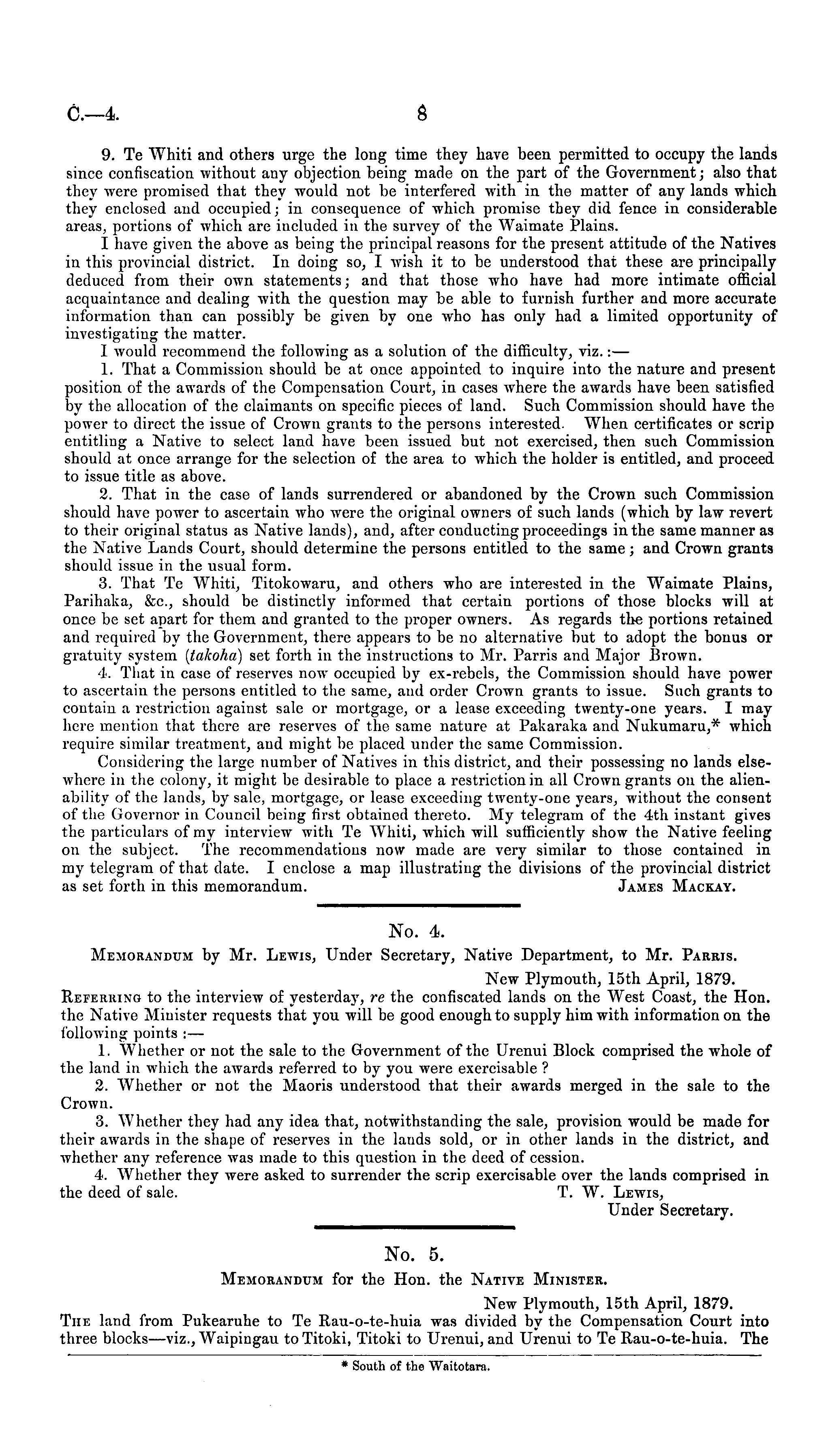 No. 4. Memorandum by Mr. Lewis, Under Secretary, Native Department, to Mr. Parris. New Plymouth, 15th April, 1879. Referring to the interview of yesterday, re the confiscated lands on the West Coast, the Hon. the Native Minister requests that you will be good enough to supply him with information on the following points : — 1. Whether or not the sale to the Government ofthe Urenui Block comprised the whole of the land in which the awards referred to by you were exercisable ? 2. Whether or not the Maoris understood that their awards merged in the sale to the Crown. 3. Whether they had any idea that, notwithstanding the sale, provision would be made for their awards in the shape of reserves in the lands sold, or in other lands in the district, and whether any reference was made to this question in the deed of cession. 4. Whether they were asked to surrender the scrip exercisable over the lands comprised in the deed of sale. T. W. Lewis, Under Secretary.