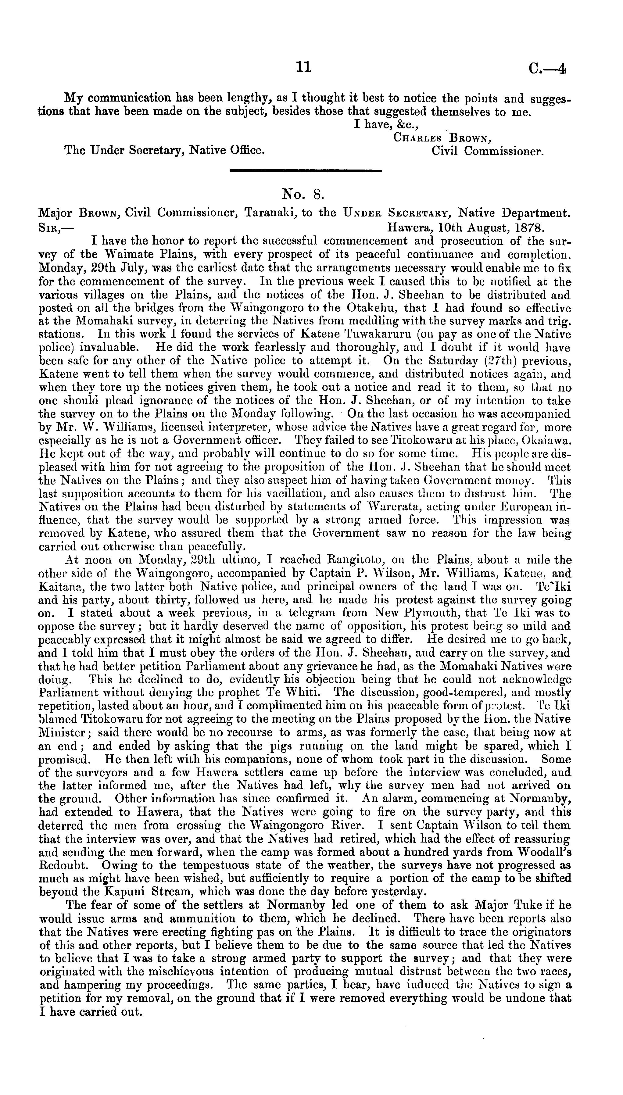 No. 8. Major Brown, Civil Commissioner, Taranaki, to the Under Secretary, Native Department. Sir, — Hawera, 10th August, 1878. I have the honor to report the successful commencement and prosecution of the survey of tbe Waimate Plains, with every prospect of its peaceful continuance and completion. Monday, 29th July, was the earliest date that the arrangements necessary would enable me to fix for the commencement of the survey. In the previous week I caused this to be notified at the various villages on the Plains, and the notices of the Hon. J. Sheehan to be distributed and posted on all the bridges from the Waingongoro to the Otakehu, that I had found so effective at the Momahaki survey, in deterring the Natives from meddling with the survey marks and trig, stations. In this work I found the services of Katene Tuwakaruru (on pay as one of the Native police) invaluable. He did the work fearlessly aud thoroughly, aud I doubt if it Avould have been safe for any other of the Native police to attempt it. On the Saturday (27th) previous, Katene went to tell them when the survey would commence, and distributed notices again, and when they tore up the notices given them, he took out a notice and read it to them, so that no one should plead ignorance of the notices of the Hon. J. Sheehan, or of my intention to take the survey on to the Plains on the Monday following. On the last occasion he was accompanied by Mr. W. Williams, licensed interpreter, whose advice the Natives have a great regard for, more especially as he is not a Government officer. They failed to see Titokowaru at his place, Okaiawa. He kept out of the way, and probably will continue to do so for some time. His people are displeased with him for not agreeing to the proposition of the Hon. J. Sheehan that he should meet the Natives on the Plains; and they also suspect him of having taken Government money. This last supposition accounts to them for his vacillation, and also causes them to distrust him. The Natives on the Plains had been disturbed by statements of Warerata, acting under European influence, that the survey would be supported by a strong armed force. This impression was removed by Katene, who assured them that the Government saw no reason for the law being carried out otherwise than peacefully. At noon on Monday, 29th ultimo, I reached Rangitoto, on the Plains, about a mile the other side of the Waingongoro, accompanied by Captain P. Wilson, Mr. Williams, Katene, and Kaitana, the two latter both Native police, aud principal owners of the land I was on. Te'lki and his party, about thirty, followed us hero, and he made his protest against the survey going on. I stated about a week previous, in a telegram from New Plymouth, that Te Iki was to oppose the survey; but it hardly deserved the name of opposition, his protest being so mild and peaceably expressed that it might almost be said we agreed to differ. He desired me to go back, and I told him that I must obey the orders of the Hon. J. Sheehan, and carry on the survey, and that he had better petition Parliament about any grievance he had, as the Momahaki Natives were doing. This he declined to do, evidently his objection being that he could not acknowledge Parliament without denying the prophet Te Whiti. The discussion, good-tempered, and mostly repetition, lasted about an hour, and I complimented him on his peaceable form of protest. Te Iki blamed Titokowaru for not agreeing to the meeting on the Plains proposed by the Hon. the Native Minister; said there would be no recourse to arms, as was formerly the case, that beiug now at an end; and ended by asking that the pigs running on the land might be spared, which I promised. He then left with his companions, none of whom took part in the discussion. Some of the surveyors and a few Hawera settlers came up before the interview was concluded, and the latter informed me, after the Natives had left, why the survey men had not arrived on the ground. Other information has since confirmed it. An alarm, commencing at Normanby, had extended to Hawera, that the Natives were going to fire on the survey party, and this deterred the men from crossing the Waingongoro River. I sent Captain Wilson to tell them that the interview was over, and that the Natives had retired, which had the effect of reassuring and sending the men forward, when the camp was formed about a hundred yards from Woodall's Redoubt. Owing to the tempestuous state of the weather, the surveys have not progressed as much as might have been wished, but sufficiently to require a portion of the camp to be shifted beyond the Kapuui Stream, which was done the day before yesterday. The fear of some of the settlers at Normanby led one of them to ask Major Tukc if he would issue arms aud ammunition to them, which he declined. There have been reports also that the Natives were erecting fighting pas on the Plains. It is difficult to trace the originators of this and other reports, but I believe them to be due to the same source that led the Natives to believe that I was to take a strong armed party to support the survey; and that they were originated with the mischievous intention of producing mutual distrust between the two races, and hampering my proceedings. The same parties, I hear, have induced the Natives to sign a petition for my removal, on the ground that if I were removed everything would be undoue that I have carried out.