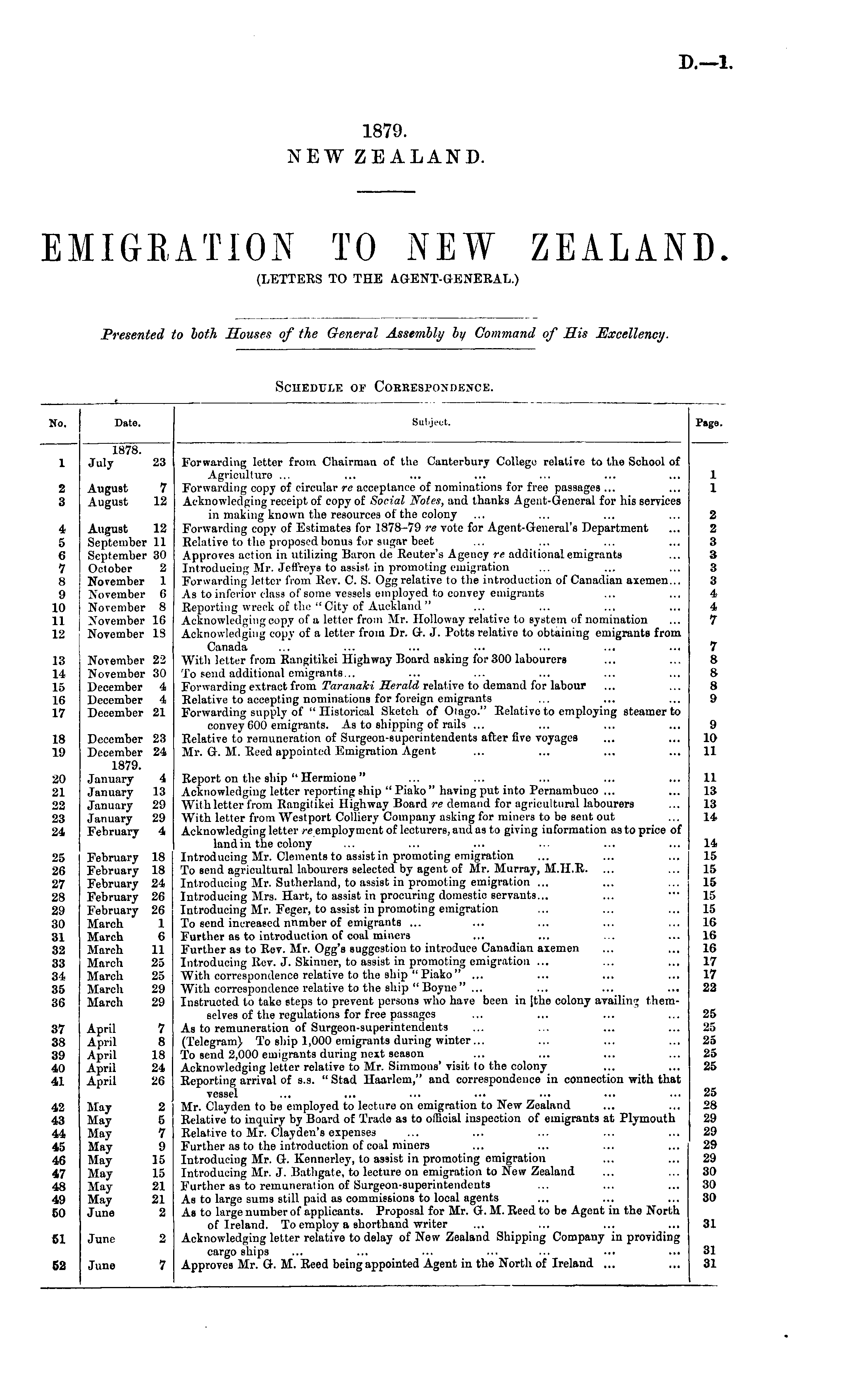 JUJI \J. NEW ZEALAND. EMIGRATION TO NEW ZEALAND. (LETTERS TO THE AGENT-GENERAL.) Presented to both Houses of the General Assembly by Command of His Excellency. Schedule of Correspondence. No. Date. Sul.jeut. Page. i 1878. July 23 Forwarding letter from Chairman of the Canterbury College relative to the School of Agriculture ... Forwarding copy of circular re acceptance of nominations for free passages ... Acknowledging receipt of copy of Social Notes, and thanks Agent-General for his services in making known the resources of the colony Forwarding copy of Estimates for 1878-79 re vote for Agent-General's Department Eelalive to the proposed bonus for sugar beet Approves action in utilizing Baron de Router's Agency re additional emigrants Introducing Mr. JeH'reys to assist in promoting emigration Forwarding letter from Rev. C. S. Ogg relative to the introduction of Canadian axemen... As to inferior class of some vessels employed to convey emigrants Reporting wreck of the " City of Auckland " Acknowledging copy of a, letter from Mr. Hollo way relative to system of nomination Acknowledging coin' of a letter from Dr. G. J. Potts relative to obtaining emigrants from Canada With letter from Rangitikei Highway Board asking for 300 labourers To send additional emigrants... Forwarding extract from Taranaki Herald relative to demand for labour Relative to accepting nominations for foreign emigrants Forwarding supply of " Historical Sketch of Olago." Relative to employing steamer to convey 600 emigrants. As to shipping of rails ... Relative to remuneration of Surgeon-superintendents after five voyages Mr. G. M. Reed appointed Emigration Agent 2 3 August 7 August 12 1 1 4 5 6 7 8 9 10 u 12 August 12 September 11 September 30 October 2 November 1 6 November 8 November 1G November IS 2 2 8 3 3 3 4 4 7 18 M L6 L6 17 November 22 November 30 December 4 December 4 December 21 7 S S 8 9 IS 19 December 23 December 24 1879. January 4 January 13 January 29 January 29 February 4 9 10 11 20 21 22 28 84 Report on the ship " Hermione " Acknowledging letter reporting ship " Piako " having put into Pernambueo ... With letter from Rangitikei Highway Board re demand for agricultural labourers With letter from Westport Colliery Company asking for miners to be sent out Acknowledging letter re employment of lecturers, and as to giving information as to price of land in the colony Introducing Mr. Clements to assist in promoting emigration To send agricultural labourers selected by agent of Mr. Murray, M.H.R. ... Introducing Mr. Sutherland, to assist in promoting emigration ... Introducing Mrs. Hart, to assist in procuring domestic servants... Introducing Mr. Feger, to assist in promoting emigration To send increased nnmber of emigrants ... Further as to introduction of coal miners Further as to Rev. Mr. Ogg's suggestion to introduce Canadian axemen Introducing Rev. J. Skinner, to assist in promoting emigration ... With correspondence relative to the ship " Piako " ... With correspondence relative to the ship " Boyne "... Instructed to tako steps to prevent persons who have been in [the colony availing themselves of the regulations for free passages As to remuneration of Surgeon-superintendents (Telegram) To ship 1,000 emigrants during winter... To send 2,000 emigrants during next season Acknowledging letter relative to Mr. Simmons' visit to the colony Reporting arrival of s.s. " Stad Haarlem," and correspondence in connection with that vessel Mr. Clayden to be employed to lecture on emigration to New Zealand Relative to inquiry by Board of Trade as to official inspection of emigrants at Plymouth Relative to Mr. Clayden's expenses Further as to the introduction of coal miners Introducing Mr. G. Kennerley, to assist in promoting emigration Introducing Mr. J. Bathgate, to lecture on emigration to New Zealand Further as to remuneration of Surgeon-superintendents As to large sums still paid as commissions to local agents As to large number of applicants. Proposal for Mr. G. M. Reed to be Agent in the North of Ireland. To employ a shorthand writer Acknowledging letter relative to delay of New Zealand Shipping Company in providing cargo ships Approves Mr. G. M. Reed being appointed Agent in the North of Ireland ... 11 18 18 14 SB M 27 2S 21) 80 81 32 88 31 88 86 February 18 February 18 February 24 February 26 February 26 March 1 March 6 March 11 March 25 March 25 March 29 March 29 14 ir> 15 15 i:> 15 IB 16 16 17 17 2a 87 3S 39 40 41 April 7 April 8 April 18 April 24 April 26 25 25 25 25 25 42 48 M 45 ■1G 47 ■1S 49 50 May 2 May 5 May 7 May 9 May 15 May 15 May 21 May 21 June 2 25 28 » 2f> 29 30 80 30 31 51 June 2 31 ai 52 June 7