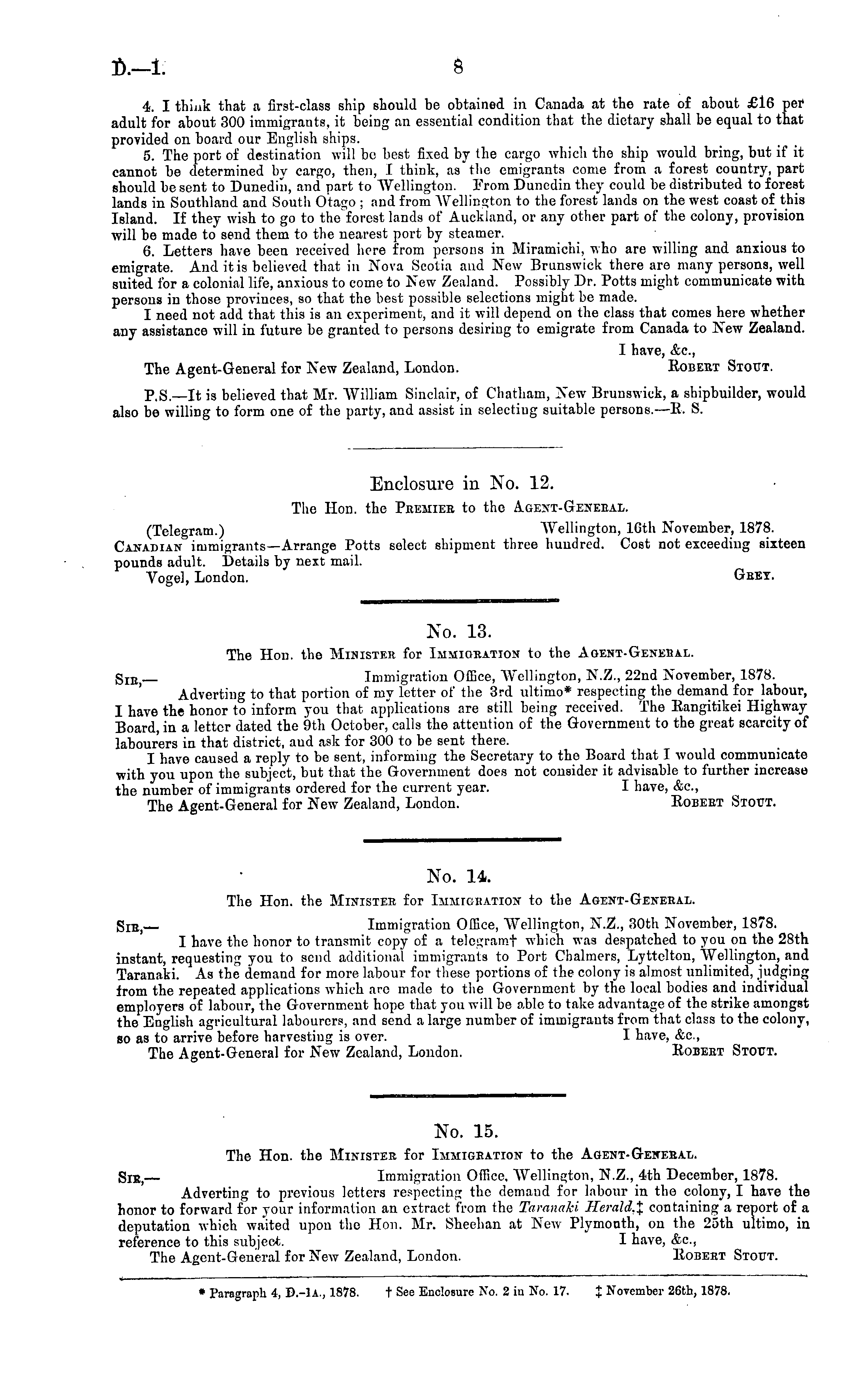 No. 13. The Hon. the Ministee for Immioeation to the Agent-Geneeal. Shi, Immigration Office, AA'ellington, N.Z., 22nd November, 1878. Adverting to that portion of my letter of the 3rd ultimo* respecting the demand for labour, I have the honor to inform you that applications are still being received. The Rangitikei Highway Board, in a letter dated the 9th October, calls the attention of the Government to the great scarcity of labourers in that district, aud ask for 300 to be sent there. I have caused a reply to be sent, informing the Secretary to the Board that I would communicate with you upon the subject, but that the Government does not consider it advisable to further increase the number of immigrants ordered for the current year. I have, &c, The Agent-General for New Zealand, London. Robeet Stout.