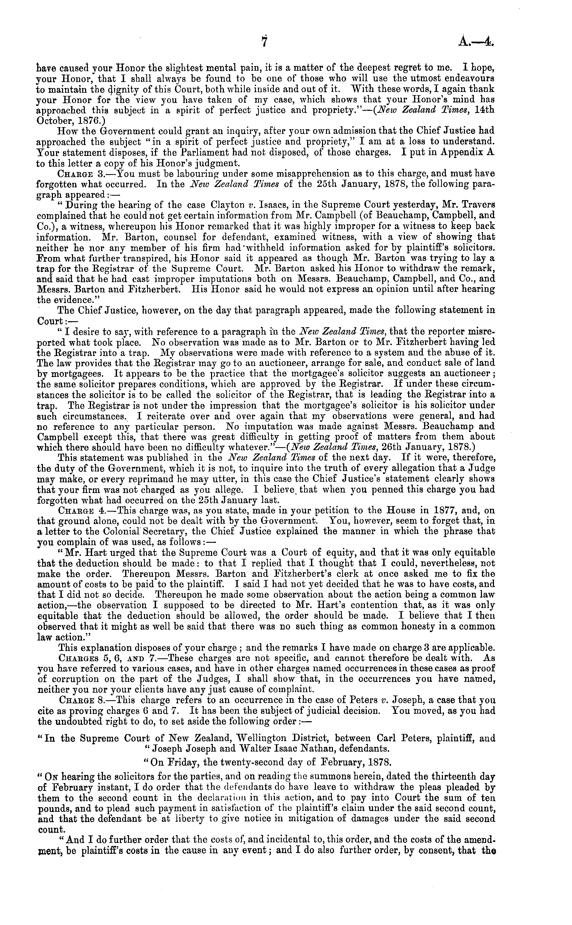 have caused your Honor the slightest mental pain, it is a matter of the deepest regret to me. I hope, vour Honor, that I shall always be found to be one of those who will use the utmost endeavours to maintain the dignity of this Court, both while inside and out of it. "With these words, I again thank your Honor for the view you have taken of my case, which shows that your Honor's mind has approached this subject in a spirit of perfect justice and propriety." — {New Zealand Times, 14th October, 187C.) How the Government could grant an inquiry, after your own admission that the Chief Justice had approached the subject "in a spirit of perfect justice and propriety," I am at a loss to understand. Tour statement disposes, if the Parliament had not disposed, of those charges. I put in Appendix A to this letter a copy of his Honor's judgment. Chabge 3. —You must be labouring under some misapprehension as to this charge, and must have forgotten what occurred. In the New Zealand Times of the 25th January, 1878, the following paragraph appeared: — " During the hearing of the case Clayton v. Isaacs, in the Supreme Court yesterday, Mr. Travera complained that he could not get certain information from Mr. Campbell (of Beauchamp, Campbell, and Co.), a witness, whereupon his Honor remarked that it was highly improper for a witness to keep back information. Mr. Barton, counsel for defendant, examined witness, with a view of showing that neither he nor any member of his firm had'withheld information asked for by plaintiff's solicitors. From what further transpired, his Honor said it appeared as though Mr. Barton was trying to lay a trap for the Eegistrar of the Supreme Court. Mr. Barton asked his Honor to withdraw the remark, and said that he had cast improper imputations both on Messrs. Beauchamp, Campbell, and Co., and Messrs. Barton and Fitzherbert. His Honor said he would not express an opinion until after hearing the evidence." The Chief Justice, however, on the day that paragraph appeared, made the following statement in Court: — " I desire to say, with reference to a paragraph in the New Zealand Times, that the reporter misreported what took place. No observation was made as to Mr. Barton or to Mr. Fitzherbert having led the Registrar into a trap. Mv observations were made with reference to a system and the abuse of it. The law provides that the Eegistrar may go to an auctioneer, arrange for sale, and conduct sale of land by mortgagees. It appears to be the practice that the mortgagee's solicitor suggests an auctioneer; the same solicitor prepares conditions, which are approved by the Eegistrar. If under these circumstances the solicitor is to be called the solicitor of the Eegistrar, that is leading the Eegistrar into a trap. The Eegistrar is not under the impression that the mortgagee's solicitor is his solicitor under such circumstances. I reiterate over and over again that my observations were general, and had no reference to any particular person. No imputation was made against Messrs. Beauchamp and Campbell except this, that there was great difficulty in getting proof of matters from them about which there should have been no difficulty whatever." — {New Zealand Times, 26th January, 1878.) This statement was published in the New Zealand Times of the next day. If it were, therefore, the duty of the Government, which it is not, to inquire into the truth of every allegation that a Judge may make, or every reprimand he may utter, in this case the Chief Justice's statement clearly shows that your firm was not charged as you allege. I believe, that when you penned this charge you had forgotten what had occurred on the 25th January last. Chaege 4. —This charge was, as you state, made in your petition to the House in 1877, and, on that ground alone, could not be dealt with by the Grovernment. You, however, seem to forget that, in a letter to the Colonial Secretary, the Chief Justice explained the manner in which the phrase that you complain of was used, as follows: — " Mr. Hart urged that the Supreme Court was a Court of equity, and that it was only equitable that the deduction should be made: to that I replied that I thought that I could, nevertheless, not make the order. Thereupon Messrs. Barton and Fitzherbert's clerk at once asked me to fix the amount of costs to be paid to the plaintiff'. I said I had not yet decided that he was to have costs, and that I did not so decide. Thereupon he made some observation about the action being a common law action, —the observation I supposed to be directed to Mr. Hart's contention that, as it was only equitable that the deduction should be allowed, the order should be made. I believe that I then observed that it might as well be said that there was no such thing as common honesty in a common law action." This explanation disposes of your charge ; and the remarks I have made on charge 3 are applicable. Chaeges 5, G, and 7. —These charges are not specific, and cannot therefore be dealt with. As you have referred to various cases, and have in other charges named occurrences in these cases as proof of corruption on the part of the Judges, I shall show that, in the occurrences you have named, neither you nor your clients have any just cause of complaint. Chaege 8. —This charge refers to an occurrence in the case of Peters p. Joseph, a case that you cite as proving charges 6 and 7. It has been the subject of judicial decision. You moved, as you had the undoubted right to do, to set aside the following order : —■ "In the Supreme Court of New Zealand, "Wellington District, between Carl Peters, plaintiff, and " Joseph Joseph and Walter Isaac Nathan, defendants. " On Friday, the twenty-second day of February, 1878. " On hearing the solicitors for the parties, and on reading the summons herein, dated the thirteenth day of February instant, I do order that the defendants do have leave to withdraw the pleas pleaded by them to the second count in t