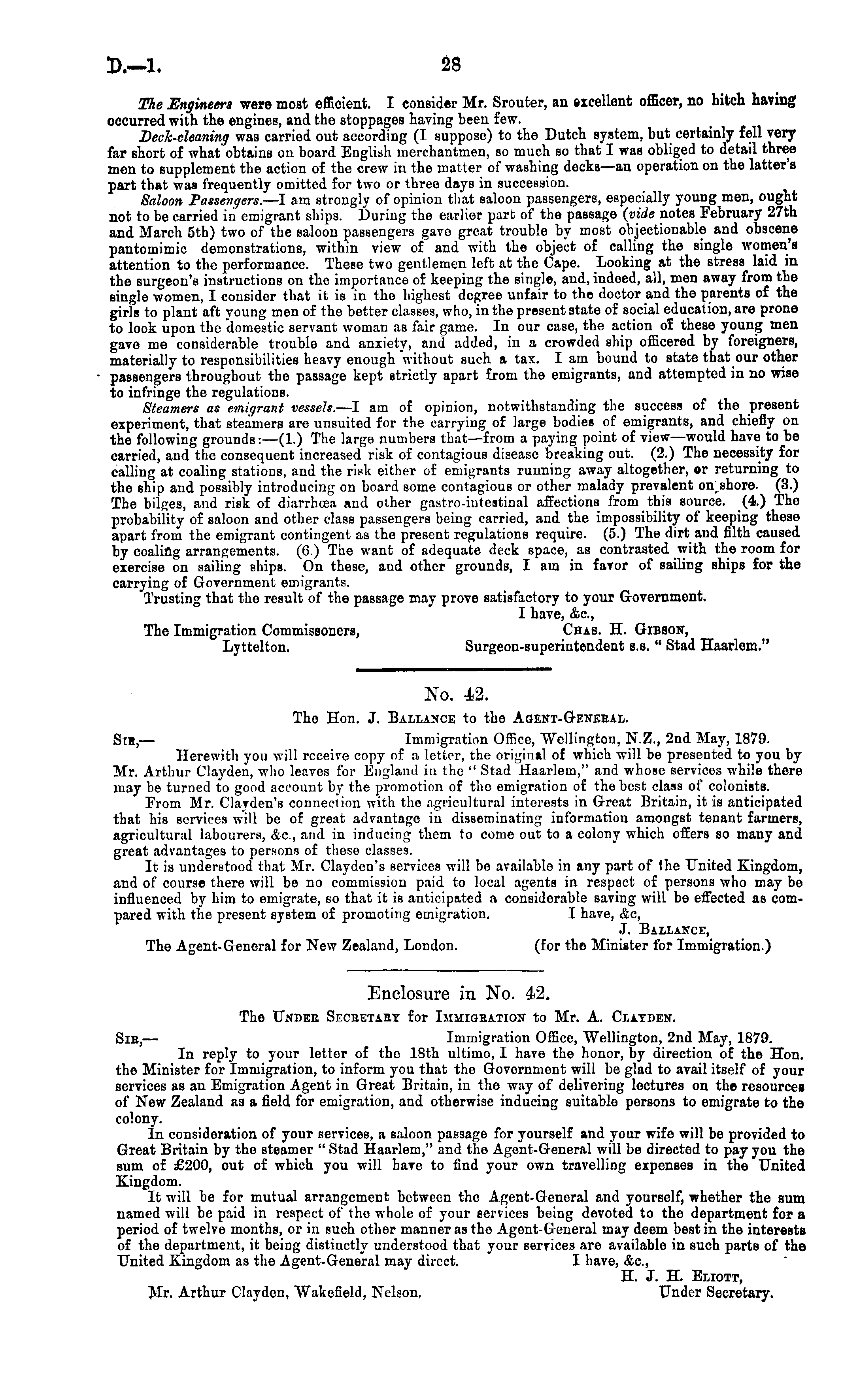Enclosure in No. 42. The Undee Seceetaby for Immigration to Mr. A. Clayden. Sic, — Immigration Office, Wellington, 2nd May, 1879. In reply to your letter of the 18th ultimo, I have the honor, by direction of the Hon. the Minister for Immigration, to inform you that the Government will be glad to avail itself of your services as an Emigration Agent in Great Britain, in the way of delivering lectures on the resources of New Zealand as a field for emigration, and otherwise inducing suitable persons to emigrate to the colony. In consideration of your services, a saloon passage for yourself and your wife will be provided to Great Britain by tho steamer " Stad Haarlem," and the Agent-General will be directed to pay you the sum of £200, out of which you will hare to find your own travelling expenses in the United Kingdom. It will be for mutual arrangement between the Agent-General and yourself, whether the sum named will be paid in respect of tho whole of your services being devoted to the department for a period of twelve months, or in such other manner as the Agent-General may deem best in the interests of the department, it being distinctly understood that your services are available in such parts of the United Kingdom as the Agent-General may direct. I have, &c, H. J. H. Eliott, Mr. Arthur Claydcu, AVakefield, Nelson, Under Secretary.