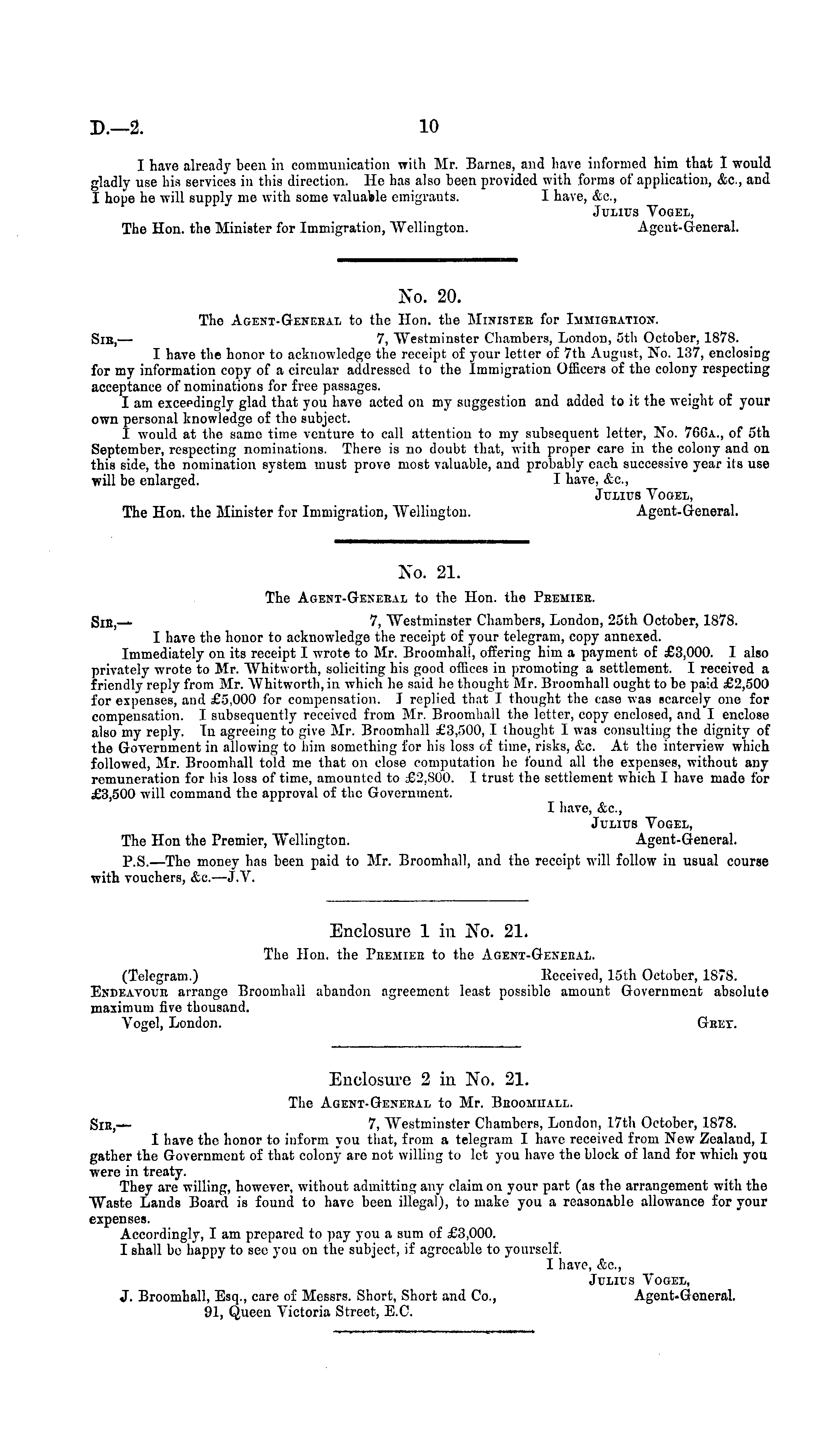 Enclosure 2 in No. 21. The Agent-Genekal to Mr. Beoomiiall. Sin,-— 7, "Westminster Chambers, London, 17th October, 1878. I have the honor to inform you that, from a telegram I have received from New Zealand, I gather the Government of that colony are not willing to let you have the block of land for which you were in treaty. They are -willing, however, without admitting any claim on your part (as the arrangement with the "Waste Lands Board is found to have been illegal), to make you a reasonable allowance for your expenses. Accordingly, I am prepared to pay you a sum of £3,000. I shall be happy to see you on the subject, if agreeable to yourself. I have, &c, Julius Vogel, J. Broomhall, Esq., care of Messrs. Short, Short and Co., Agent-General. 91, Queen Victoria Street, E.G.