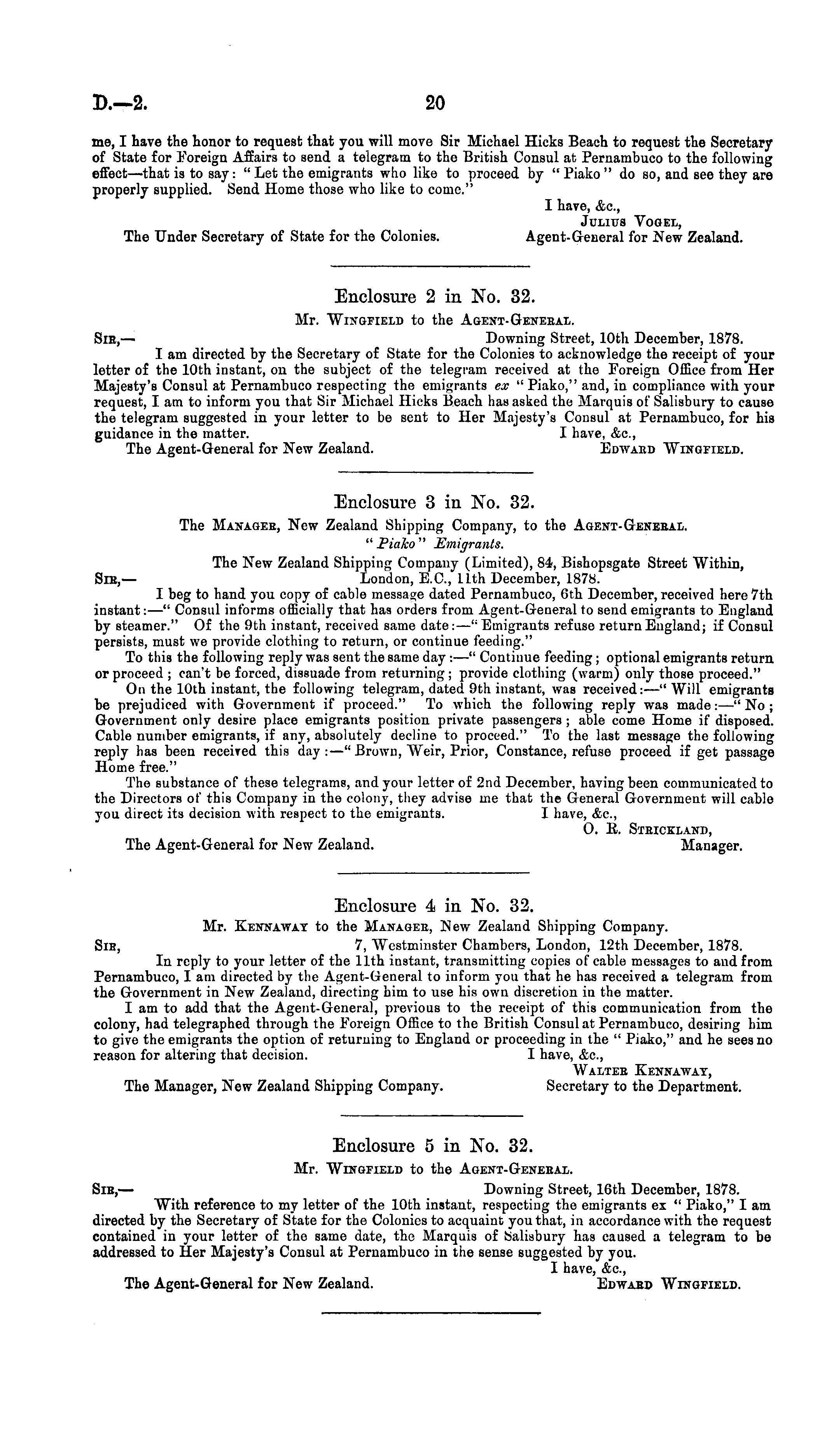 Enclosure 3 in No. 32. The Manager, New Zealand Shipping Company, to the Agent-General. " Bioko " Emigrants. The New Zealand Shipping Company (Limited), 84, Bishopsgate Street Within, Sib,— London, E.C., LLth December, 1878. I beg to hand you copy of cable message dated Pernambuco, 6th December, received hero 7th instant:—" Consul informs officially that has orders from Agent-General to send emigrants to England by steamer." Of the 9th instant, received same date:—"Emigrants refuse return England; if Consul persists, must we provide clothing to return, or continue feeding." To this the following reply was sent the same day : —" Continue feeding ; optional emigrants return, or proceed ; can't be forced, disßuade from returning; provide clothing (warm) only those proceed." On the 10th instant, the following telegram, dated 9th instant, was received: —" Will emigrants be prejudiced with Government if proceed." To which the following reply was made: —" No ; Government only desire place emigrants position private passengers ; able come Home if disposed. Cable number emigrants, if any, absolutely decline to proceed." To the last message the following reply has been receired this day: —" Brown, Weir, Prior, Constance, refuse proceed if get passage Home free." The substance of these telegrams, and your letter of 2nd December, having been communicated to the Directors of this Company in the colony, they advise me that the General Government will cable you direct its decision with respect to the emigrants. I have, <&c, 0. K. Strickland, The Agent-General for New Zealand. Manager.